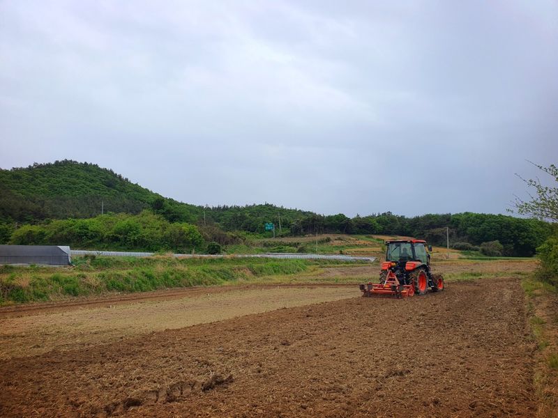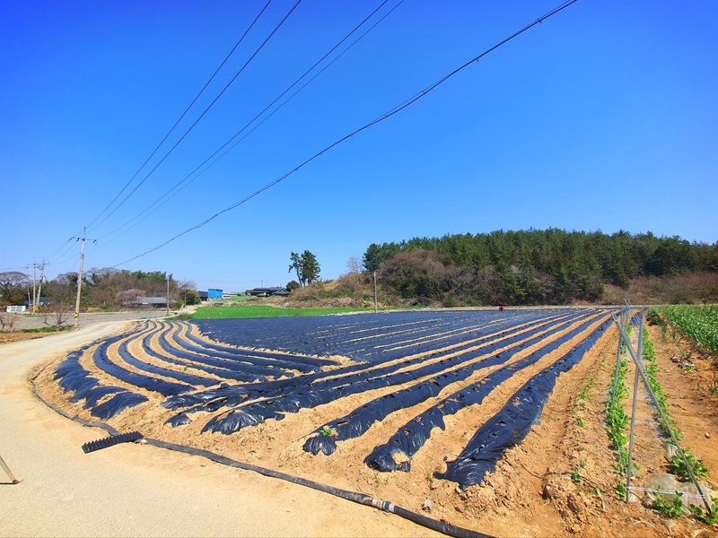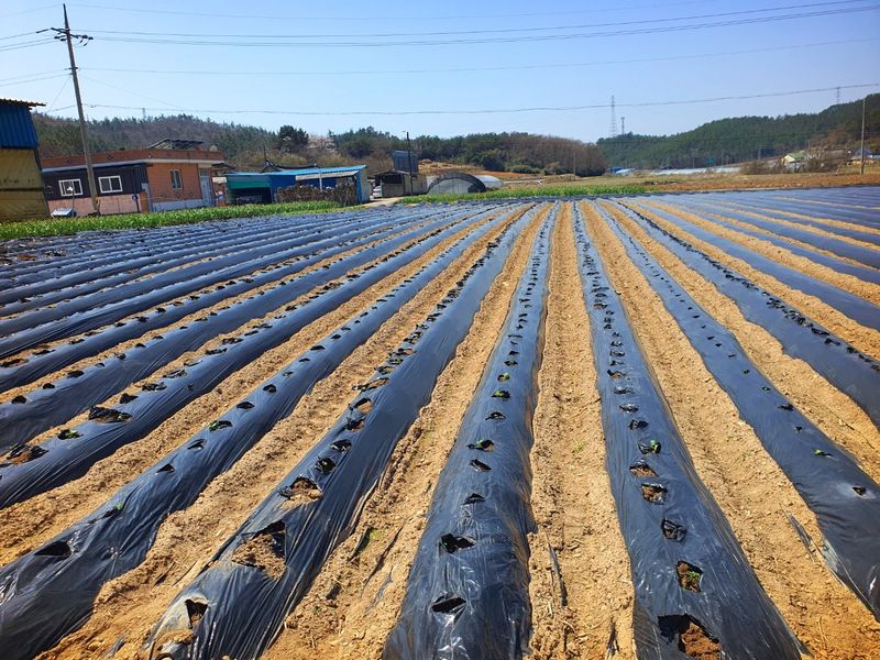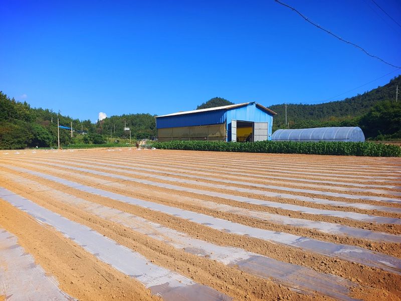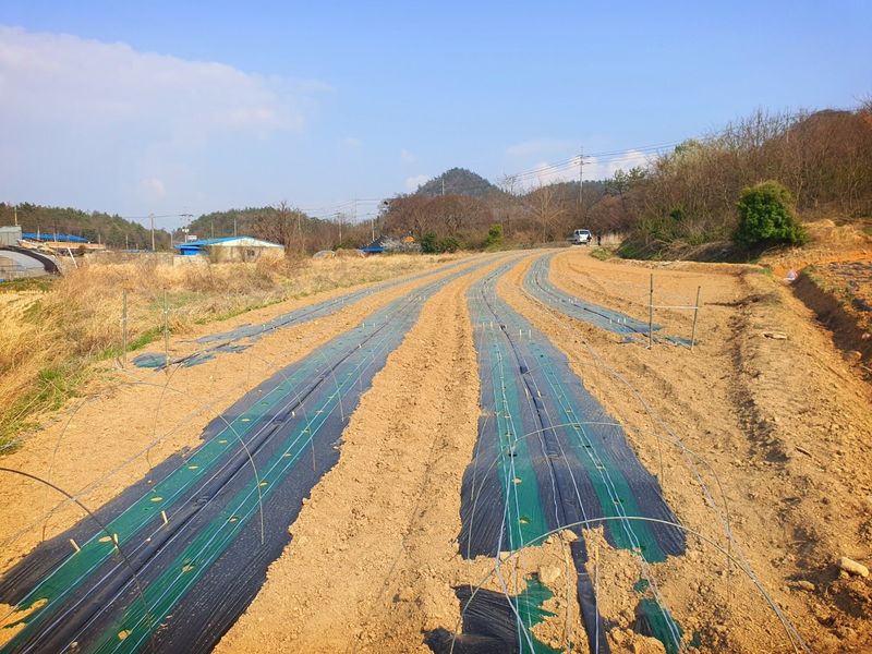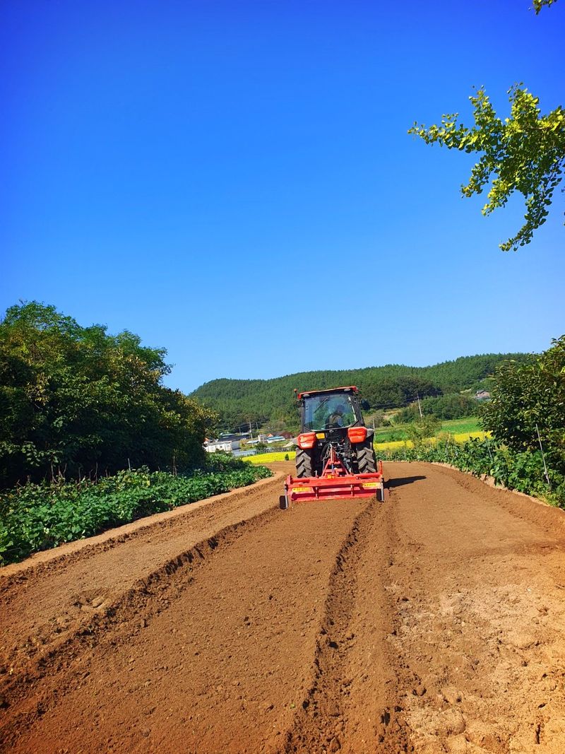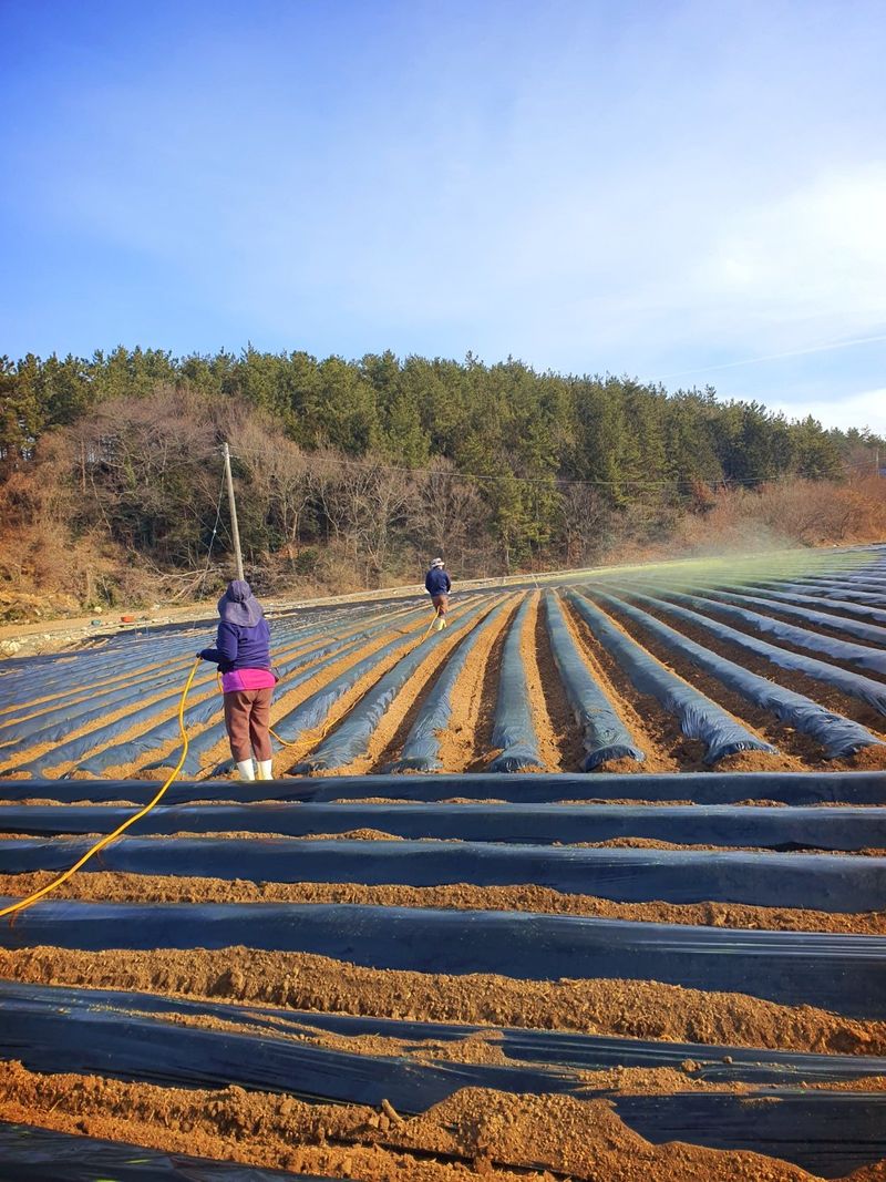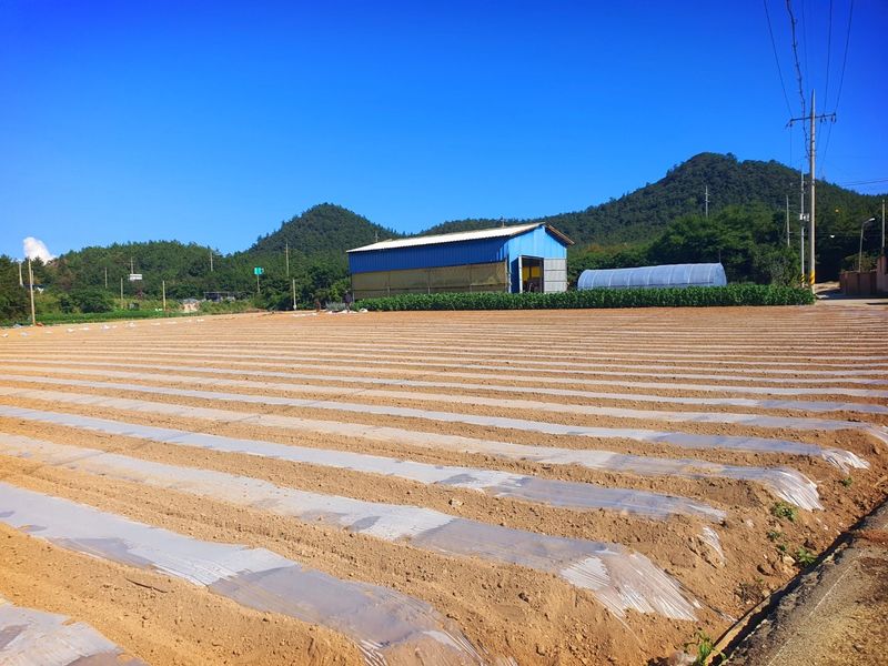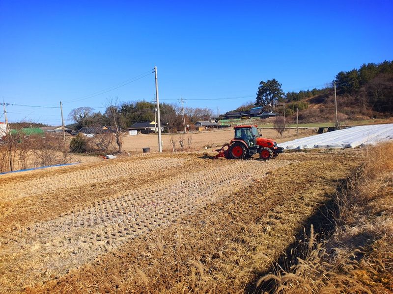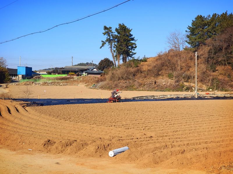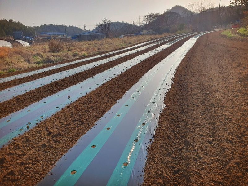 퇴비뿌리고 퇴비와 석회를 밭 전면에 골고루 뿌린 다음 깊이 갈고 복합비 료 및 토양 살충제를 고루 뿌리고 땅을 고른다 트랙터로 두둑 만들고 했습니다 마늘 밭 비닐 멀칭 작업 완료 했습니다