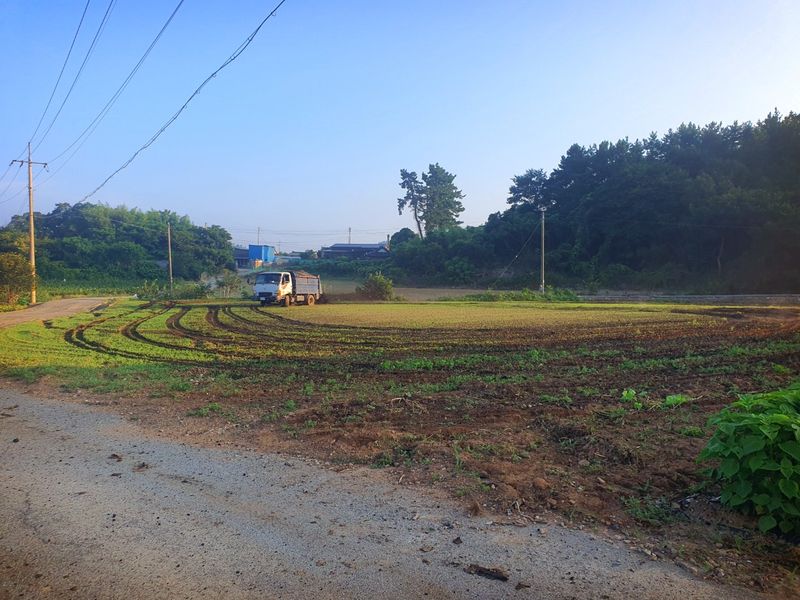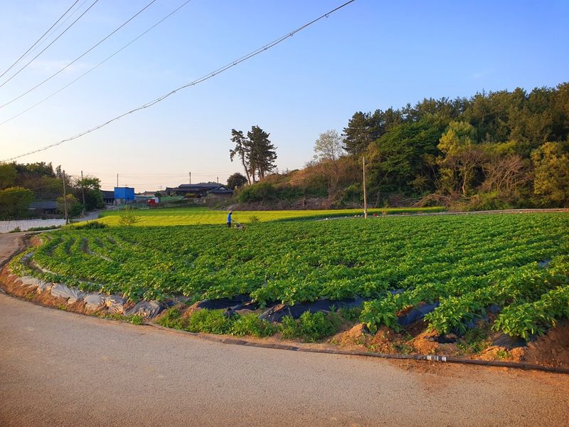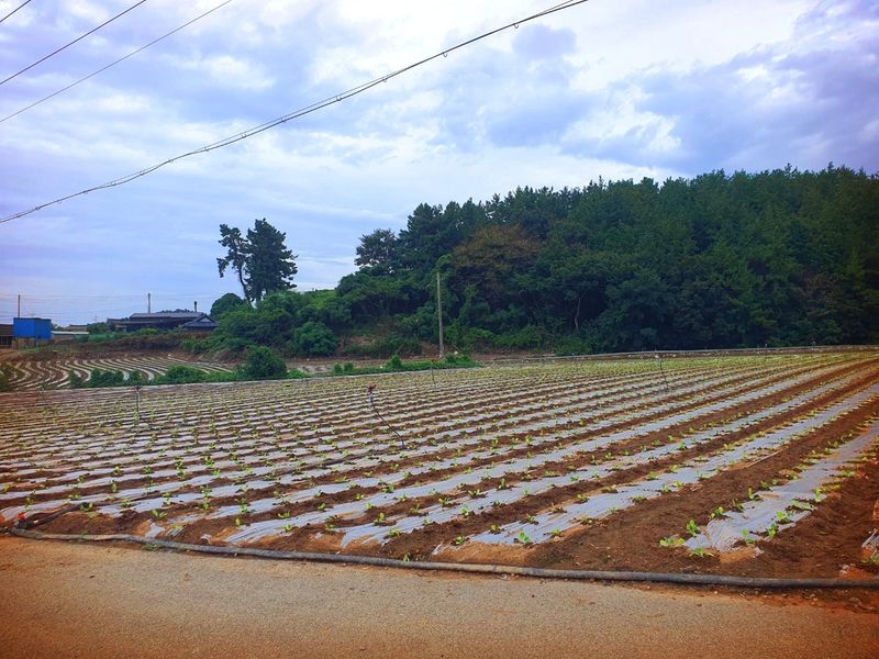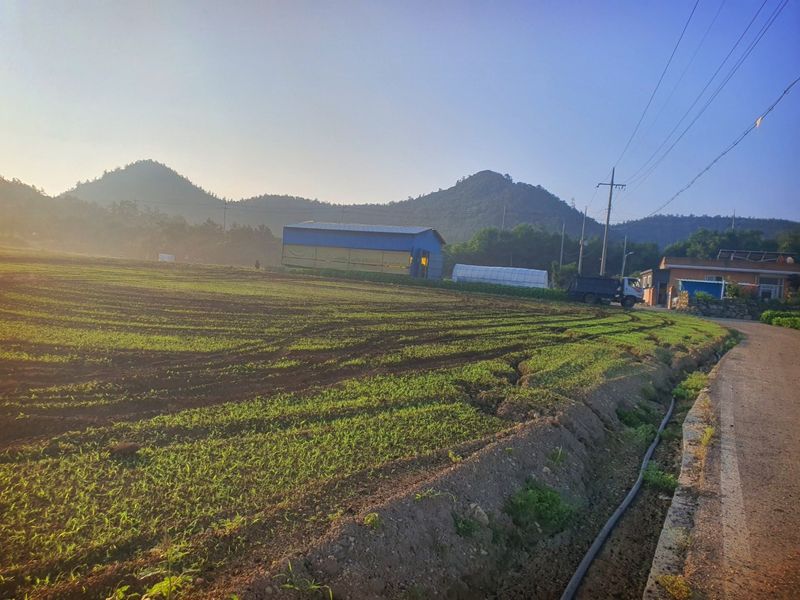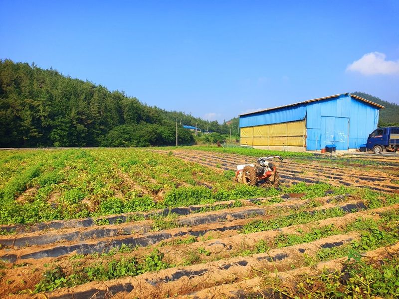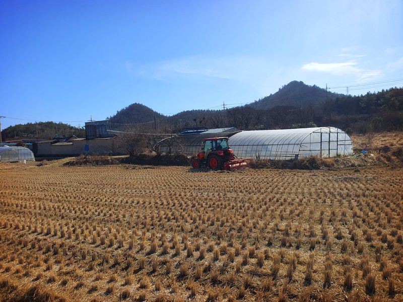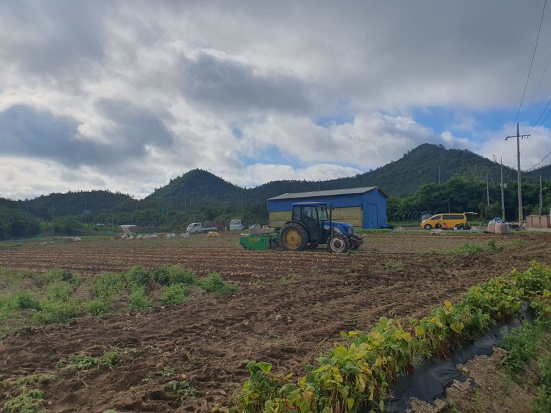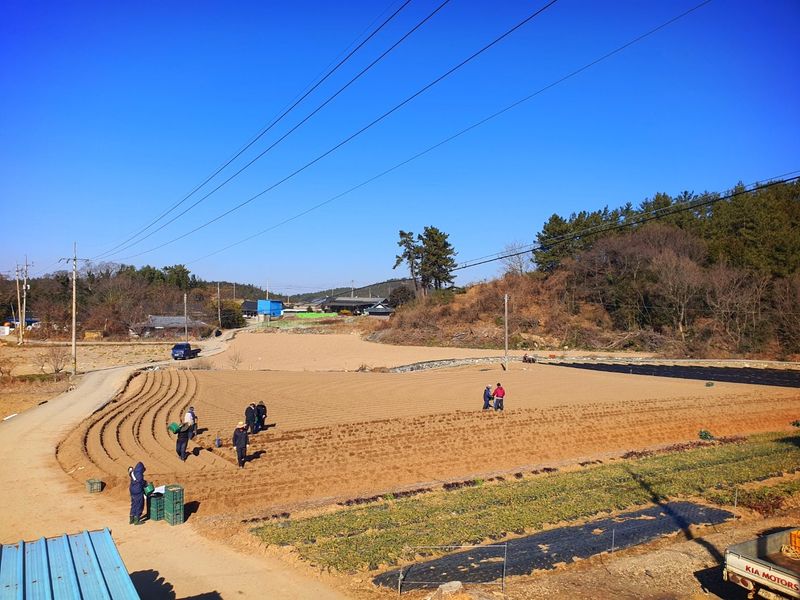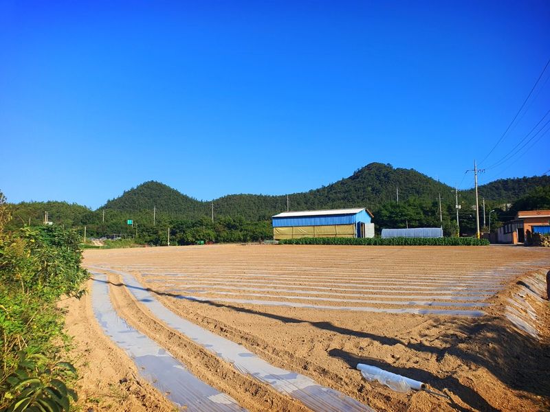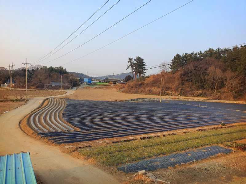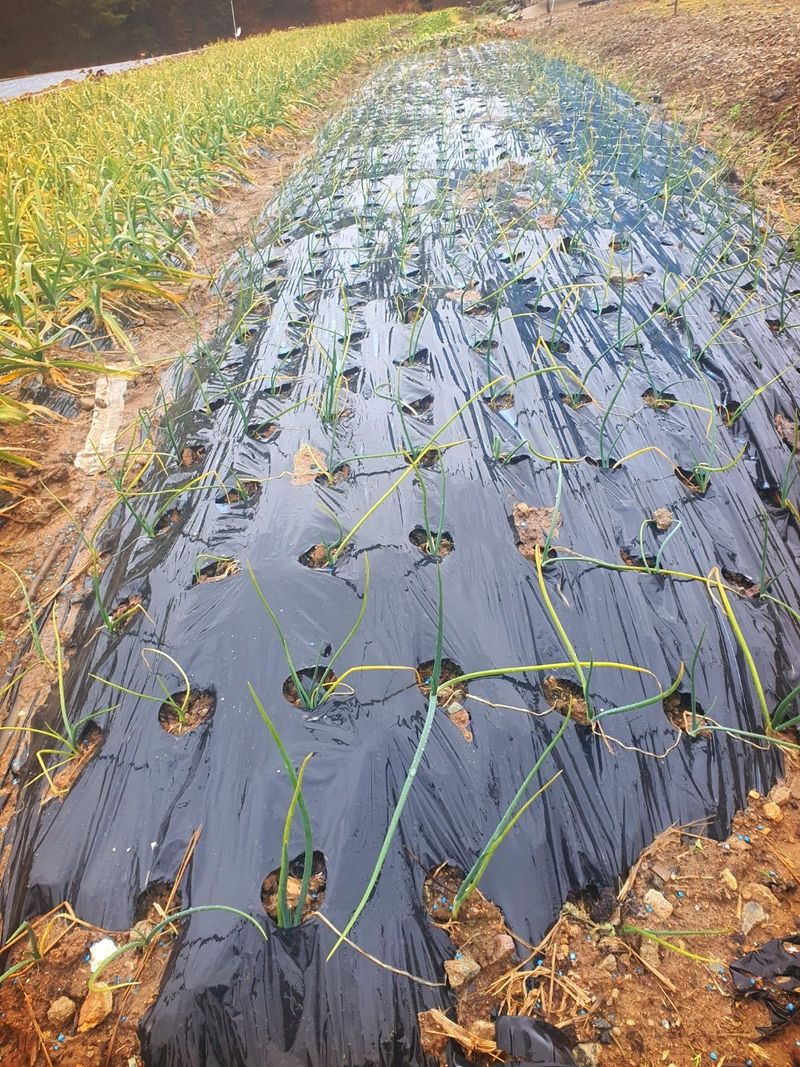 퇴비뿌리고 퇴비와 석회를 밭 전면에 골고루 뿌린 다음 깊이 갈고 복합비 료 및 토양 살충제를 고루 뿌리고 땅을 고른다 트랙터로 두둑 만들고 했습니다 마늘 밭 비닐 멀칭 작업 완료 했습니다