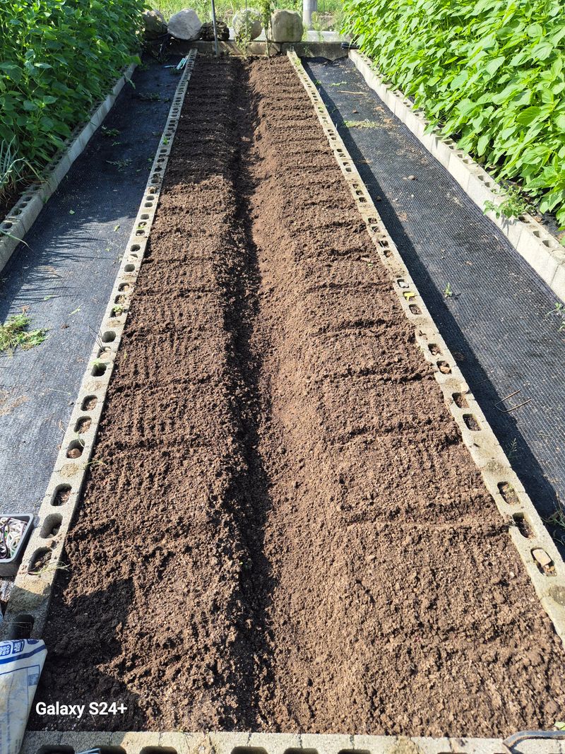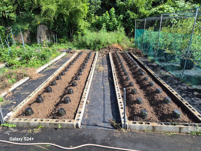 품종: 청명가을왕 모종 🌱구입: 불국농협자재마트 100포기 모종정식 및 무우 씨앗파종 후 강열한 햇빛차단용 꼬깔쉬우기 및 그늘막 설치 완료.