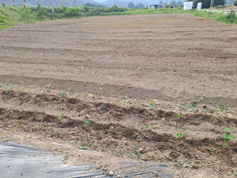 어제 비오고 오늘 강원도찰옥수수수씨 인산 농장에 세고랑 파종함.