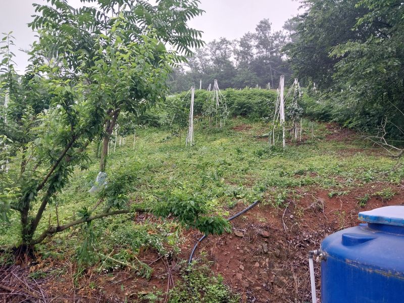 산 포도농장 물주기하고 2년생 사과 세그루.체리 세그루 감나무 밭 짜투리에 심은것 가지 양쪽으로 눞혀 두가지만 키우기 위해 파이프 말둑 밖고 벌 조금 하는것 사양 하였답니다