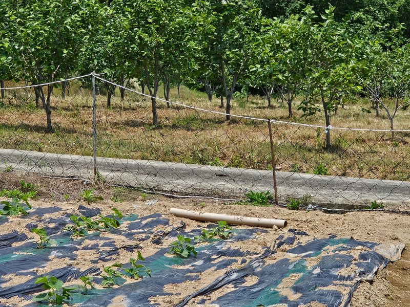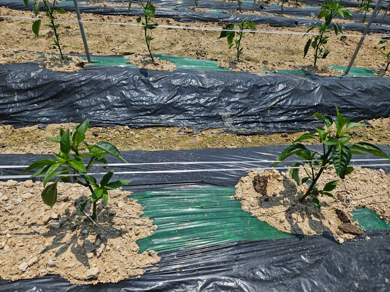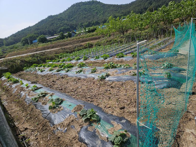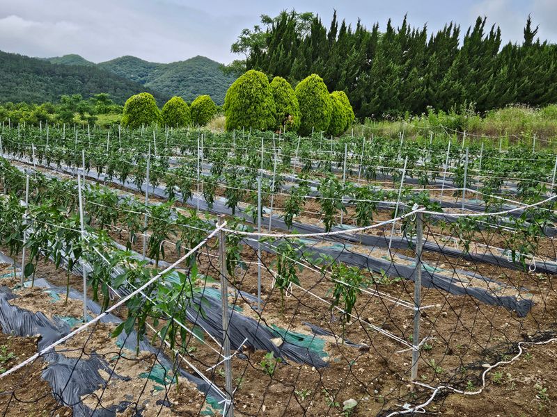 고추밭 두럭 완전히 돌려 그물치고 있는데 부족 더 주문했어 해야겠네요 고라니가 고추 위쪽잎 다따먹음