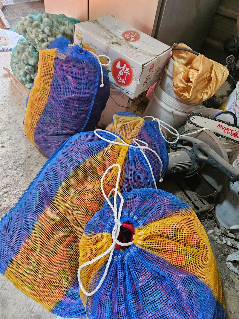 오전중 으로 고추 다따기 인력둘분 대리고 땀 미리서 좀 따서 오전중에 다땀 집에와서 꼭지 제거하고 세가지분류 했어 꼭지땀