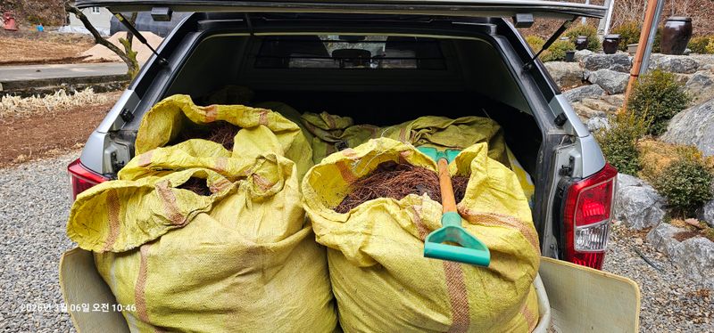 산으로 출장 산길옆 부엽토 차끌고 올라가 수거하여 마대자루에 담아 7포대에 담아 가져옴 무멀칭 마늘밭골에 3포대 깔아주고 주아심은곳은 비닐 벗기면 작업하려함.