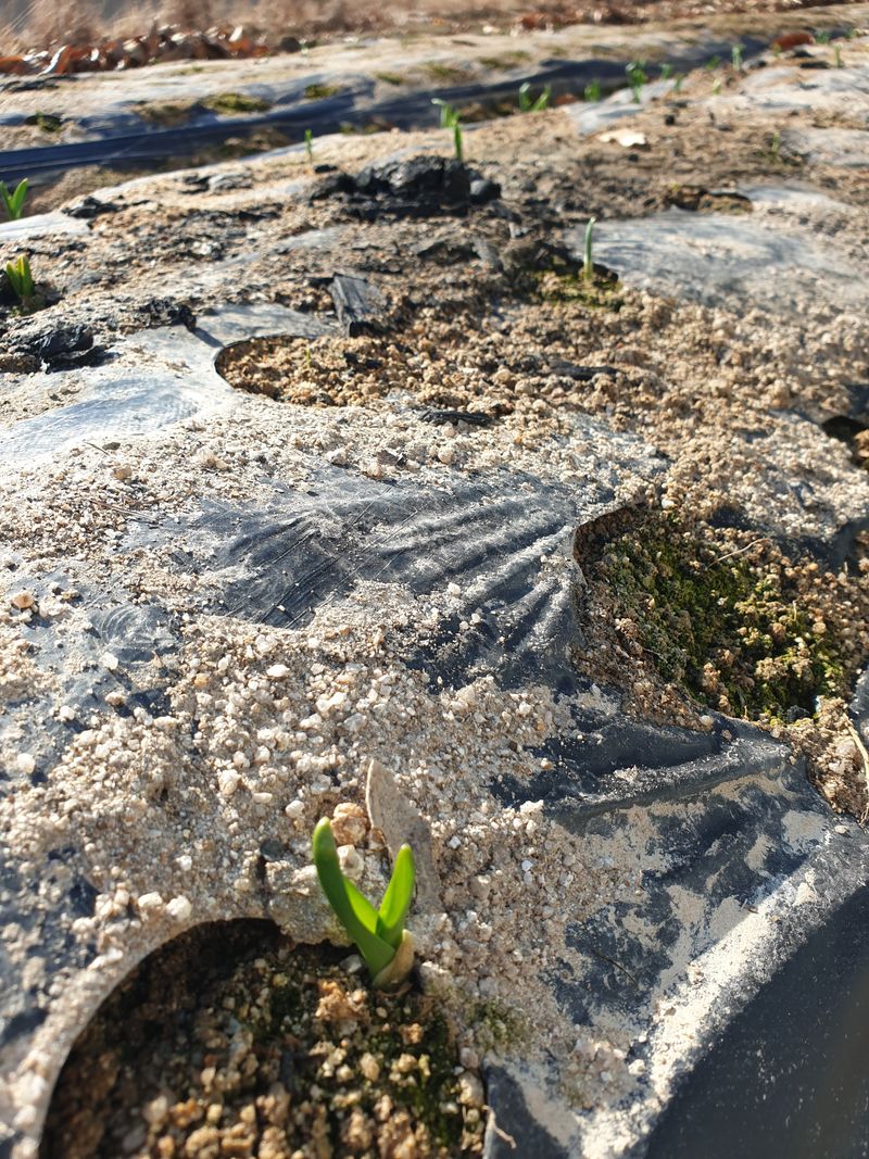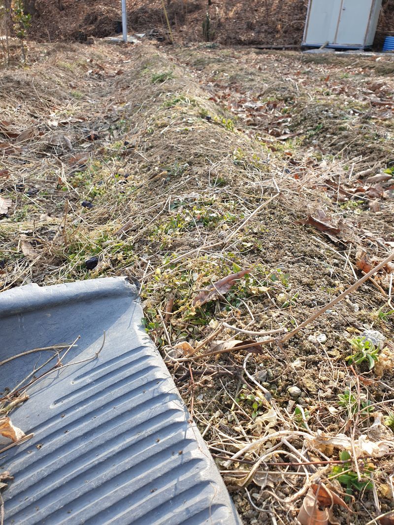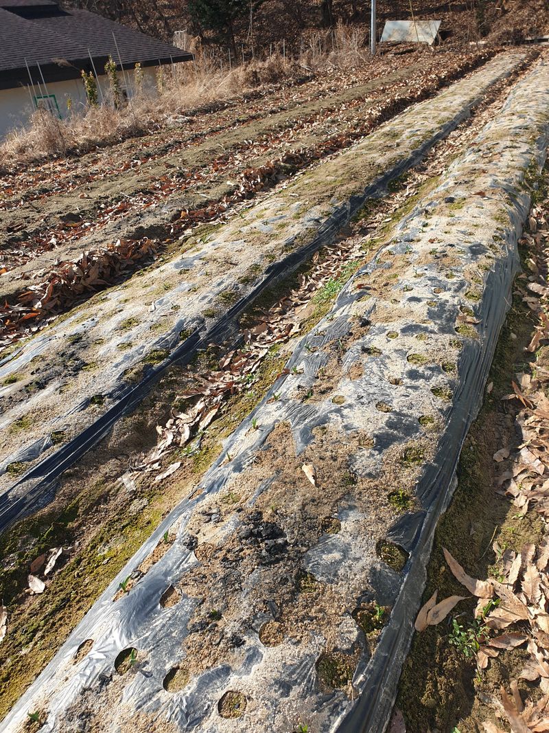 마늘밭 낙엽 걷어내고 토양살충제, 요소랑 복합비료 살포하였어요 단양마늘 싹은 아직인데, 홍산마늘 싹은 많이 올라왔네요~ 봄비에 잘 자라주길 바랍니다