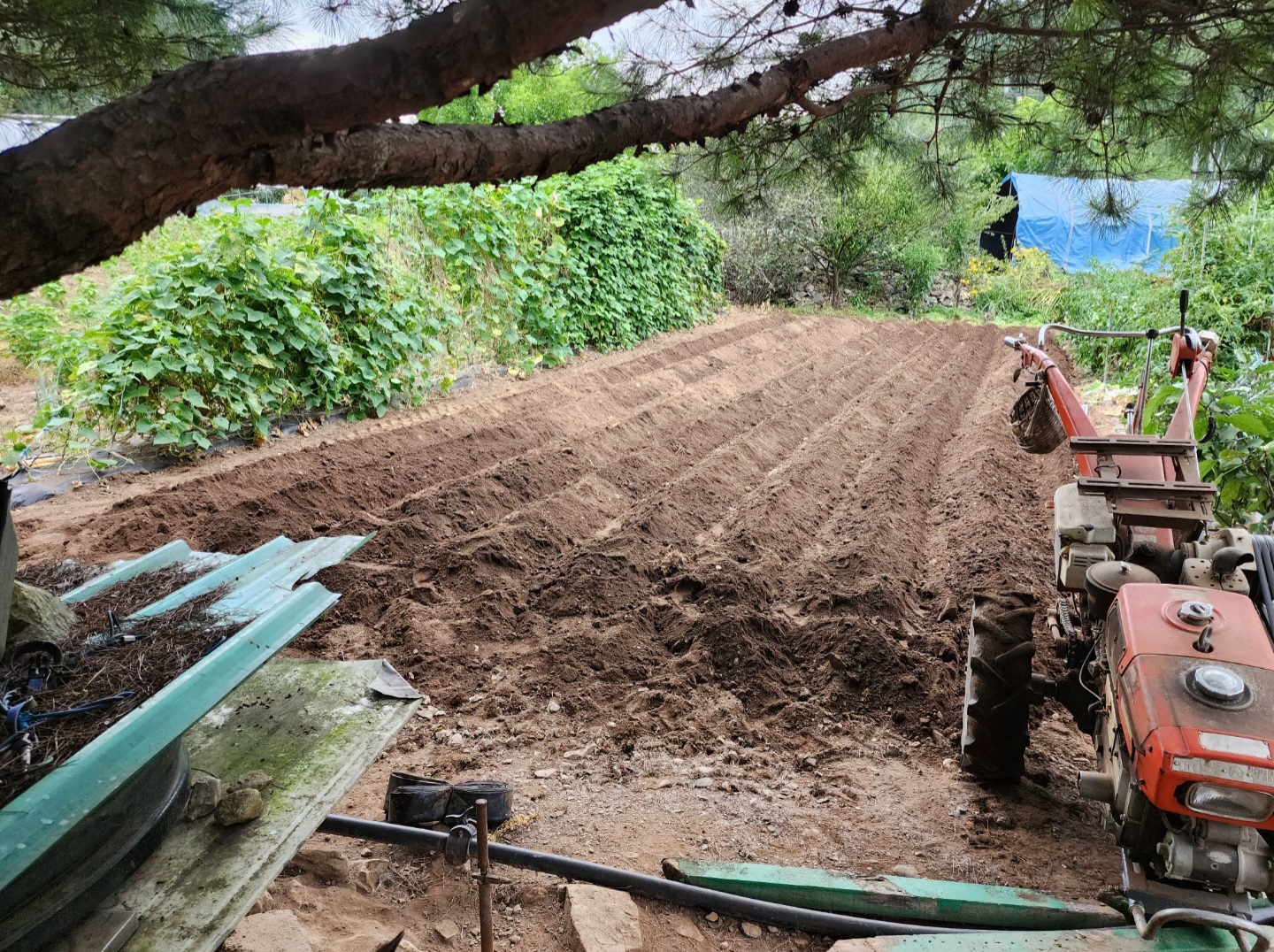 230809-김장밭갈음,오늘밤10시부터 태풍비예보,내일,모레까지 비오니 무씨파종은 비그친다음 엄마가 심기 -고추비료+석회고토+스퍽반뿌리고 갈고 반뿌리고 평탄작업후 정식갈음