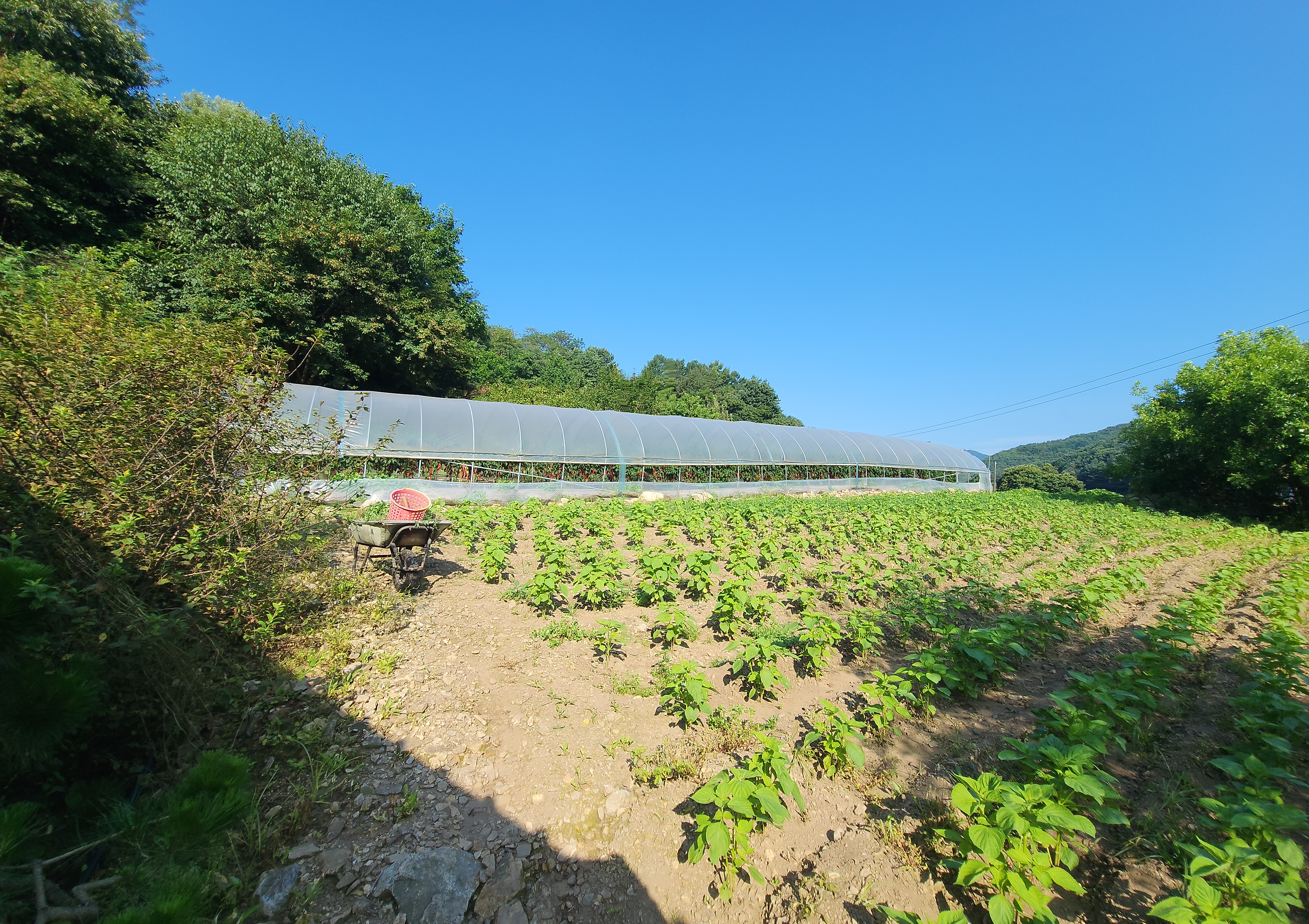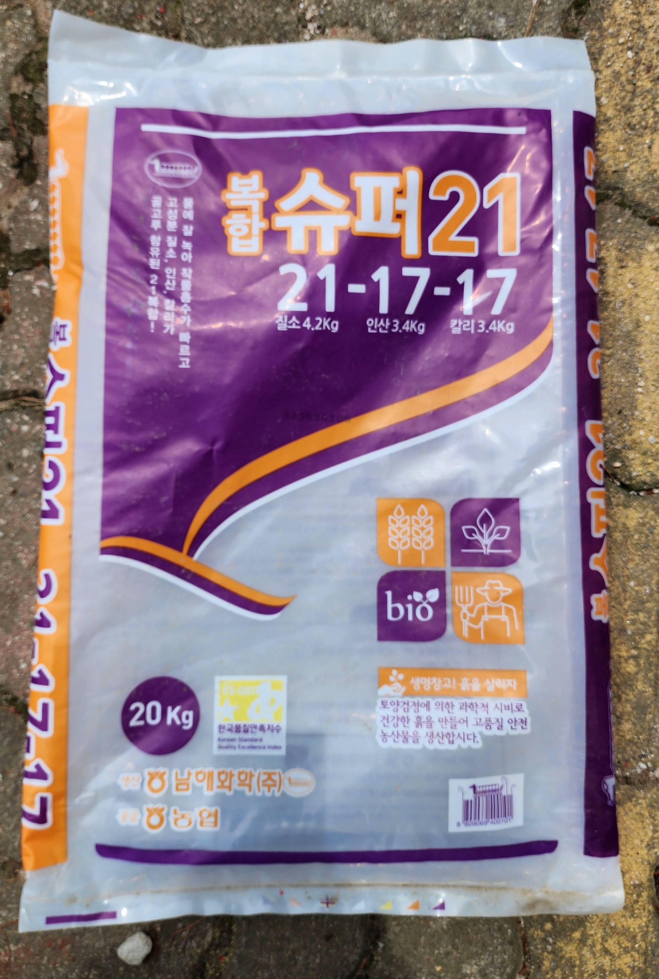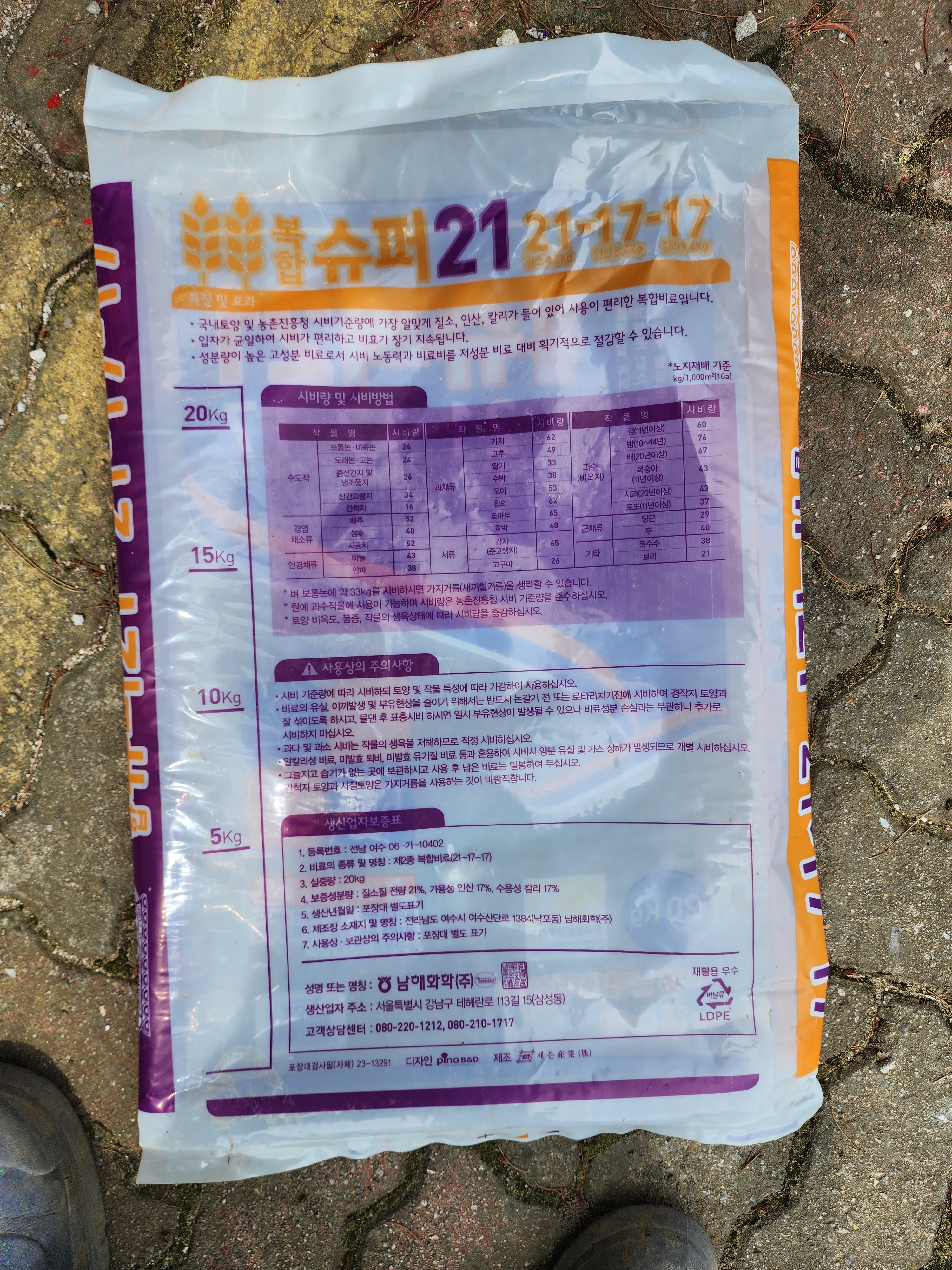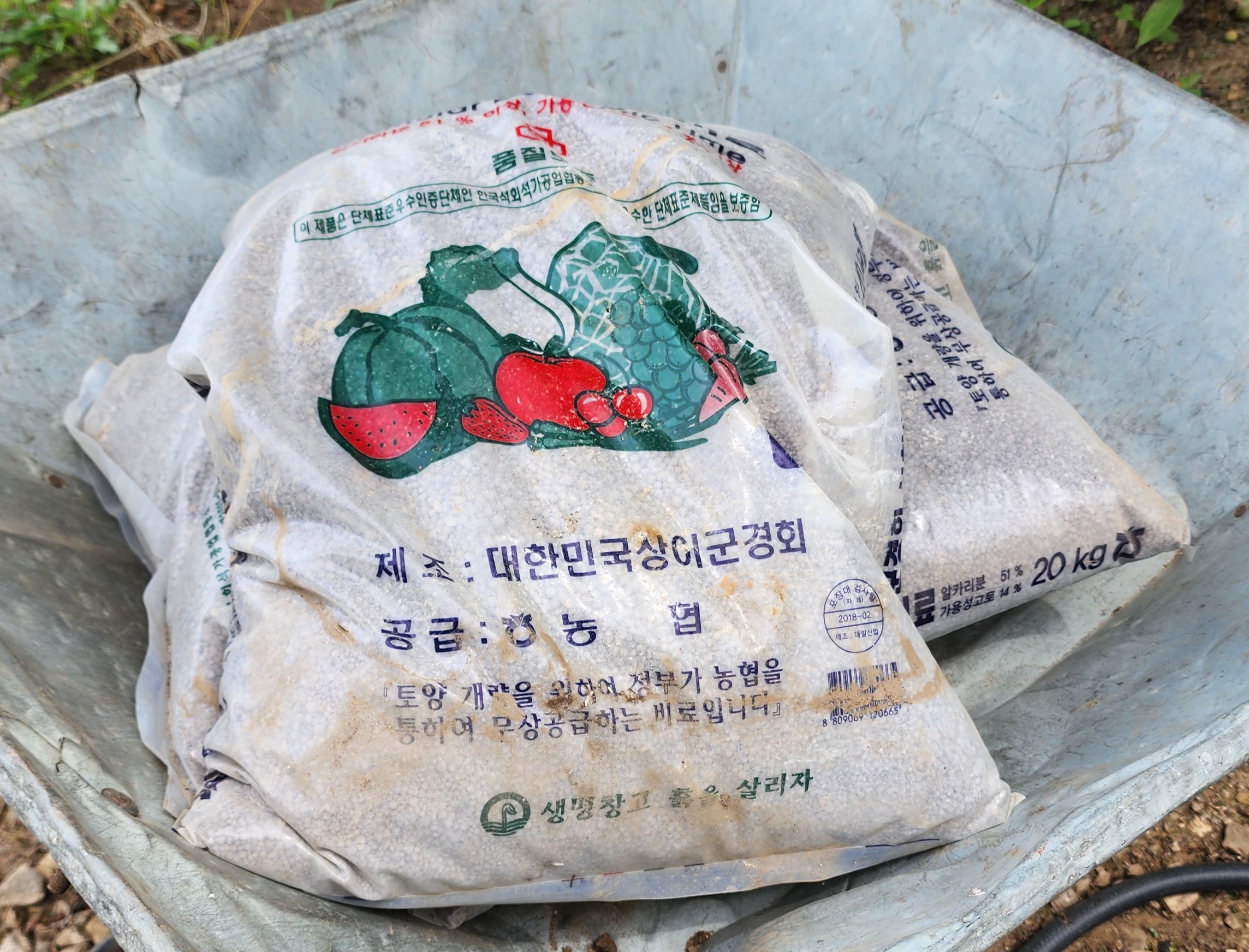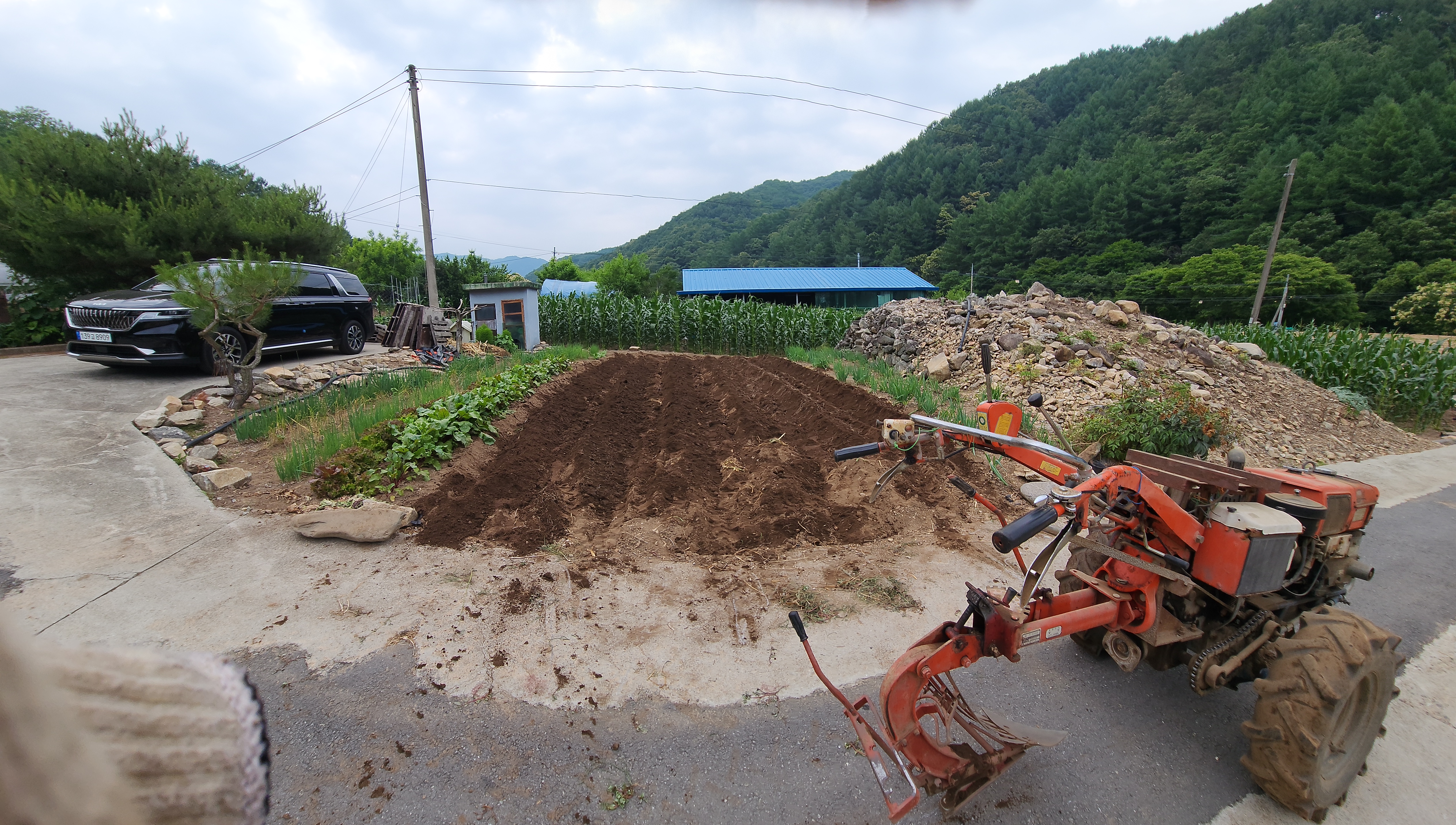 230618(일)-들깨밭 비료살포 1.하우스위,아래,장독대옆: 석회고토3포+복합3포+스퍽(토양살충제)4kg 2.경운작업시작: -하우스위 완료 -하우스아래 50%완료