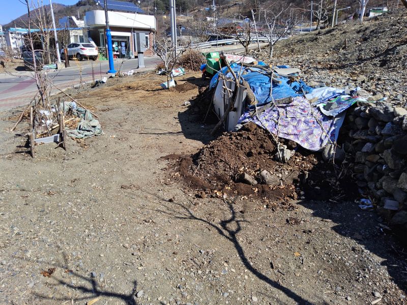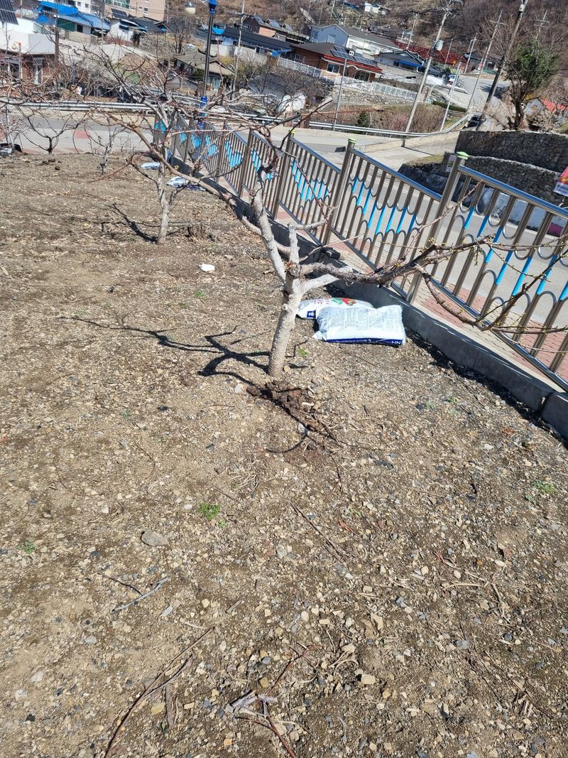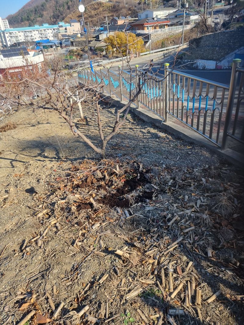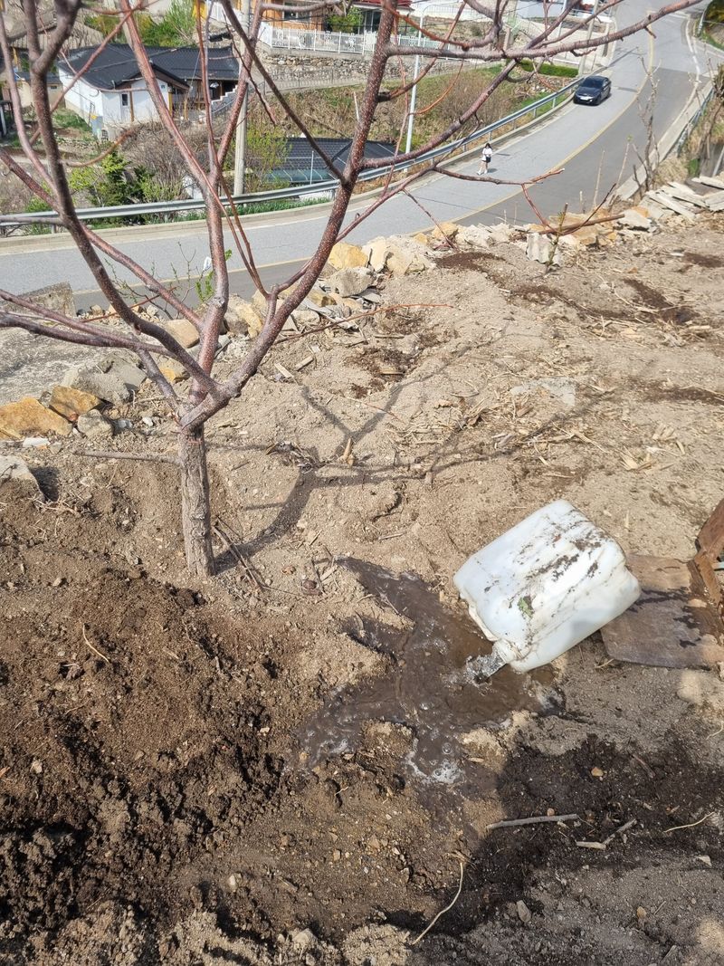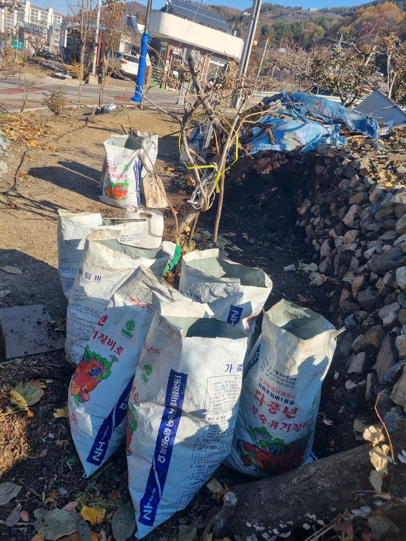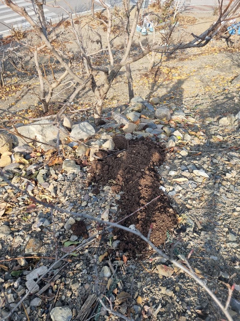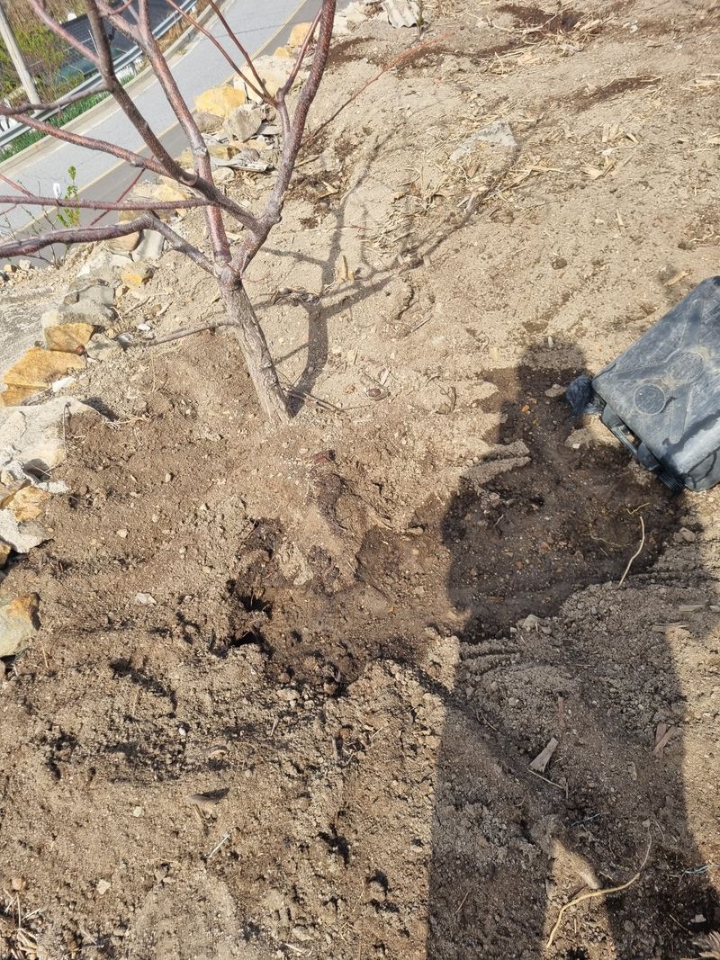 안녕하세요 오늘은 저희집앞 도로건너변 가드레인옆으로 과수나무에다 복숭아1주.대추나무3주 저희퇴비보관장소 바닥까지 글거모아 서 도합 4주에다 완숙퇴비주는 작업 끝내게 되었음니다.