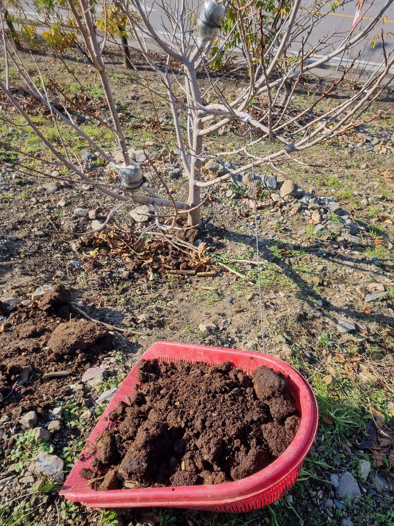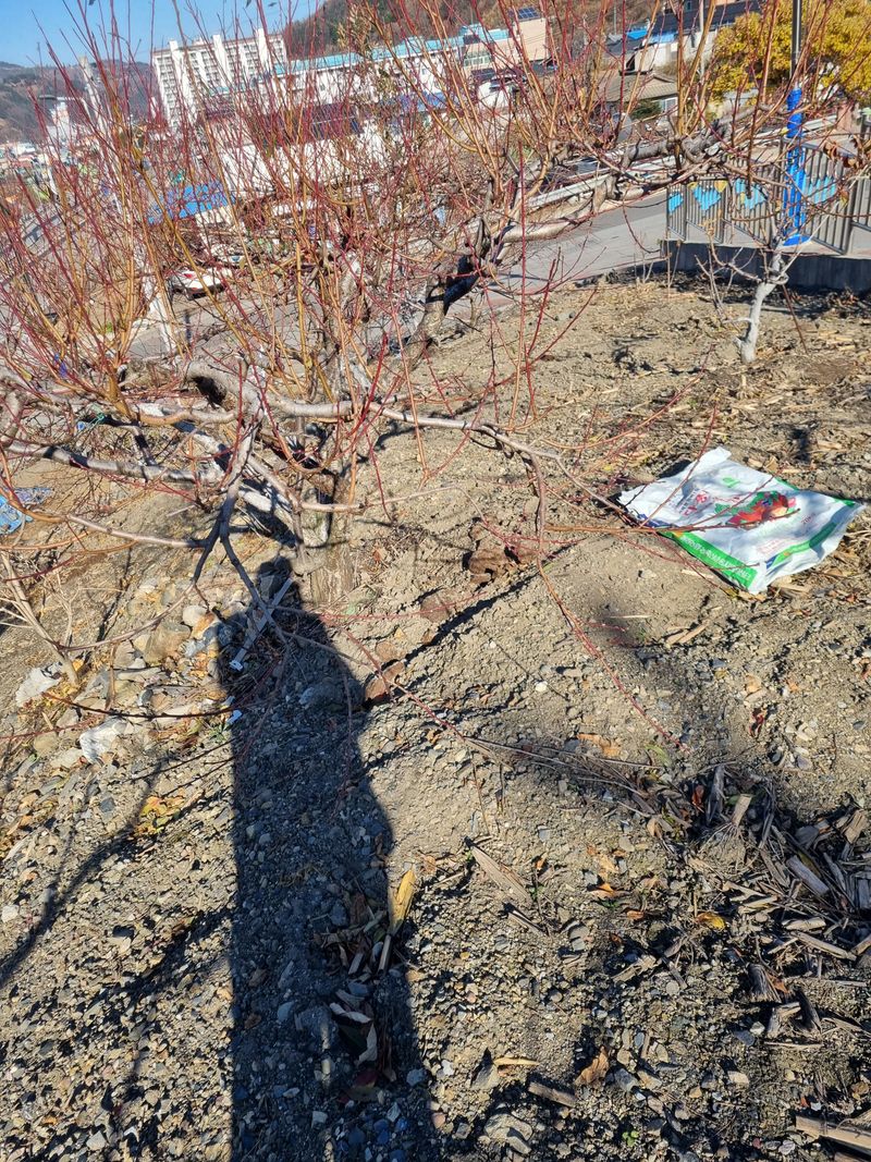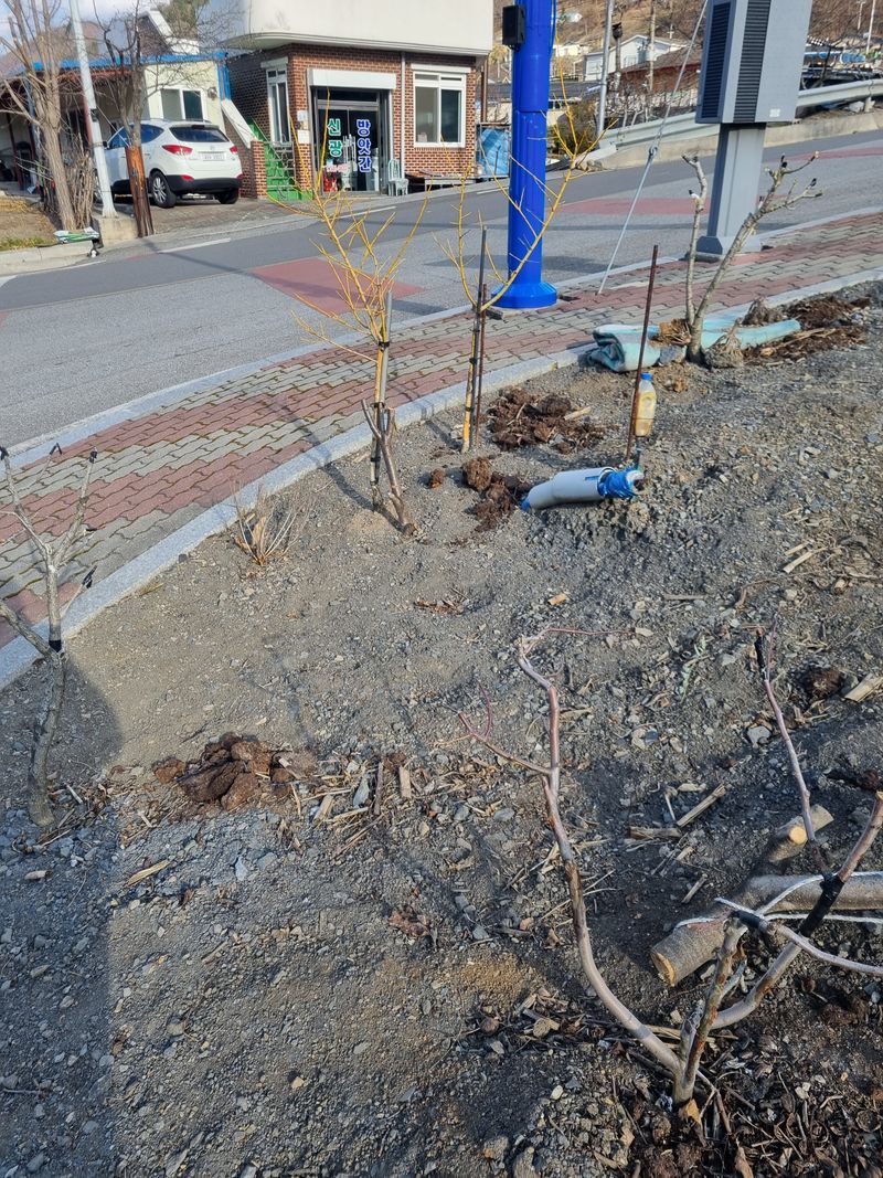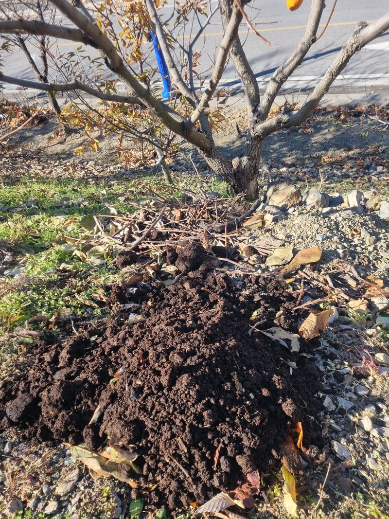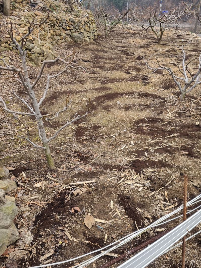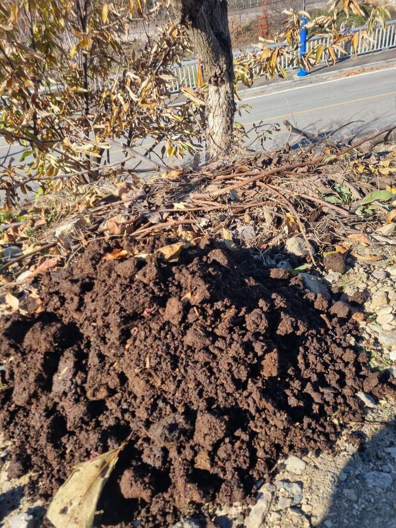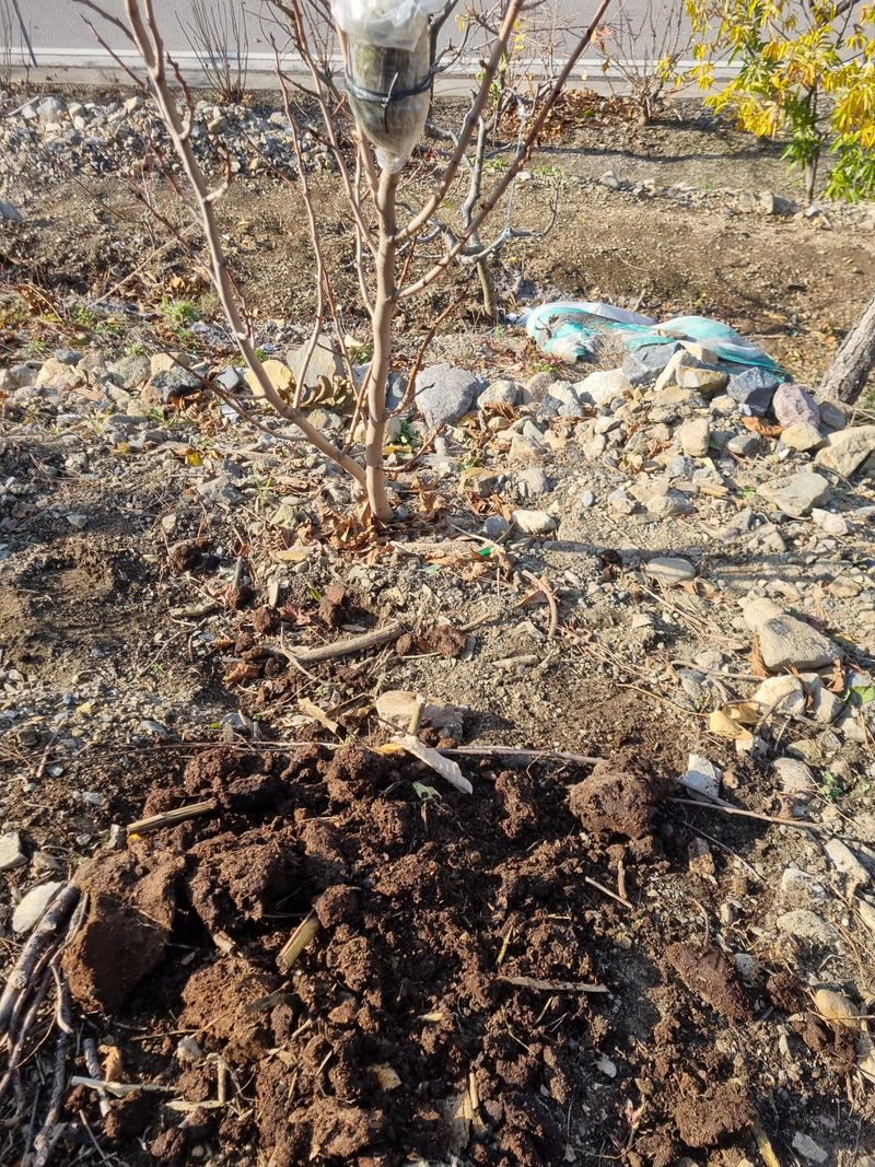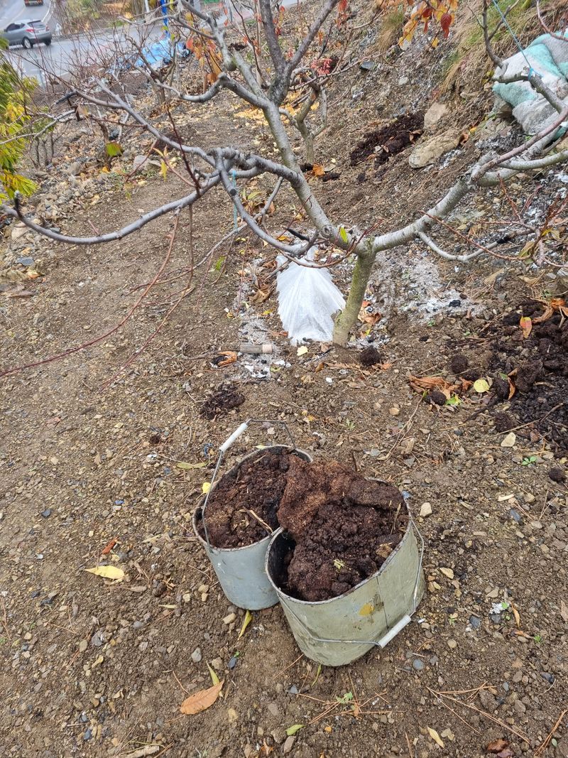 안녕하세요 오늘은 저희집앞 도로건너변 가드레인옆으로 과수나무에다 복숭아1주.대추나무3주 저희퇴비보관장소 바닥까지 글거모아 서 도합 4주에다 완숙퇴비주는 작업 끝내게 되었음니다.