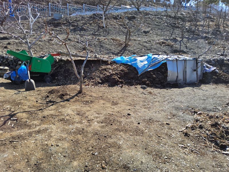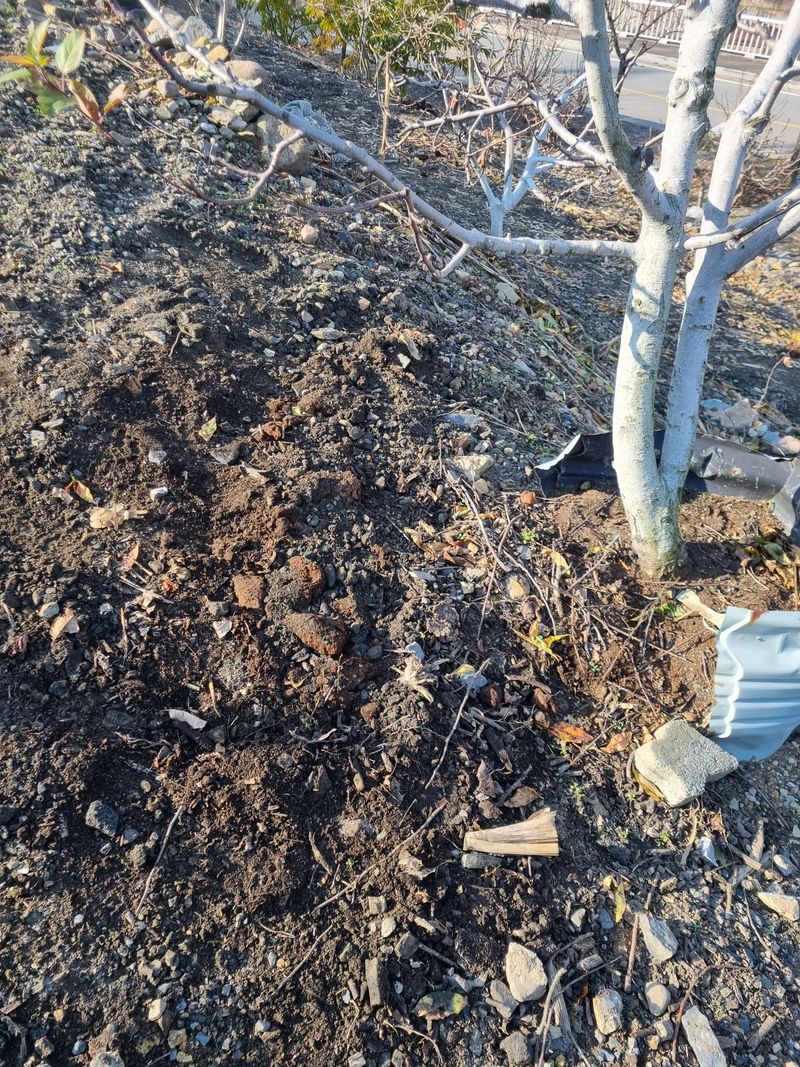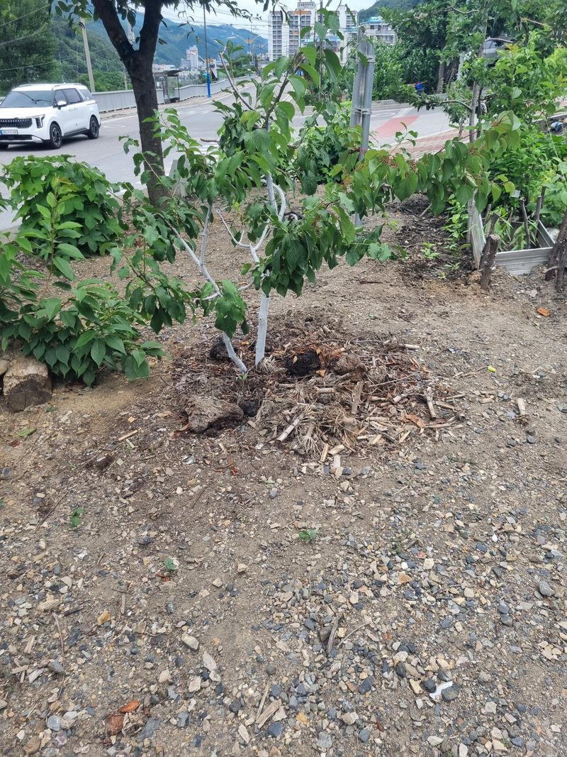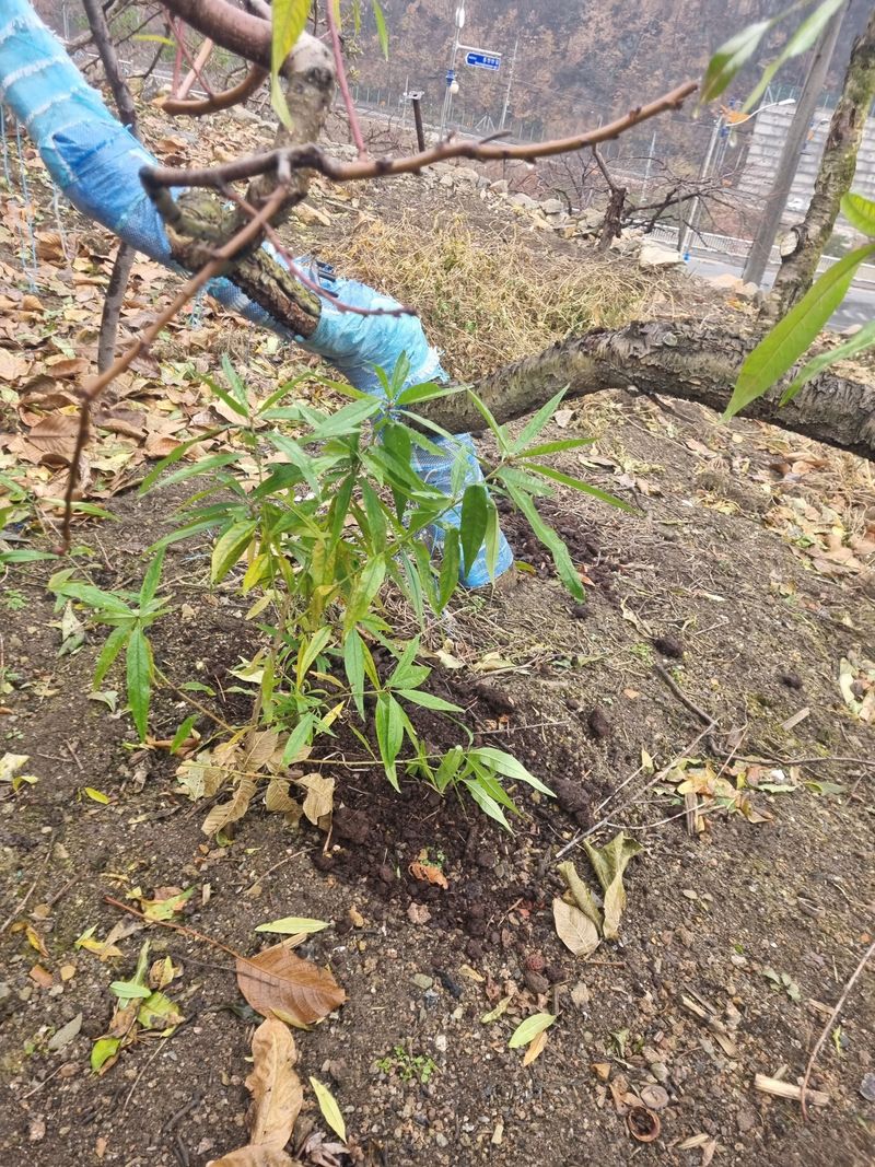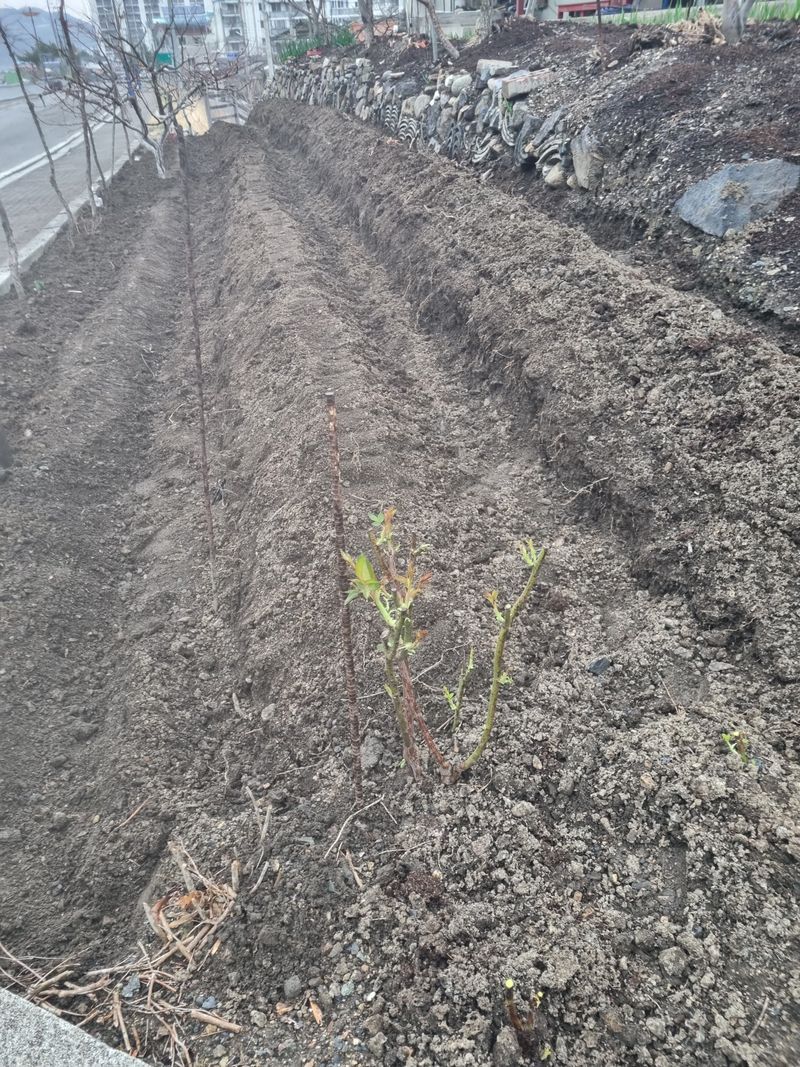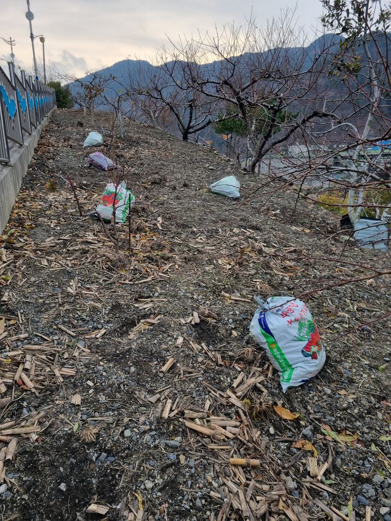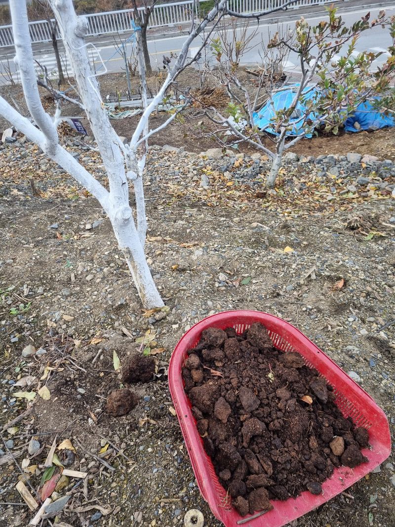 안녕하세요 오늘은 저희집앞 도로건너변 가드레인옆으로 과수나무에다 복숭아1주.대추나무3주 저희퇴비보관장소 바닥까지 글거모아 서 도합 4주에다 완숙퇴비주는 작업 끝내게 되었음니다.