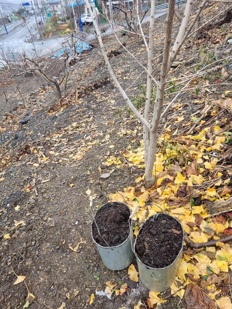 안녕하세요. 오늘은 날씨 추을뿐이며 여타 복잡한 날씨아니군요. 오늘저희집앞도로건너 과수나무밭 중앙위치 되겠음니다.여기 모과. 헤이즐넛.포포나무 첨부사진처럼 이렇듯 식재됨에 오늘은 저희가p .바구니에다 완숙퇴비를담아서 한나무에 한바구니씩 부어 주는데 경사지이기에 나무에서...