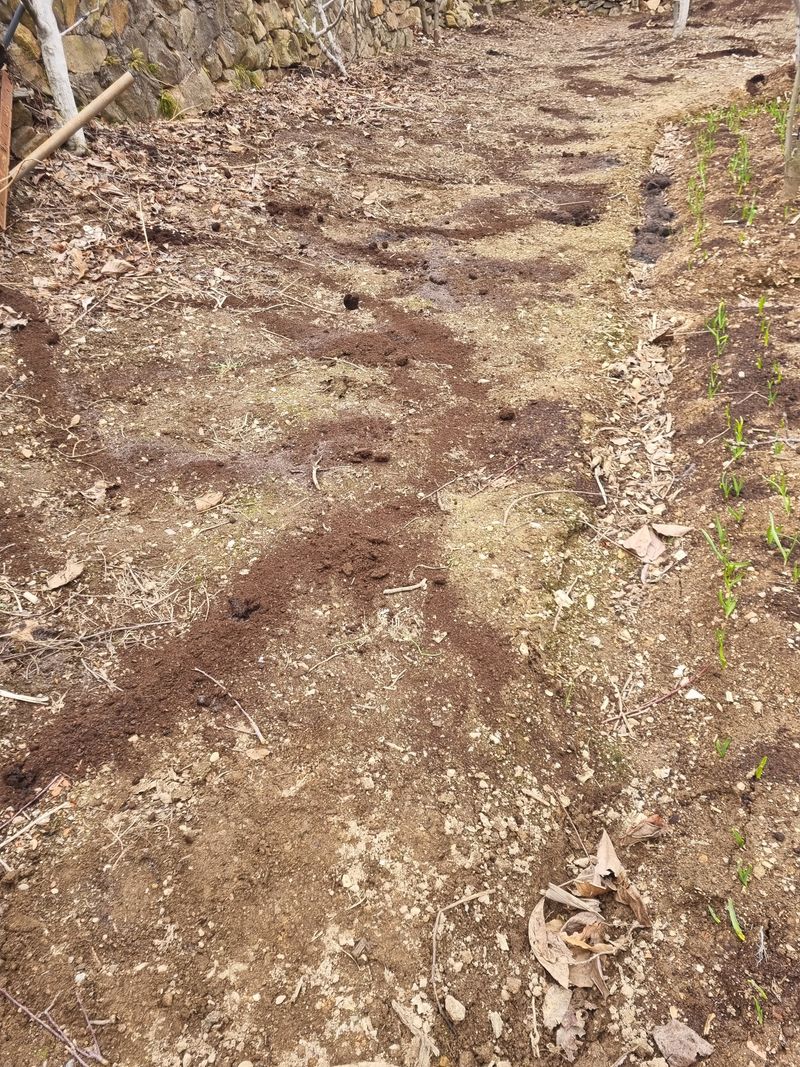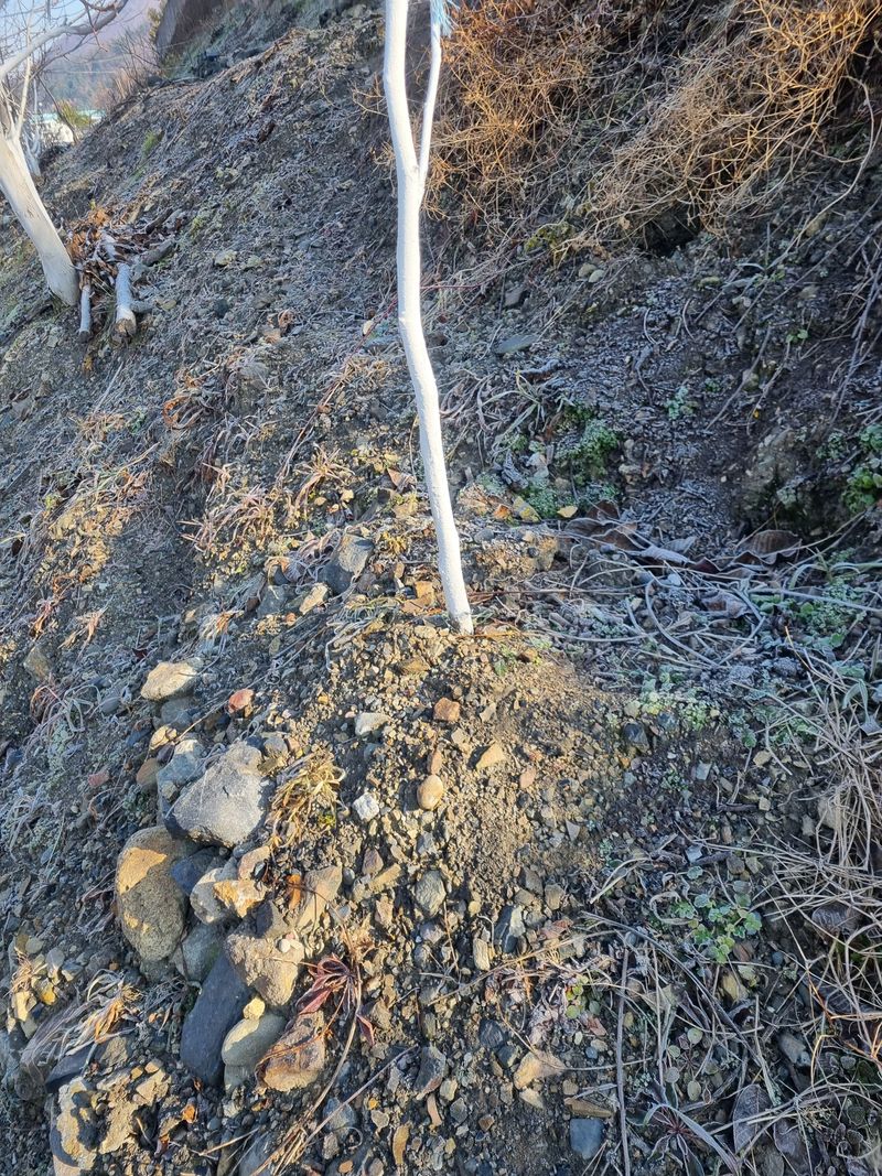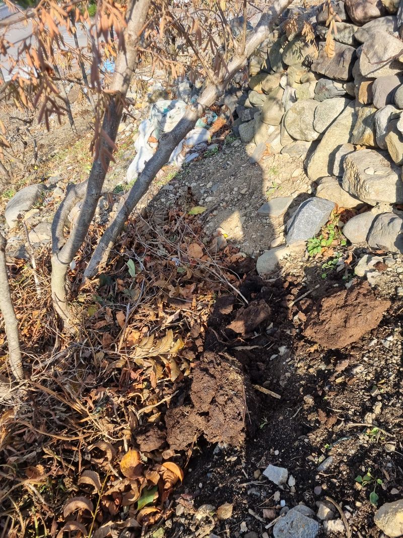 안녕하세요. 오늘은 저희집 도로건너 언덕위 조금 음지인 위치에다 과수밭내 여기저기 어린포포나무가 흩어저있는것을 지난해 이식 했었음니다. 오늘 이나무들에게 완숙퇴비를 첨부사진처럼 조금식 더 주게 되었음니다.