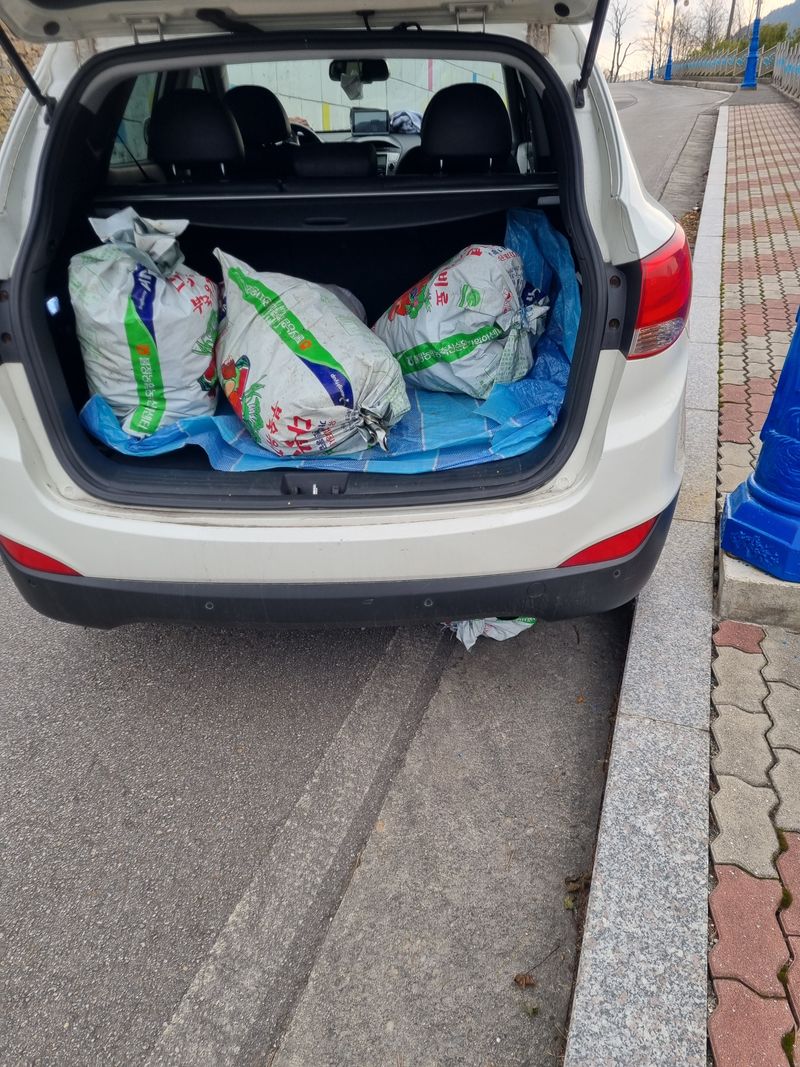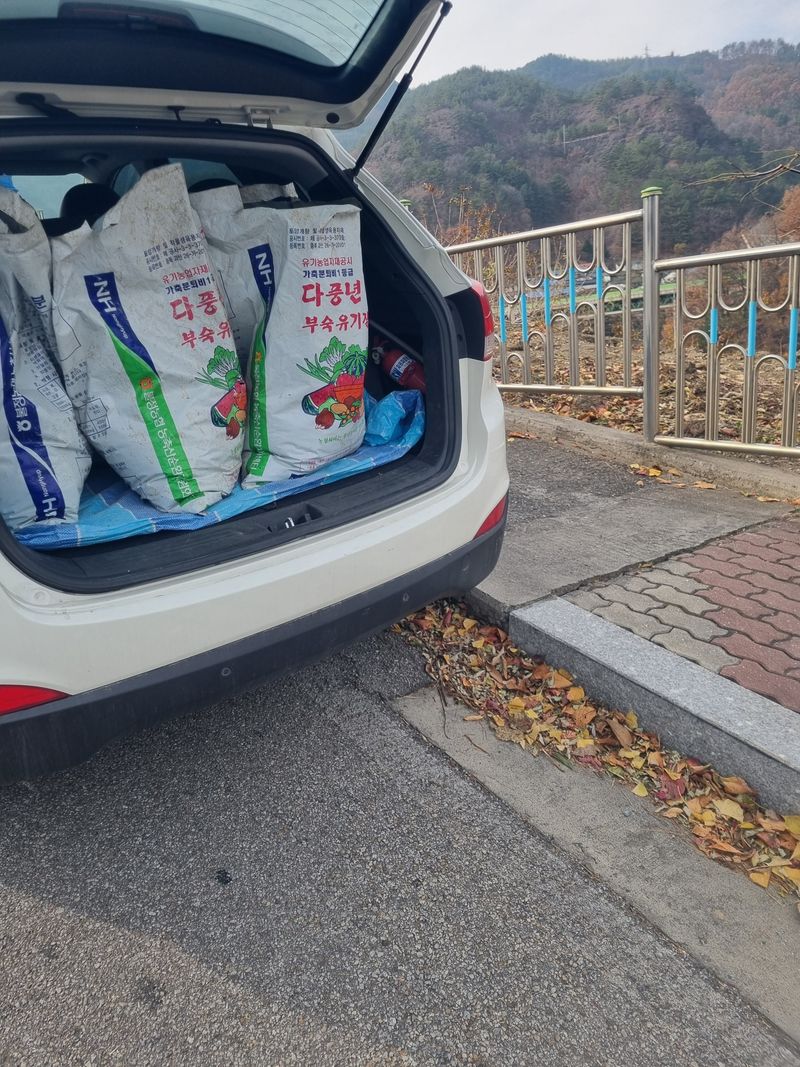 안녕하세요. 오늘도 첨부사진처럼 어제에이어서 저희퇴비저장소 의 완숙퇴비를 저희승용차뒷 드렁크에다 실어서이번은 저희집앞이 아니고 집옆 언덕위 과수밭에올라 나무1주당 퇴비 반 포대씩 첨부영상처럼 부어 주었음니다.