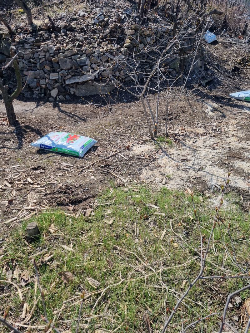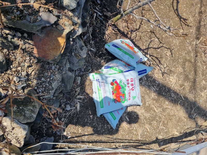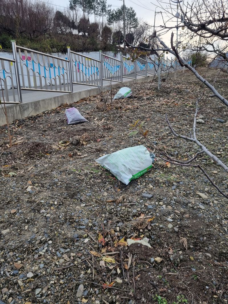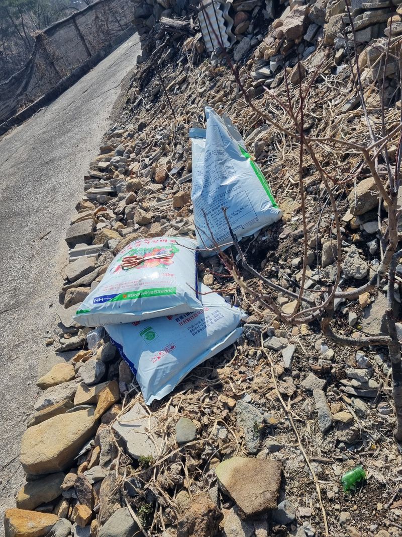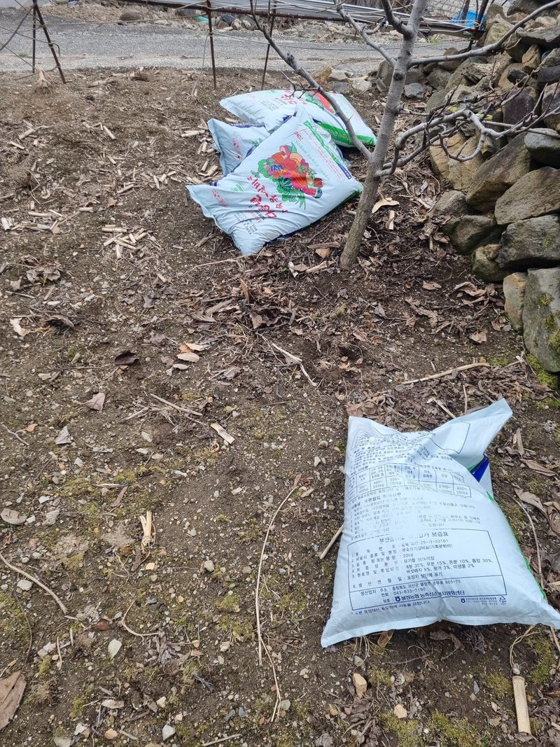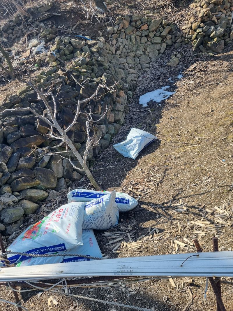 안녕하세요. 오늘도 첨부사진처럼 저희집 바로앞 도로건너 석축담장을끼고서 퇴비저장소가 마련되어. 완숙퇴비를 먼저 포대에 담아서(사진5번)저희 승용차뒷 드렁크에실고(사진1번6번) 과수나무에 차량 가까운곳까지 운행후 하차 작업.사진(234번)은 나무1주당 퇴비 반 포대...