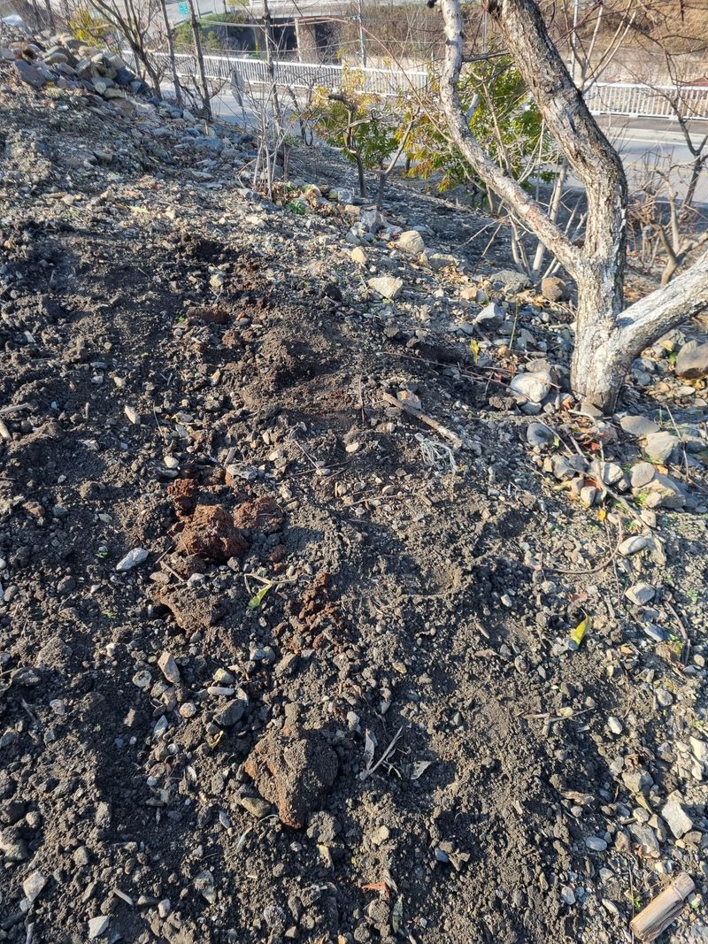안녕하세요. 오늘은 저희집앞 도로건너변 과수나무밭에 어제 저희 지인께서준 퇴비를저희 이곳 과수나무인데까지 갔다 놓았죠. 하여서 오늘 저희 복숭아.자두.아몬드.사과나무옆에서 60cm정도 떨어지게 흑을파고 그 퇴비를 부은후 다시 평탄 작업 하여서 마무리하는것임니다.
