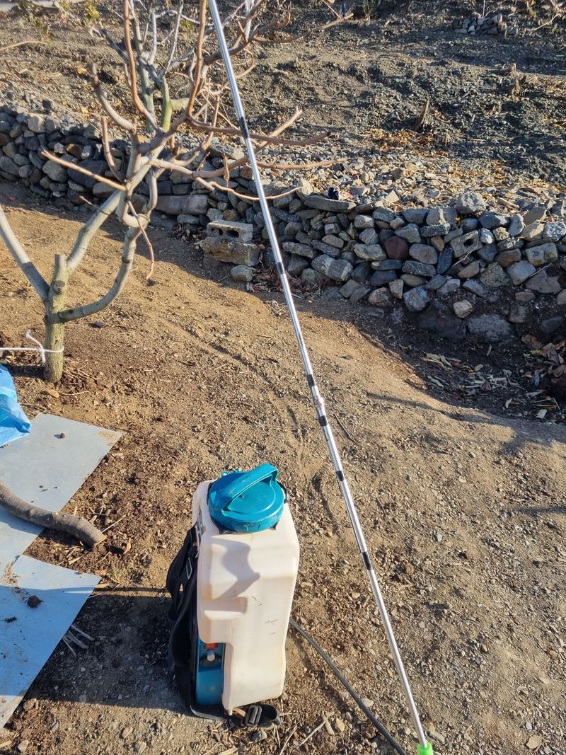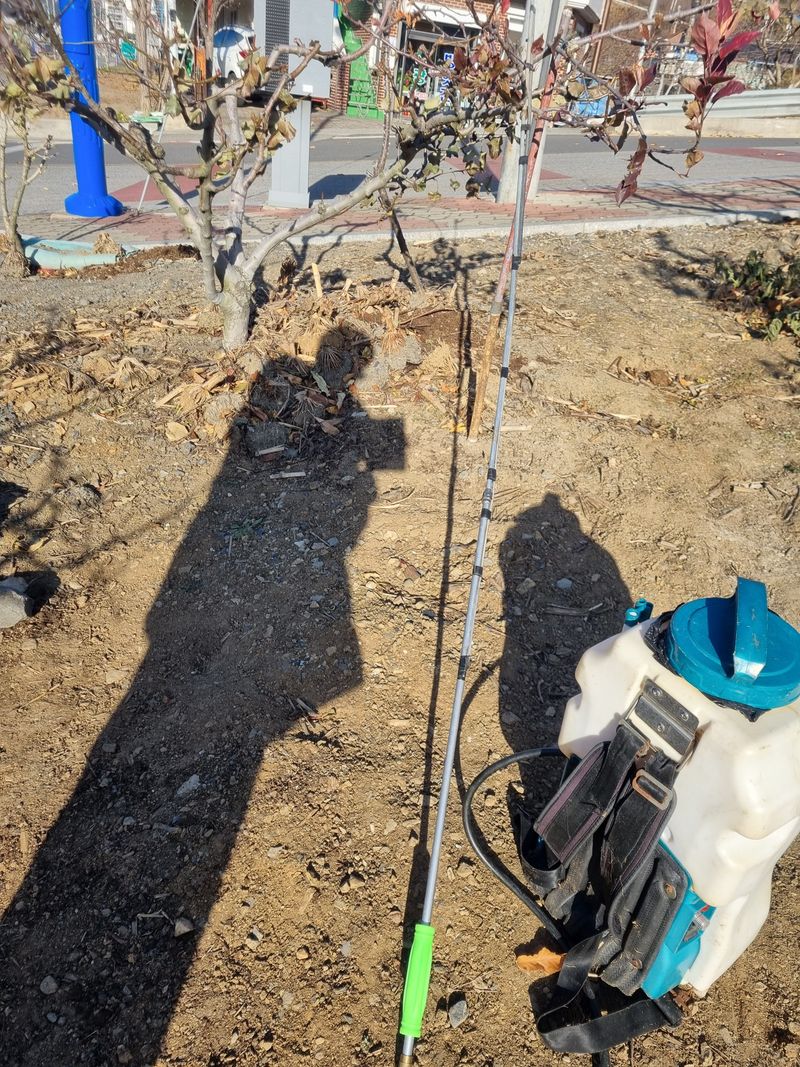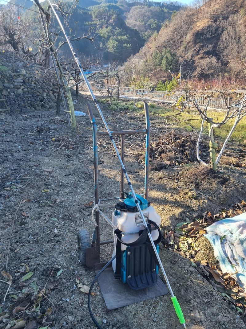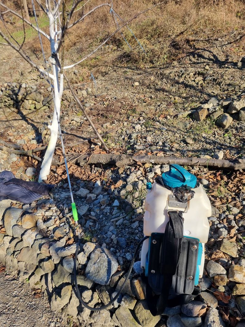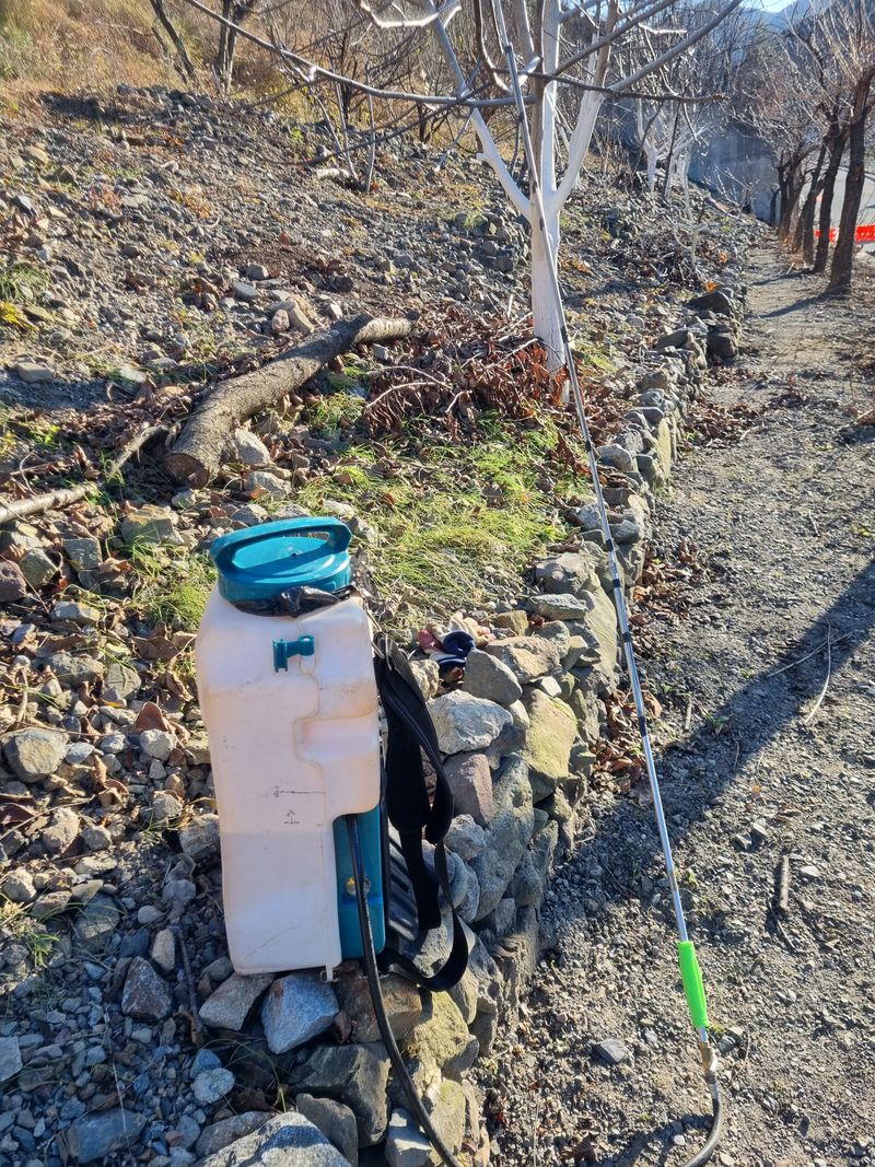 안녕하세요 오늘은 예보상 비내림이지만 맑은 햇살이 순간적으로나마 비춰줌니다. 하기에 저희계획대로 간단히 첨부사진처럼 호두나무 2주 감나무2주. 동계방제 하기로 살충제바람탄. 석회유황합제.동계유. 전착제 이렇게 희석후 분무 살포 작업 하였음니다 한편 더 살포 할 뜻은...