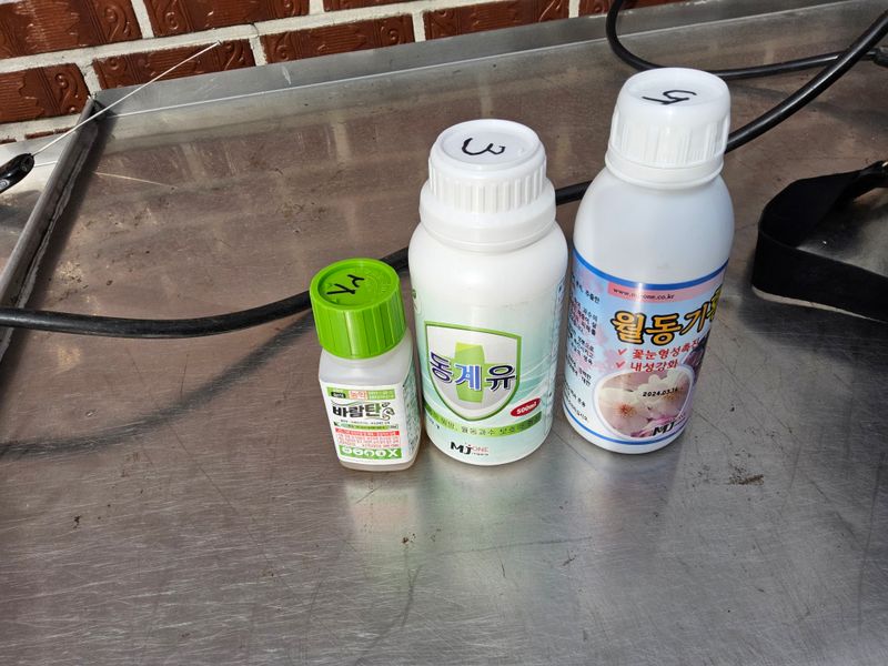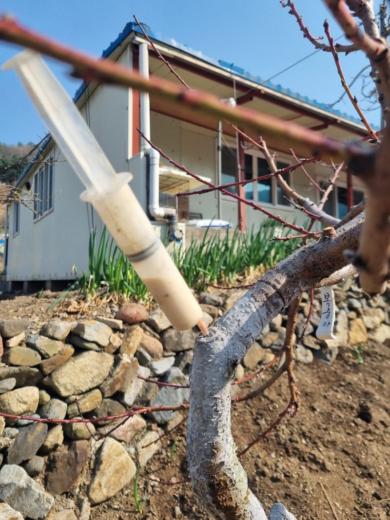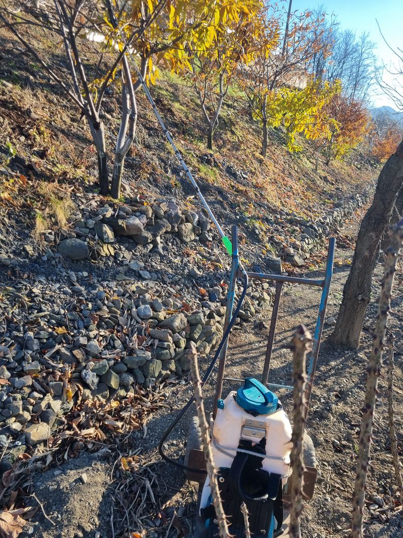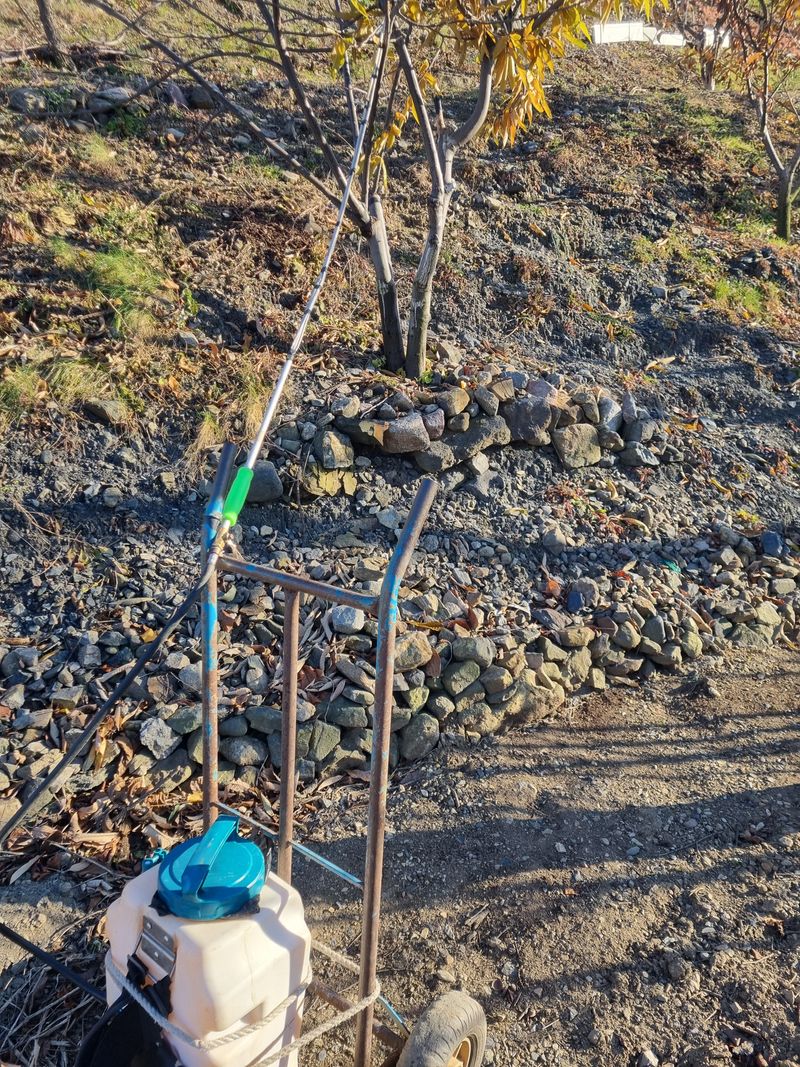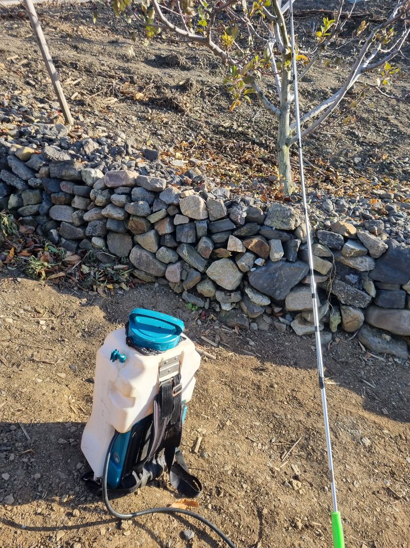 안녕하세요 오늘은 예보상 비내림이지만 맑은 햇살이 순간적으로나마 비춰줌니다. 하기에 저희계획대로 간단히 첨부사진처럼 호두나무 2주 감나무2주. 동계방제 하기로 살충제바람탄. 석회유황합제.동계유. 전착제 이렇게 희석후 분무 살포 작업 하였음니다 한편 더 살포 할 뜻은...
