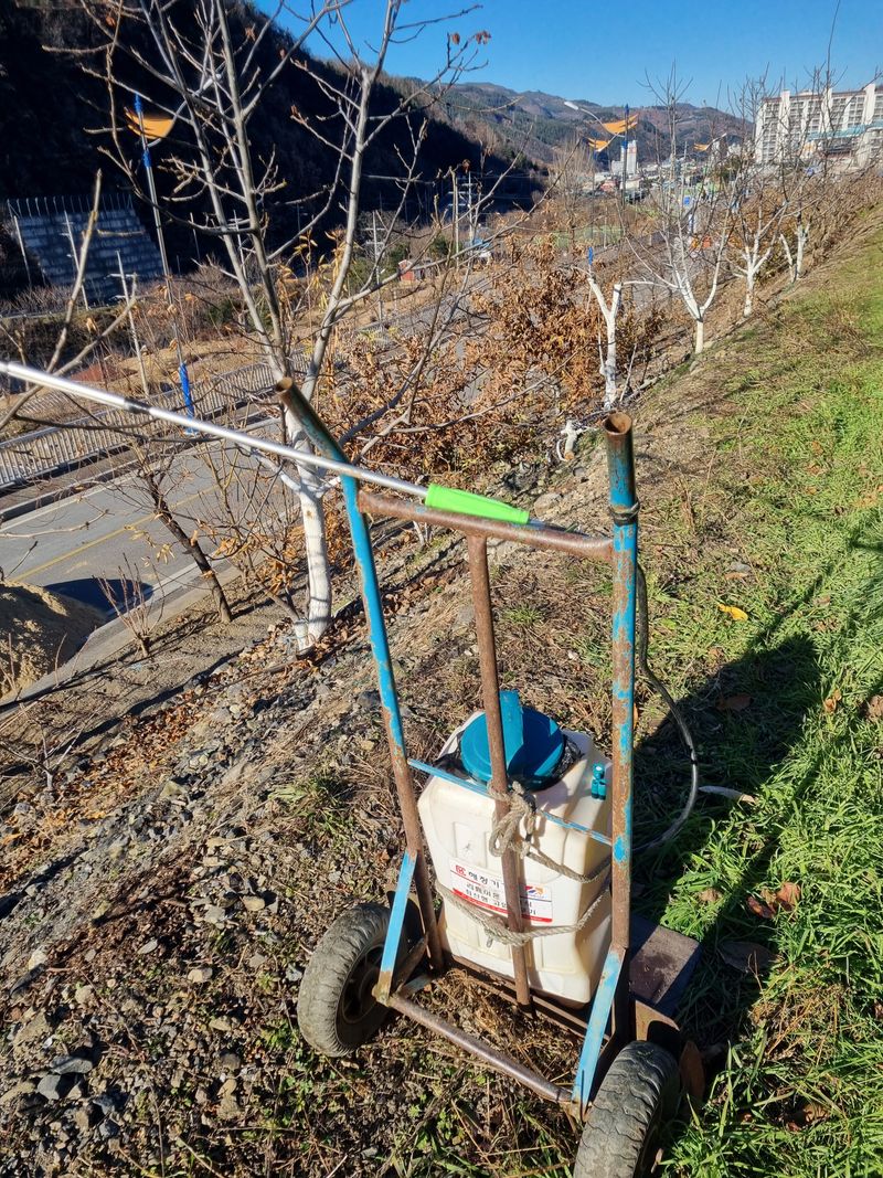 안녕하세요 . 오늘은 날씨 추운데 여기도계엔 바람약함니다. 그래서 첨부영상처럼 저희집 옆도로건너 언덕위 과수나무에다(호두.자두.복숭아.배.사과.감.밤.)병.해충.감염예방 된다는 월동기황( 유황합제)을 구입하여서 어제 방제에 이어 오늘 분무살포 하게 되었어요.