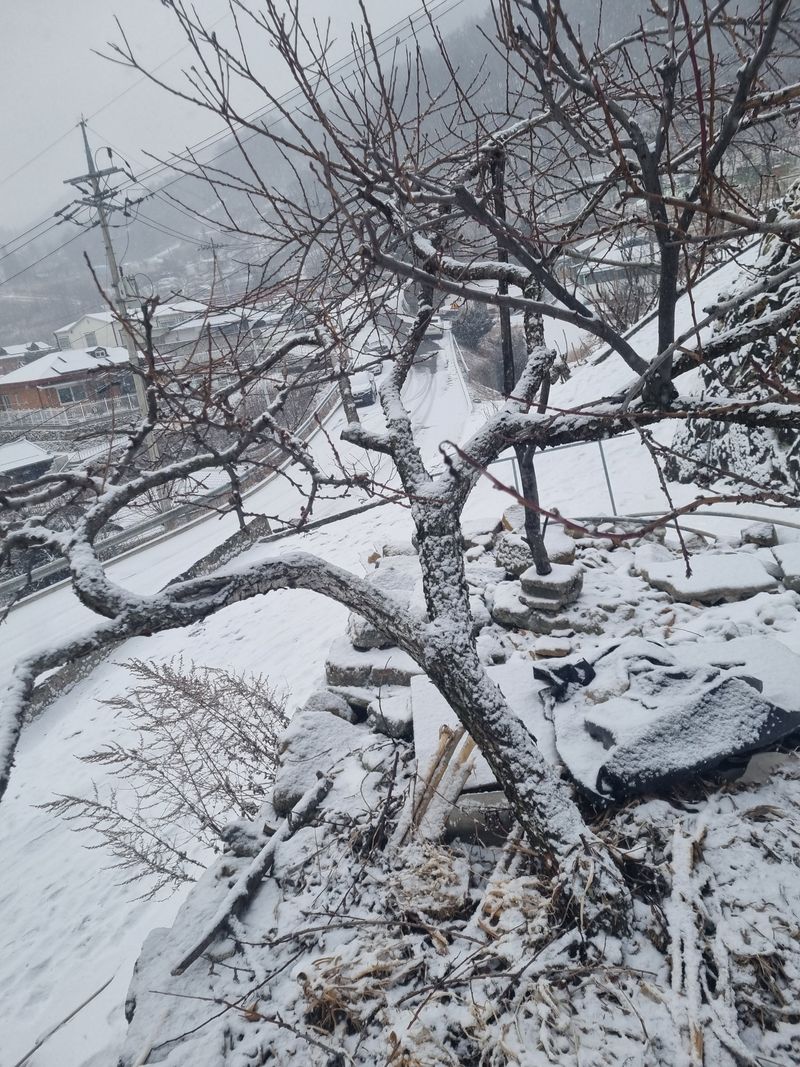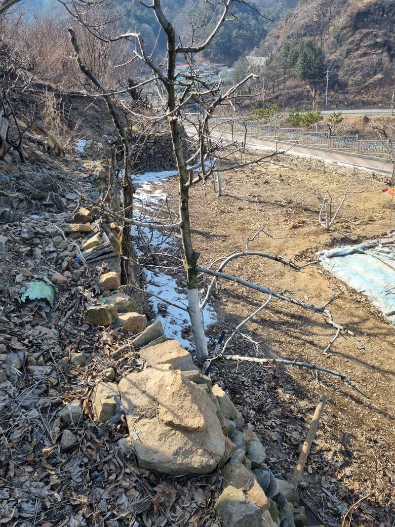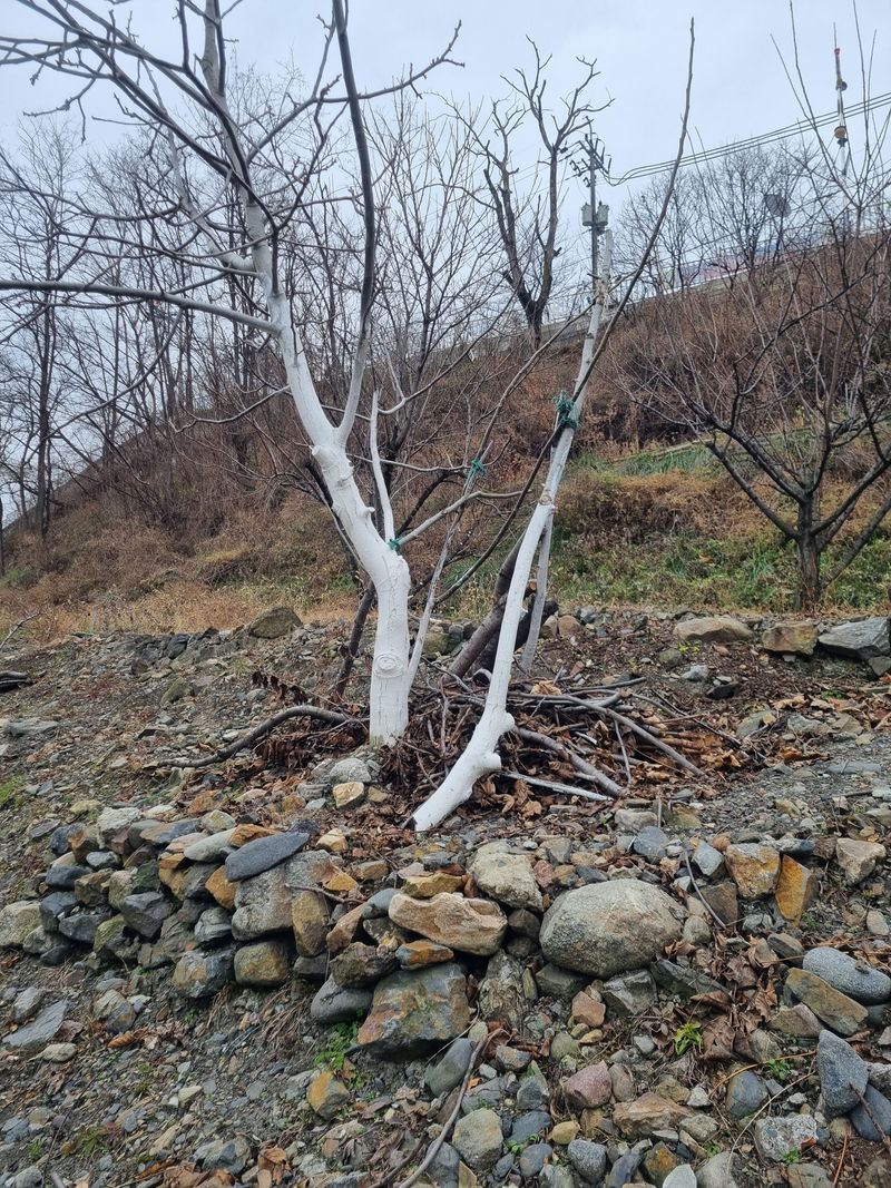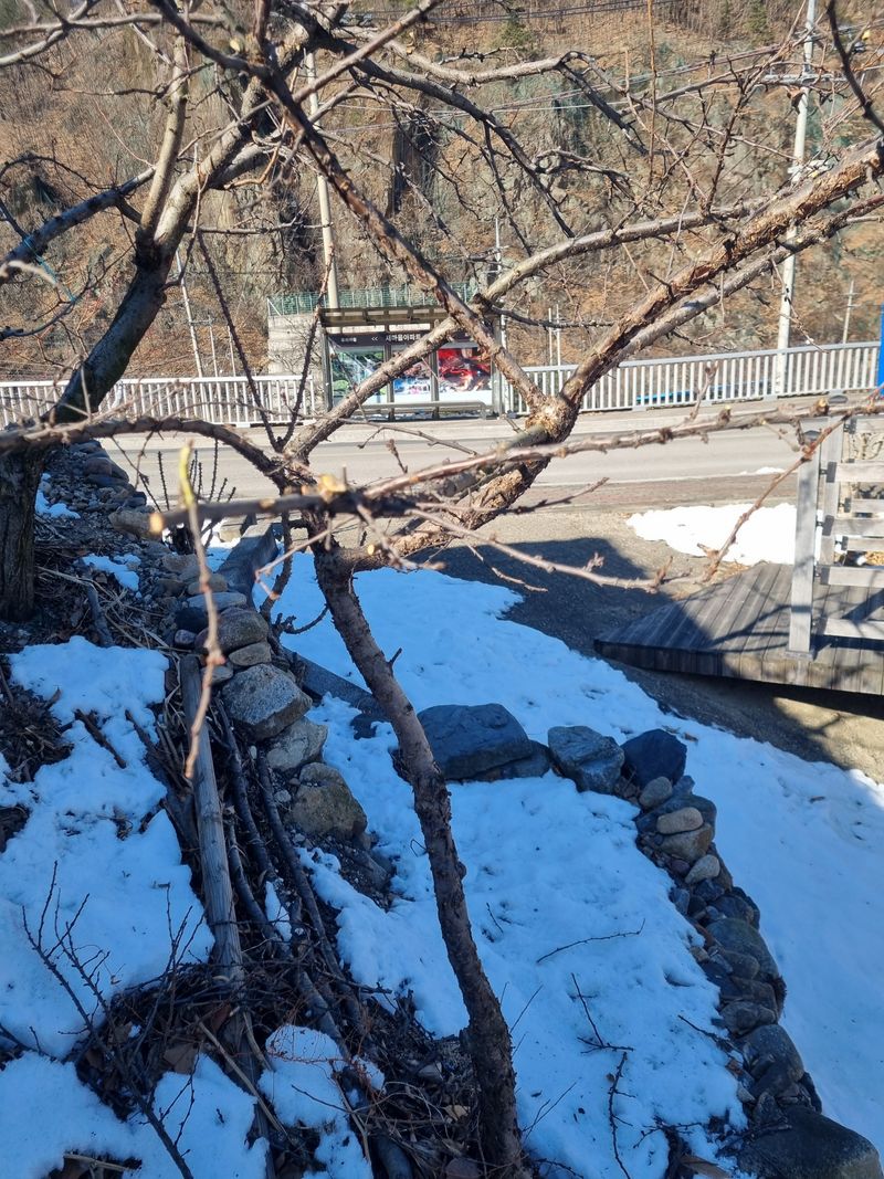 안녕하세요. 이곳 삼척 도계 흥전이란곳.이제서야 눈에묻혖던 땅이 눈이녹아서 조금 식 얼굴이 들어나 우리들의 시야를시험해 보네요. 한편 오늘은 저희집앞 도로건너 언덕위 일부 감나무와 호두나무에 동계 방제 마무리코저 어제에이어 살충제인 바람탄.석회유황합제.동계유.전착제....