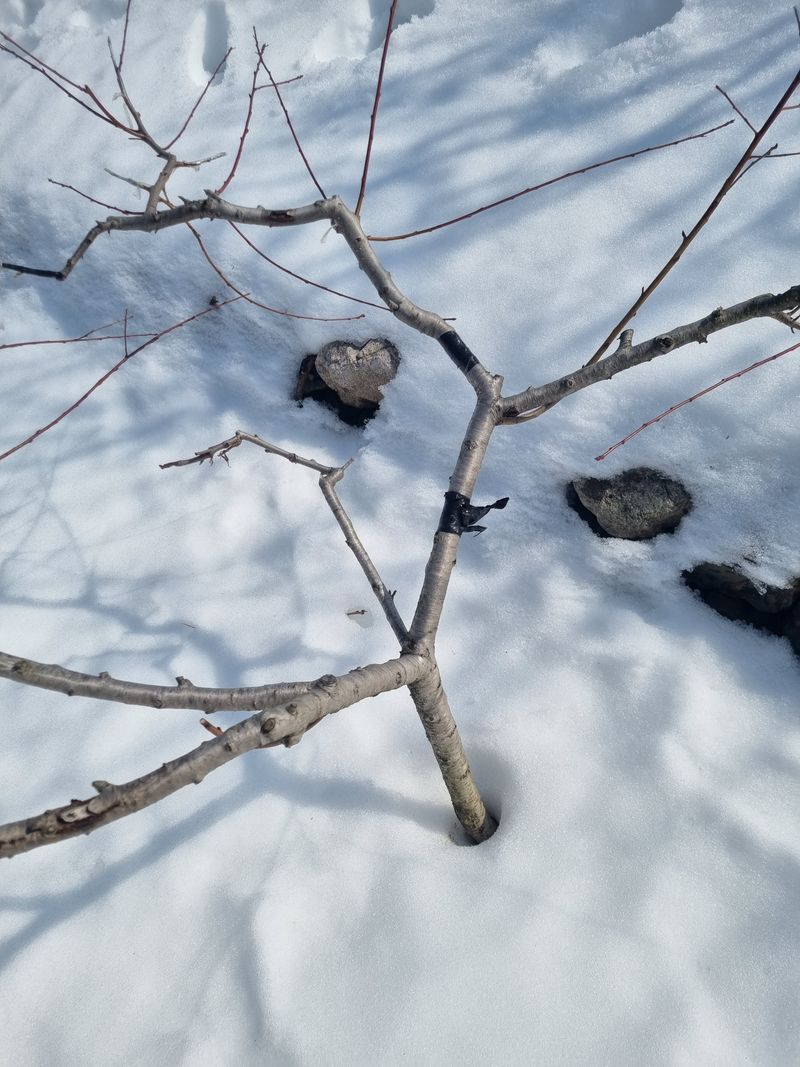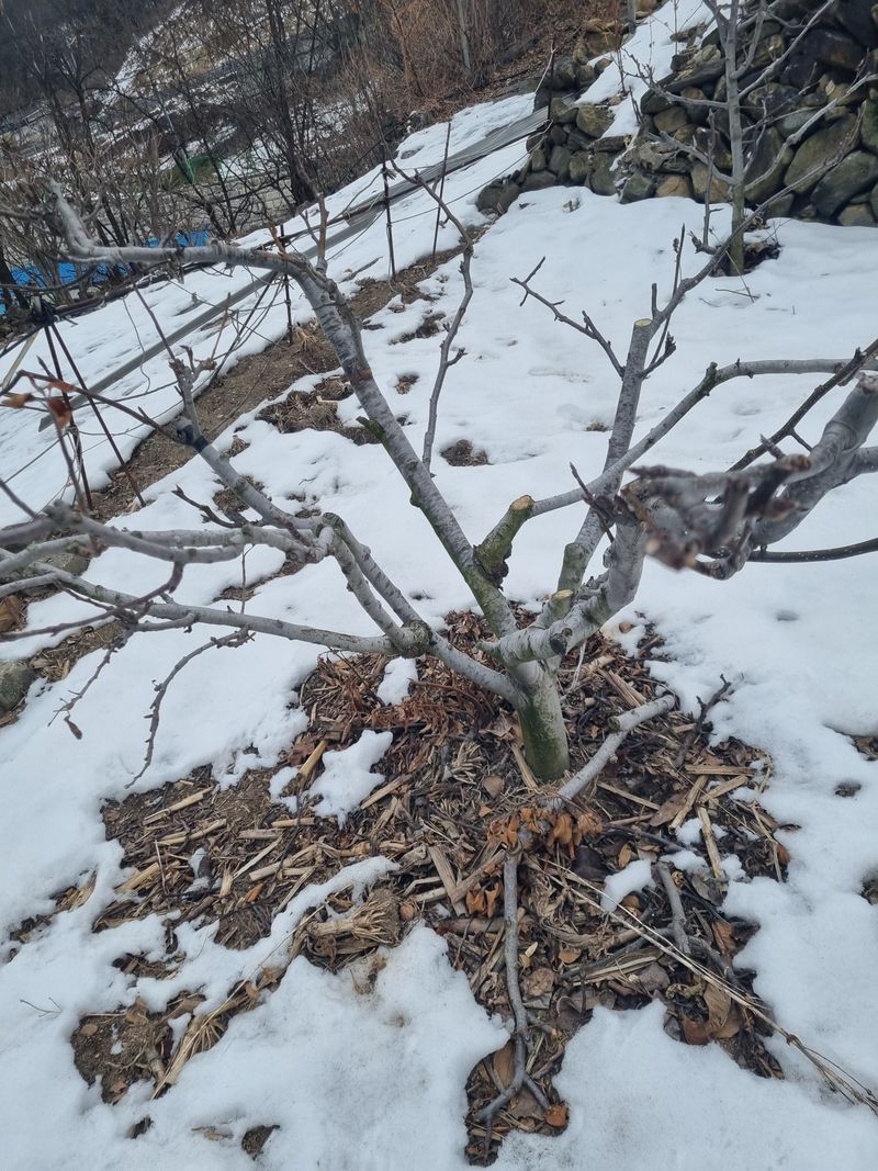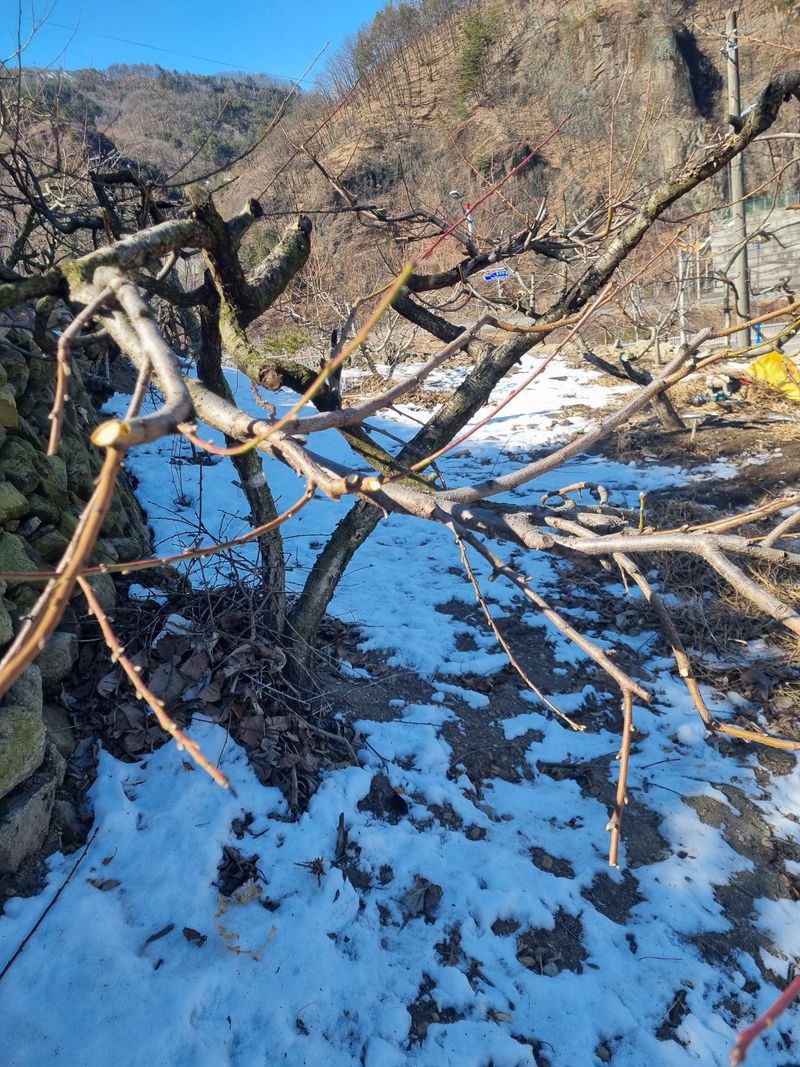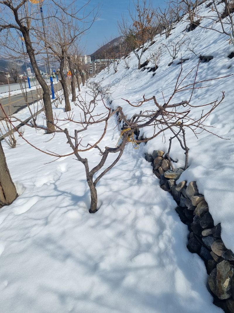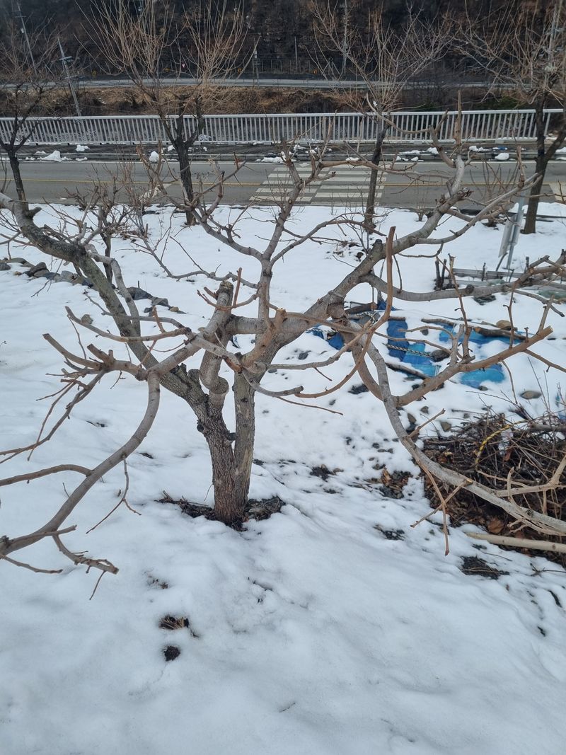 안녕하세요. 오늘은 저희집앞 도로건너 언덕위 어제하든작업에이어서 아직 눈이쌓 여 다니는데도 조심...공기도 인정없는사람 모양처럼 차고 싸늘한 날씨 임니다. 저희 오늘도 겨우 사과대추나무1주. 스타크점보사과나무1주. 이렇듯 도합2주가지치기하고. 우리들 팜모닝 장터에...