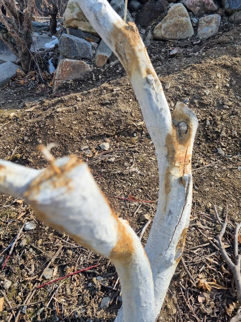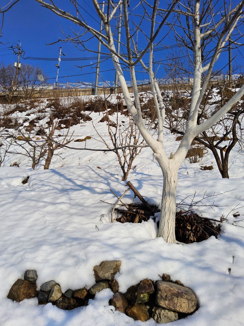 안녕하세요. 오늘은 저희집 도로건너서 언덕위식재된 호두나무를 1년에 3회는 외부 용 수성페인트에다 살충제인 바람탄.스미치온.주렁. 석회황합제. 등을 본 나무에다 지상 2m정도 도색 작업하면서 키우는중 첨부사진처럼 오늘도 폭설후 병충해 예방 목적하에 석회황합제.바람탄....