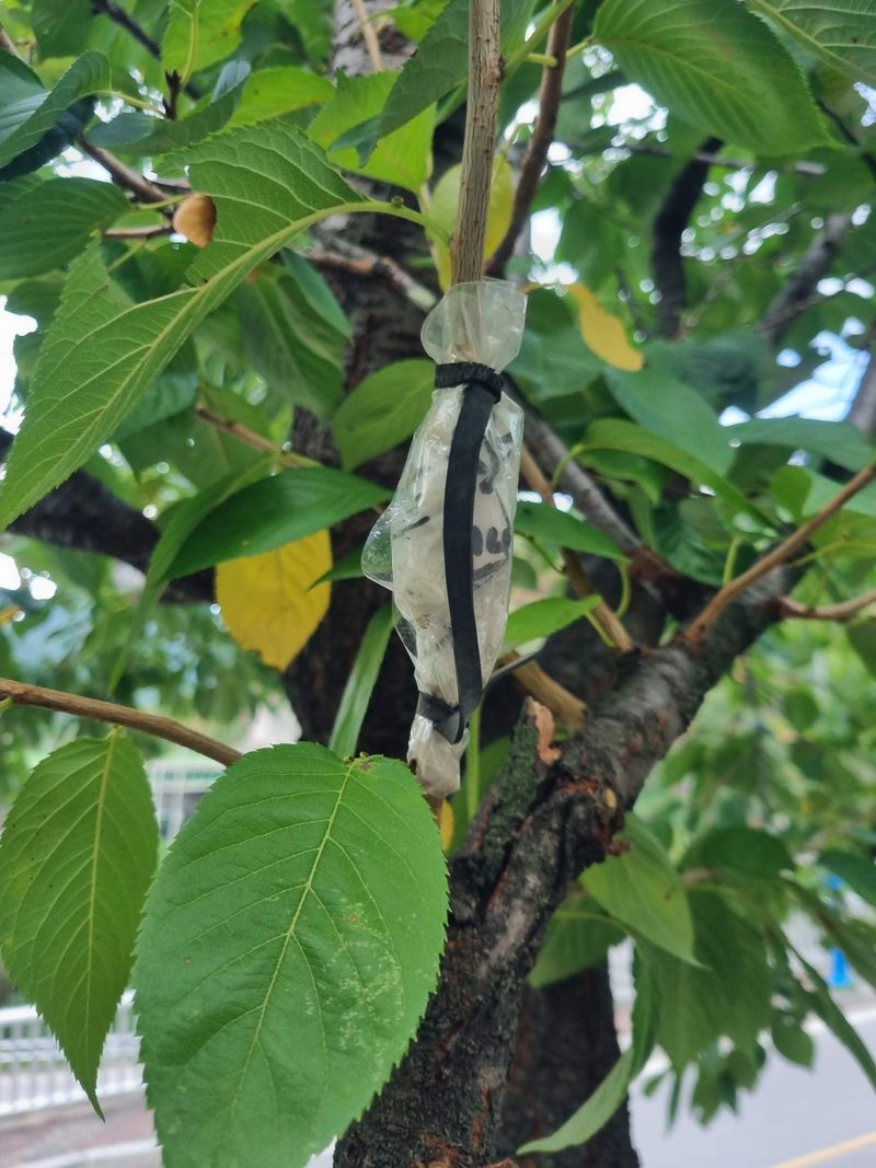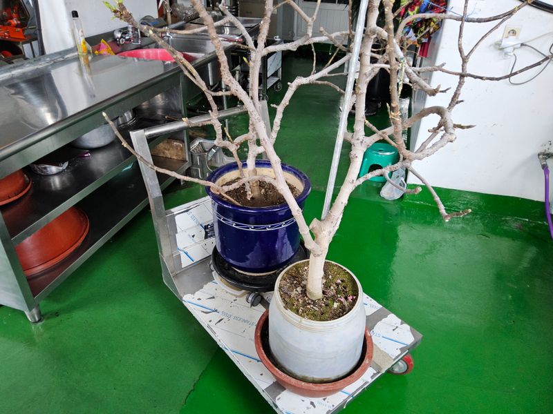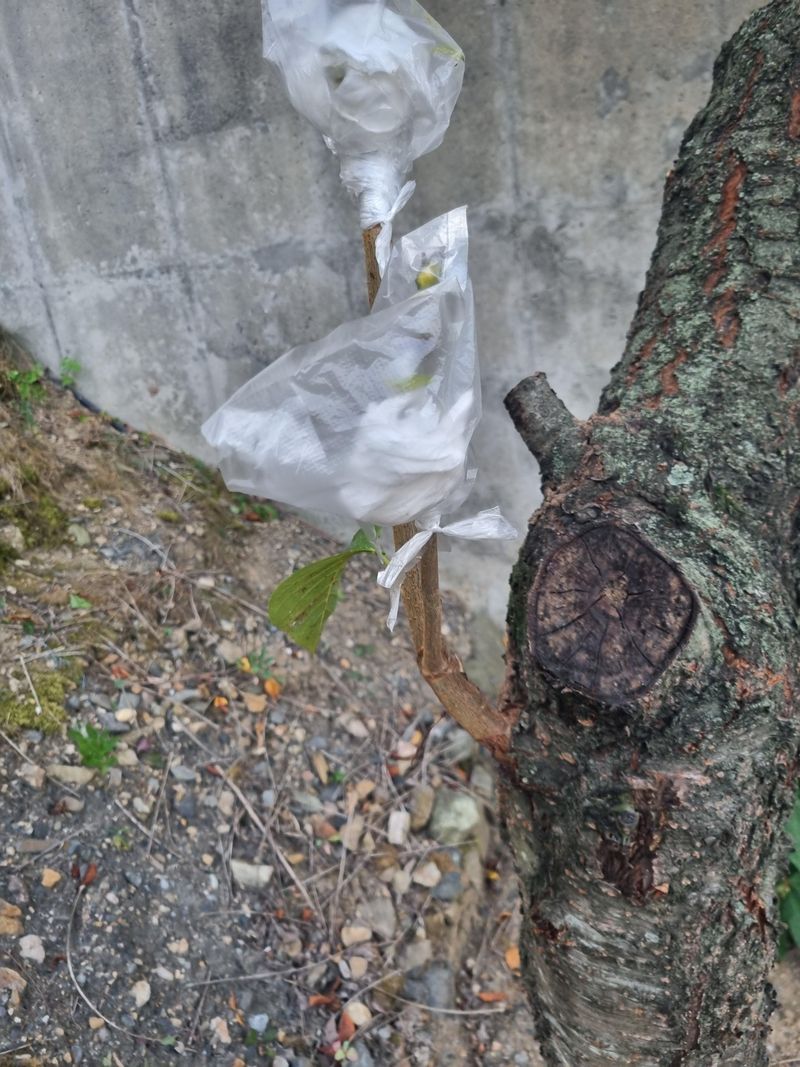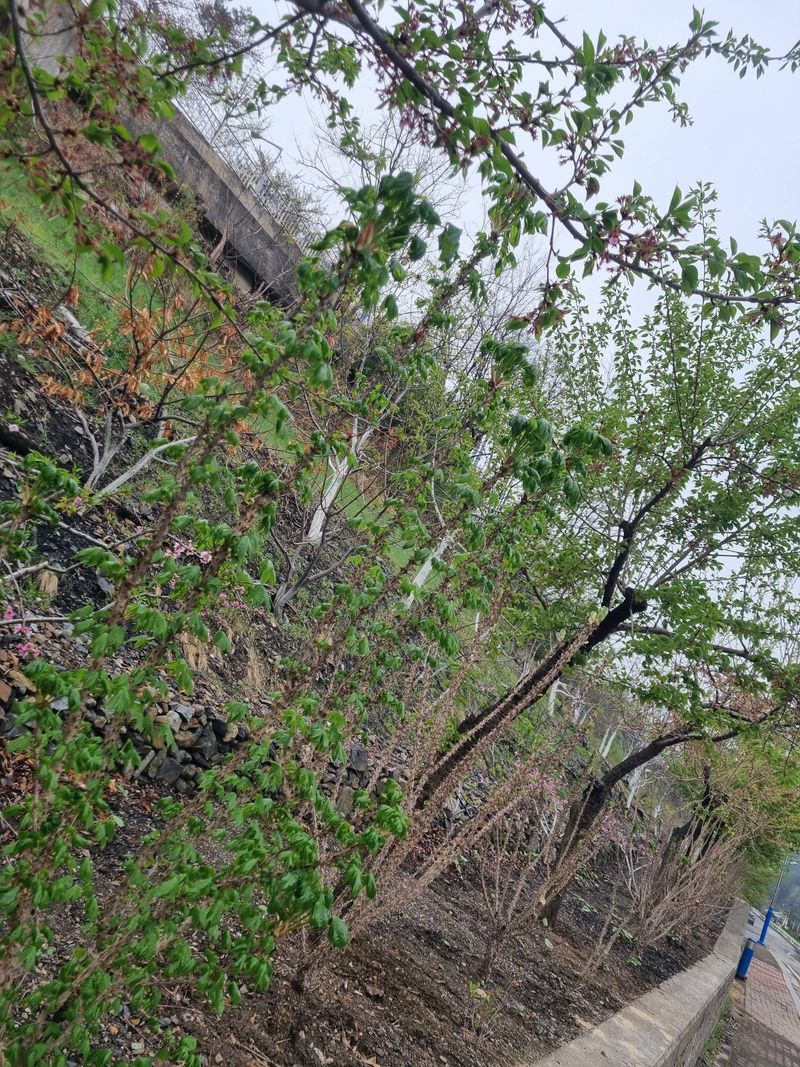 안녕하세요. 오늘도 이곳도계 예보는 비. 아침일직 미친듯이 소낙비 스처 지나갔어요. 도로위 먼지정도 날리지 못할 정도였어요. 저희집앞 도로건너 바로도로변에 가로수인벗나무 어제에이어서 겹 벗꽃나무로 첨부사진처럼 4주 접목 하였음니다.