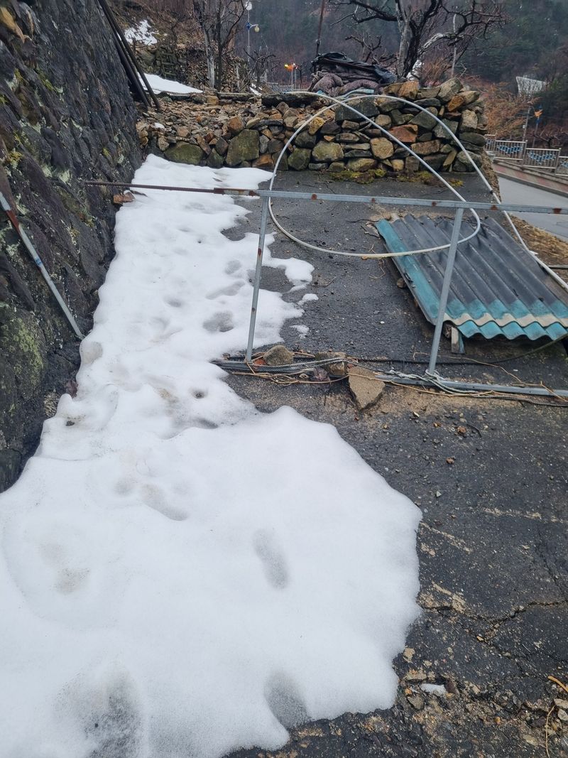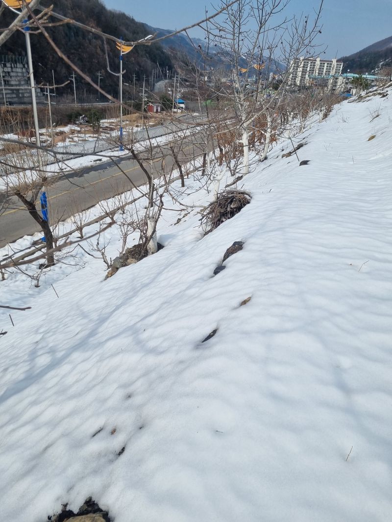 안녕하세요. 오늘은 예보상 비 로되어 저희는 집바로앞 마늘밭. 그리고 집앞 도로건너 언덕위 에 첨부사진처럼 마늘밭 출입로 자리엔 힌눈이 아직도 선명하게 쌓여 있음니다. 현재는 양쪽 마늘밭이 모두 잔 풀도없으며 아주 깨끗해서 보기는 좋슴니다. 그레서 아침일직...