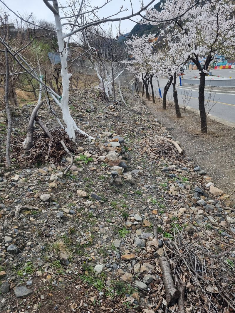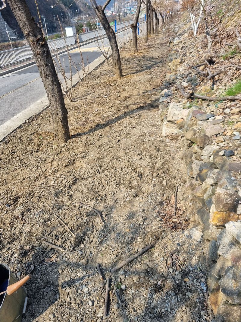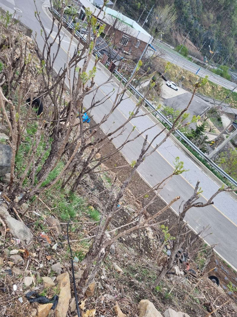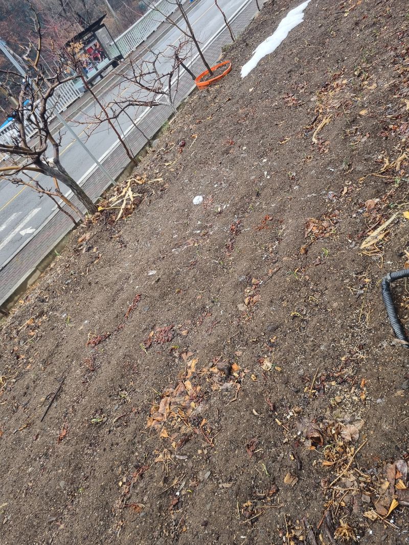 안녕하세요. 오늘은 저희집앞 도로건너 바로도로변에 식재된 가로수인 벗나무 사이 엄나무 언덕위로는 호두나무사이의 잡초들을 수작업으로 뿌리를뽑아 손수레다 실어서 저희 퇴비 저장소에다 버렸어요. 첨부영상과 함께 현장이 조금더 시원스레 보이시죠. 오후엔 예보상...