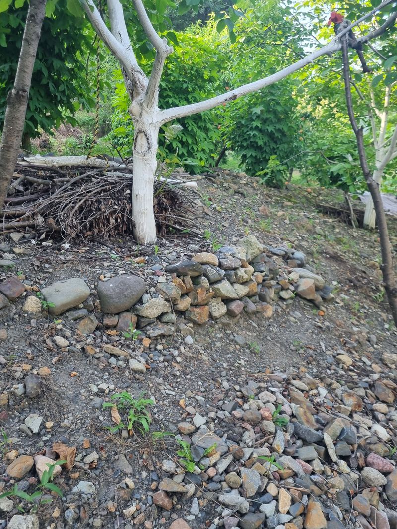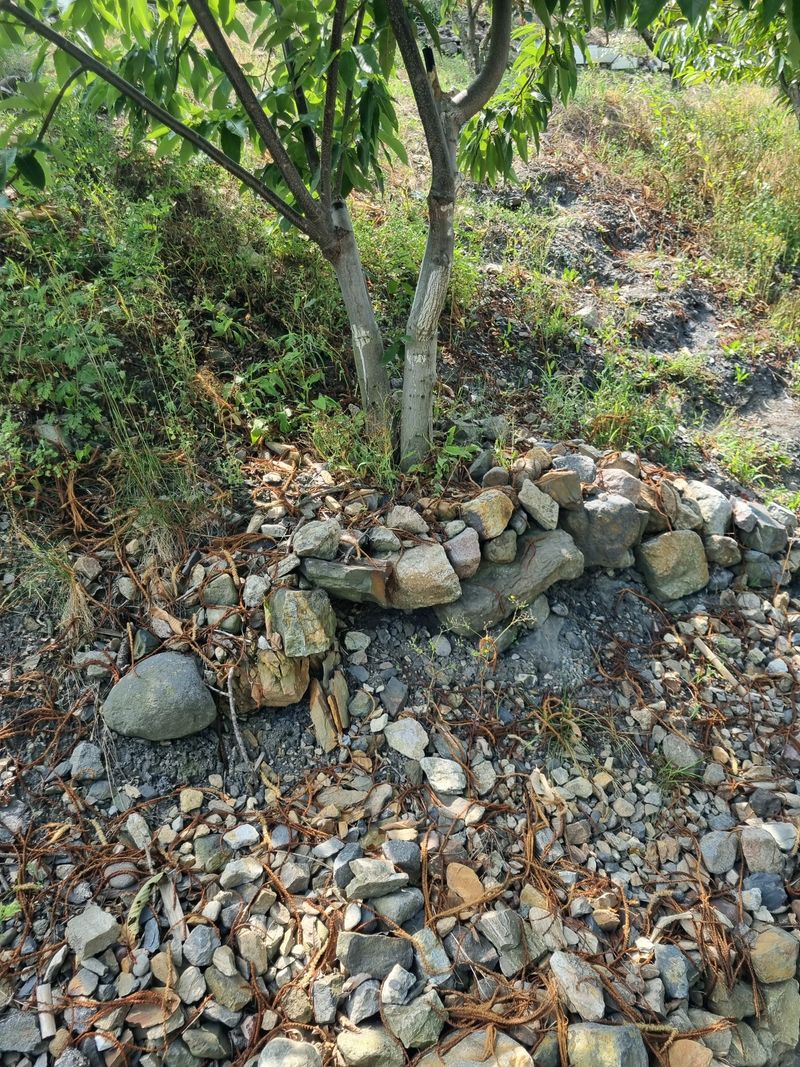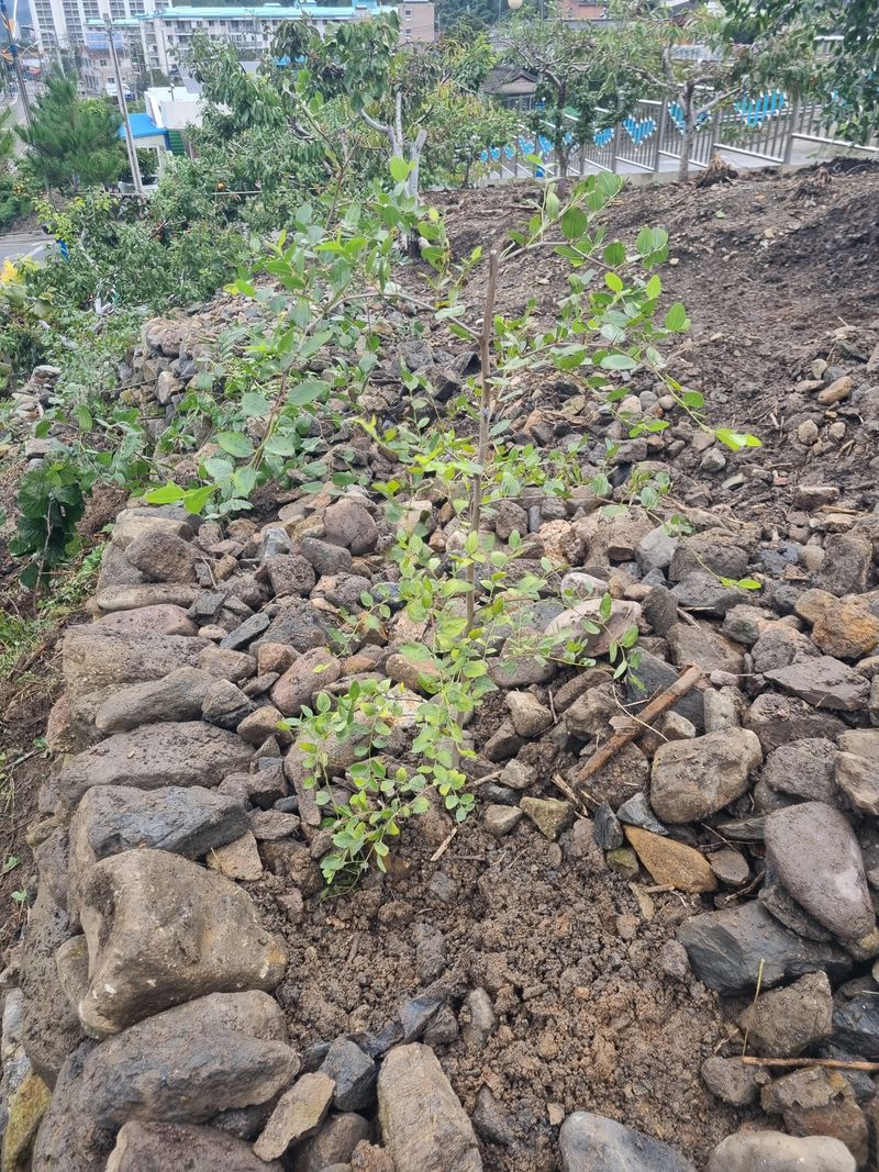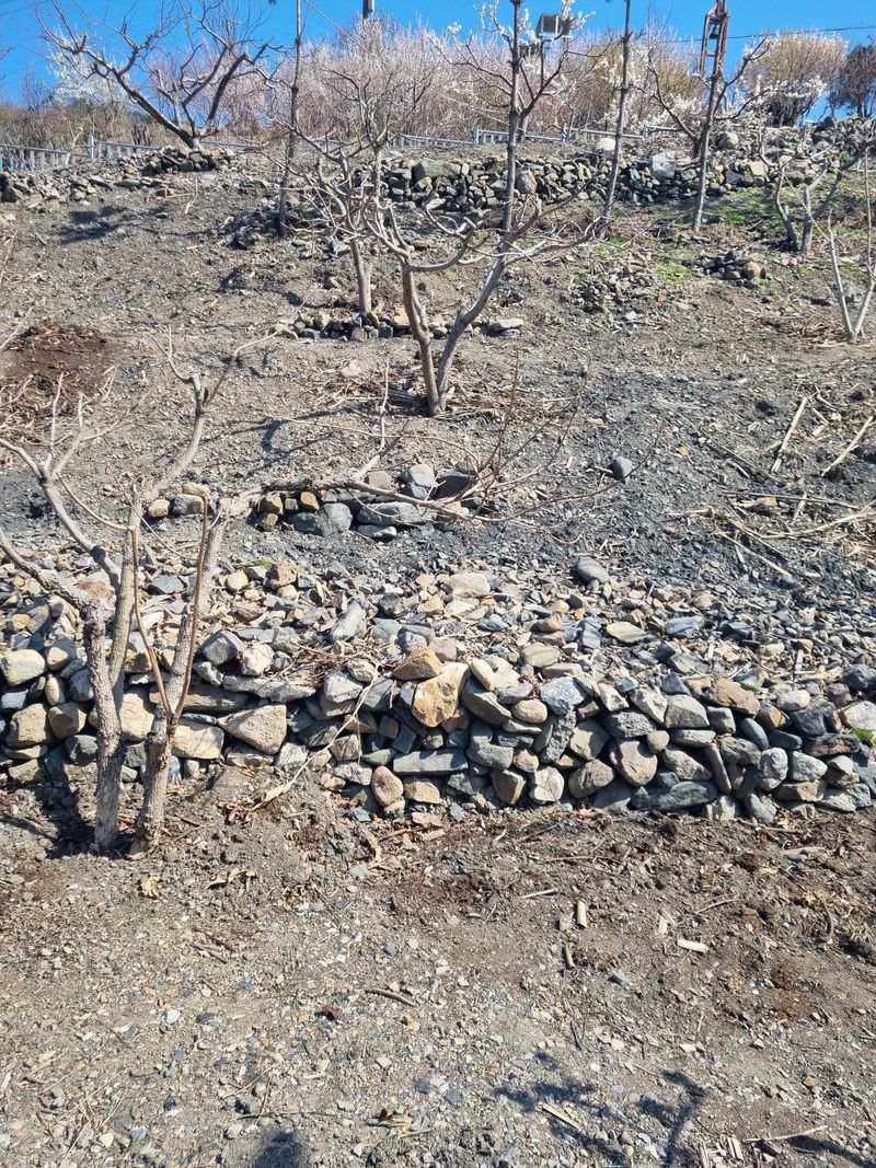 안녕하세요. 오늘도 역시 이곳도계 비내리다 그첬어요. 저희집앞 도로건너 과수나무밭 중앙지점에 경사지 나무보호용으로 석축담장을끼고 오늘 미리준비된 대추나무 2주를 첨부사진처럼 이식 작업중 비 내림에 그칠때까지 쉬었다가 비 그침을 이용하여 작업완료 하였음니다.