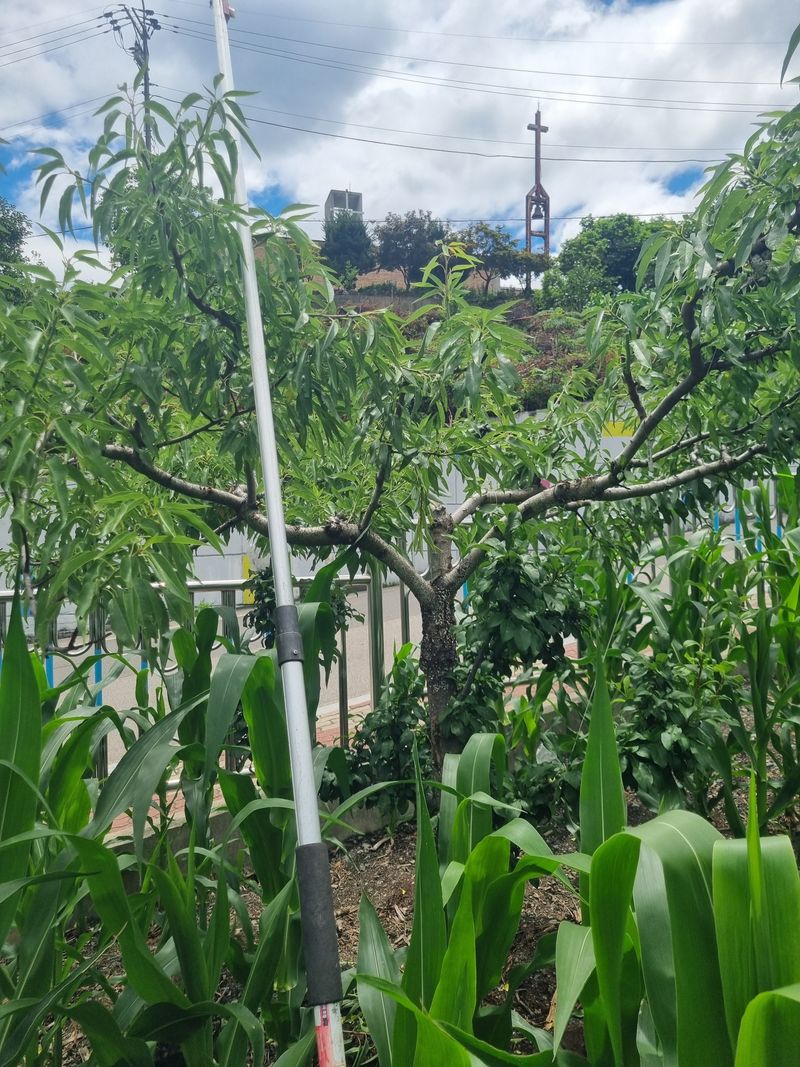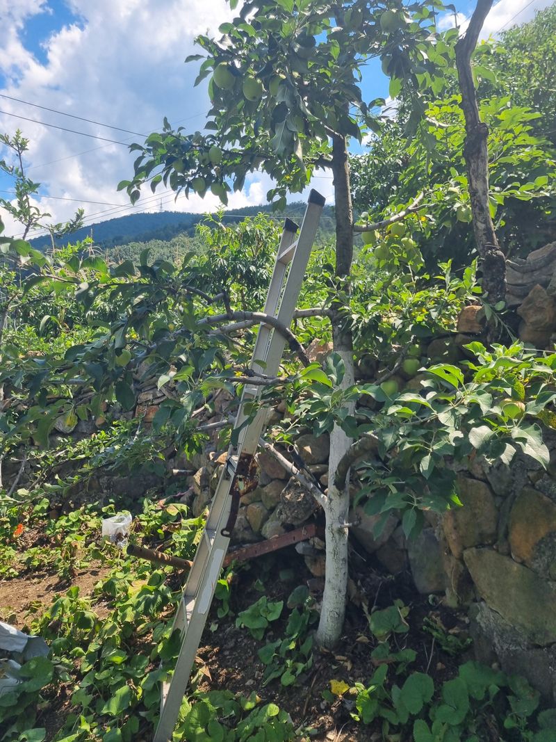 안녕하세요. 오늘은 저희집앞 도로건너 언덕위 첨부사진처럼 아예 사다리까지 동원해서 사과나무 높은 가지 까지 가지 정돈하고 햇순치기도하고 또 나무주위 잡초도 곁드려 제거작업을 하였어요.