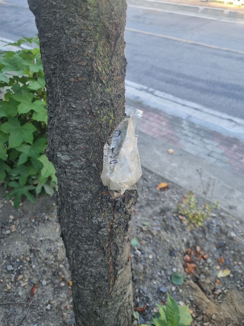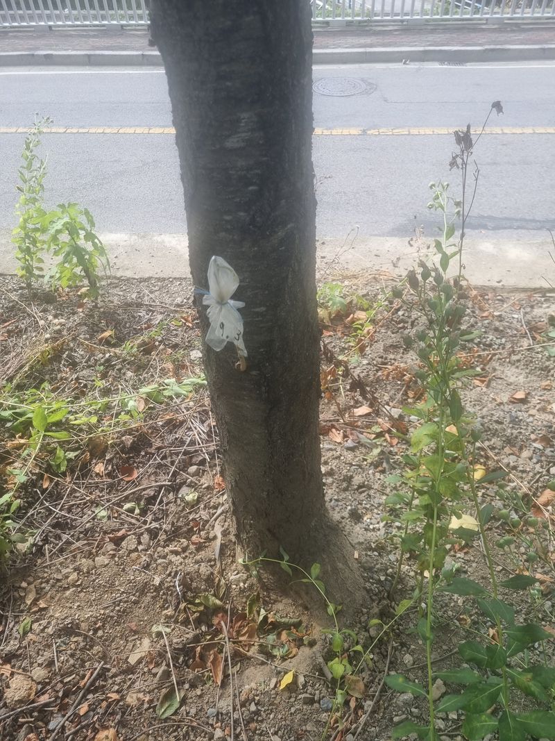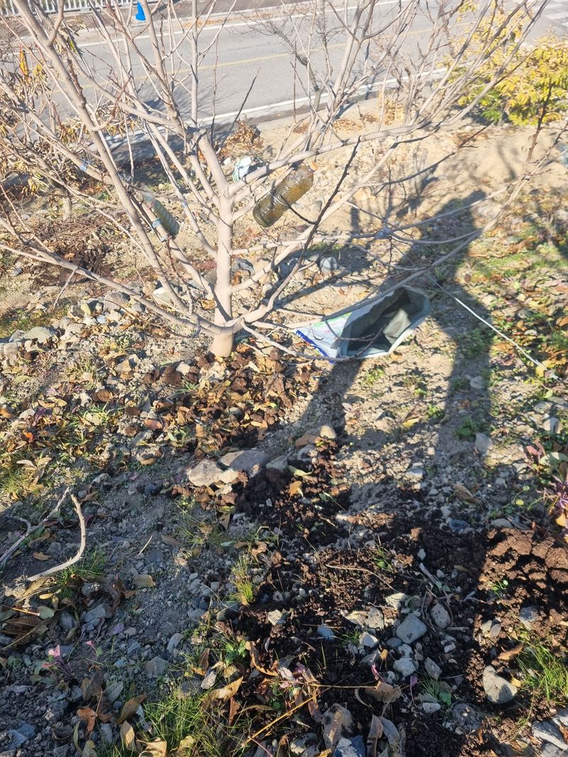 안녕하세요. 오늘도 저희집 도로건너 가드레인밖에 식재된 과수나무중(자두나무2주.헤이즐넛나무2주)병들고 허약한 나무에다 어제하던 작업에 이어서 첨부영상 처럼(주)유일에서 구입한 발근활력제50mg과 물20리터로 혼합하여 나무 주당 20리터씩 첨부영상처럼 부어 주었어요....