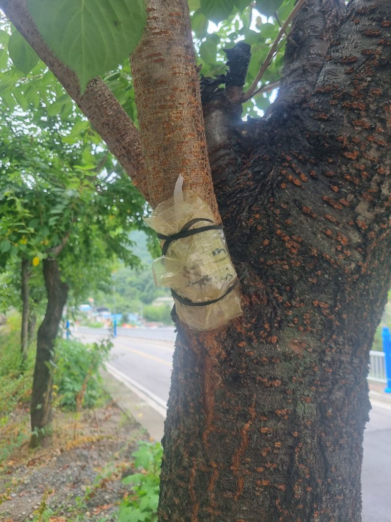 안녕하세요. 오늘은 바로 저희집앞 인도옆에 식재된 3종과수나무 원 자두나무에다 경봉복숭아나무.스위트골드살구나무.이렇듯 접목한것이 모두 성공되어 복숭아는 이미따서 맛을보았죠. 하지만 지난해 좀벌레 침입으로 저희가 댓글도 올린바 있었음니다. 그래서 작년부터 치료중이...