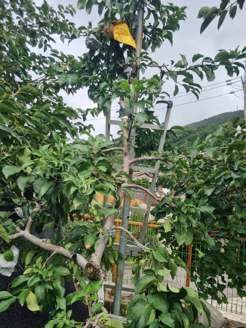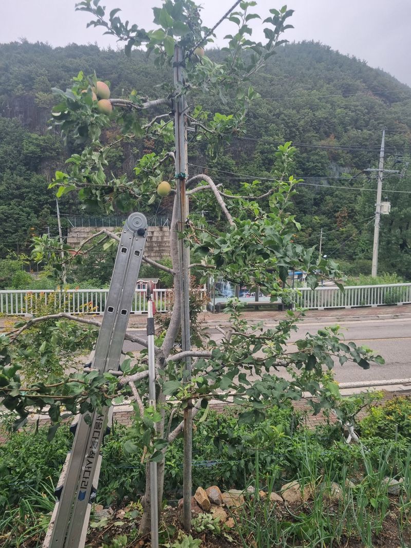 안녕하세요. 오늘은 이곳도계날씨 하루종일 비 내리다 그치다 함니다. 저희집앞 터밭 언저리에 심은 사과나무역시 사다리 대동하여서 첨부사진처럼 가지치기및 가지 유인작업을 잠시나마 비 그침시간을 이용해서 해 보았어요.