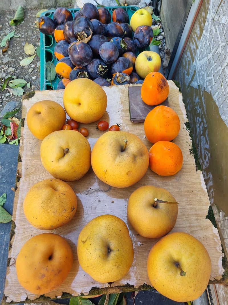 안녕하세요. 오늘 다르지역도 바람. 여기 도계날씨 태풍급 바람이죠. 하지만 저희는 감과배 구입자와의 약속했기에 나무에 낮은가지의 배 감만 따내어서 물량 준비는 첨부사진처럼 되었어요. 대신 오늘은 무리한 작업은 않하는게 건강에 도움이기에 편히 쉬렴니다.