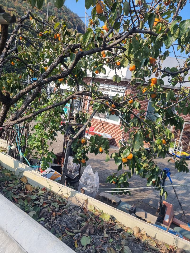 안녕하세요. 이곳 도계날씨 화창한 초가을 임니다. 저희 어제작업에이어서 저희집마당에서 대봉감따내기임니다. 오늘도 작업열심히 하였으나 흔적이 없어요. 조금쉬었다또 감따기 해봄니다. 아직도 나무에는 감이많이 매달려 있어서 몇일 더 작업하여야 겠음니다.