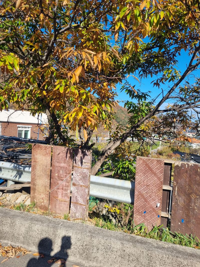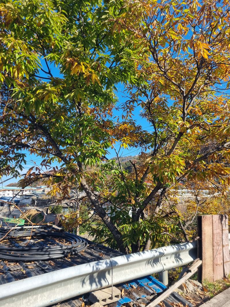 안녕하세요. 오늘도 이곳도계 완전한 가을날씨로 진행중 임니다. 저희집앞 도로건너 바로도로변에 가로수인벗나무 사이에식재된 저희엄나무 다음줄로여러과수나무 경사지로는 무장밤나무이며 언덕위에 나아가면서는호두나무로 식재되었음니다. 첨부사진처럼 저희퇴비저장소를 마련 하여...