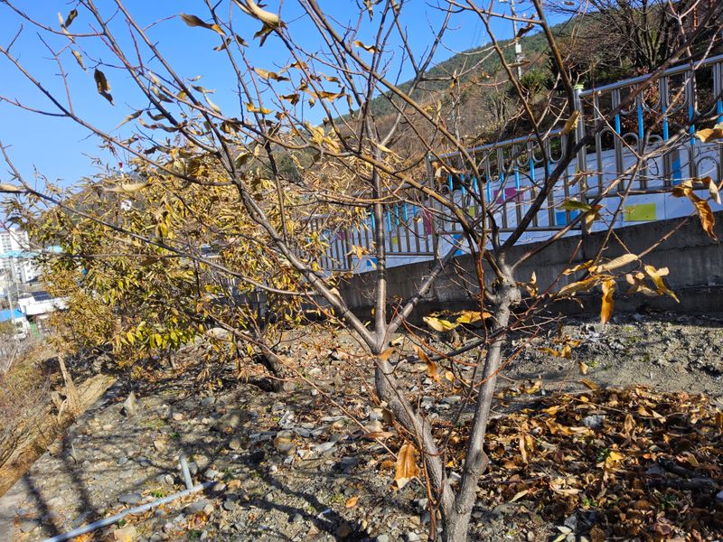 안녕하세요. 이곳 도계날씨 정상 가을날씨라함니다. 오늘은 첨부사진처럼 저희집앞 도로건너 울타리형 가드레인밖에 저희 대왕감 흑감 야오끼감 무장밤.이렇게 식재되었는데 각각 나무가지들 햇순들 정리후에 또나무주위잡초도 함께제거 정리 하였음니다. 또 밤의경우 밤송이와 나무잎...
