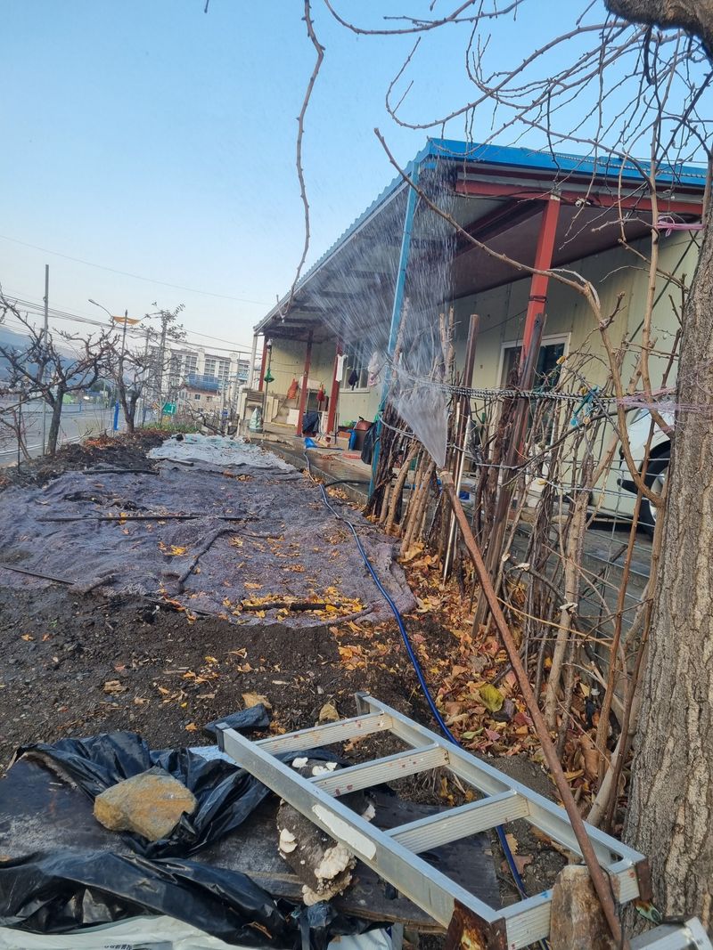 안녕하세요. 저희추운 겨울이 온다기에 저희가 이용하는 자연수도 겨울 얼어붙기전 앞마당 가장자리에다 파종한 마늘밭에 물주기작업이 어제 못다하여서 오늘아침 마무리 작업 하였음니다.(첨부사진1.) 또한 첨부영상처럼 커다란 비닐포대를 꺼꾸로 엎어 쒸운것. 그것은 저희가 지...