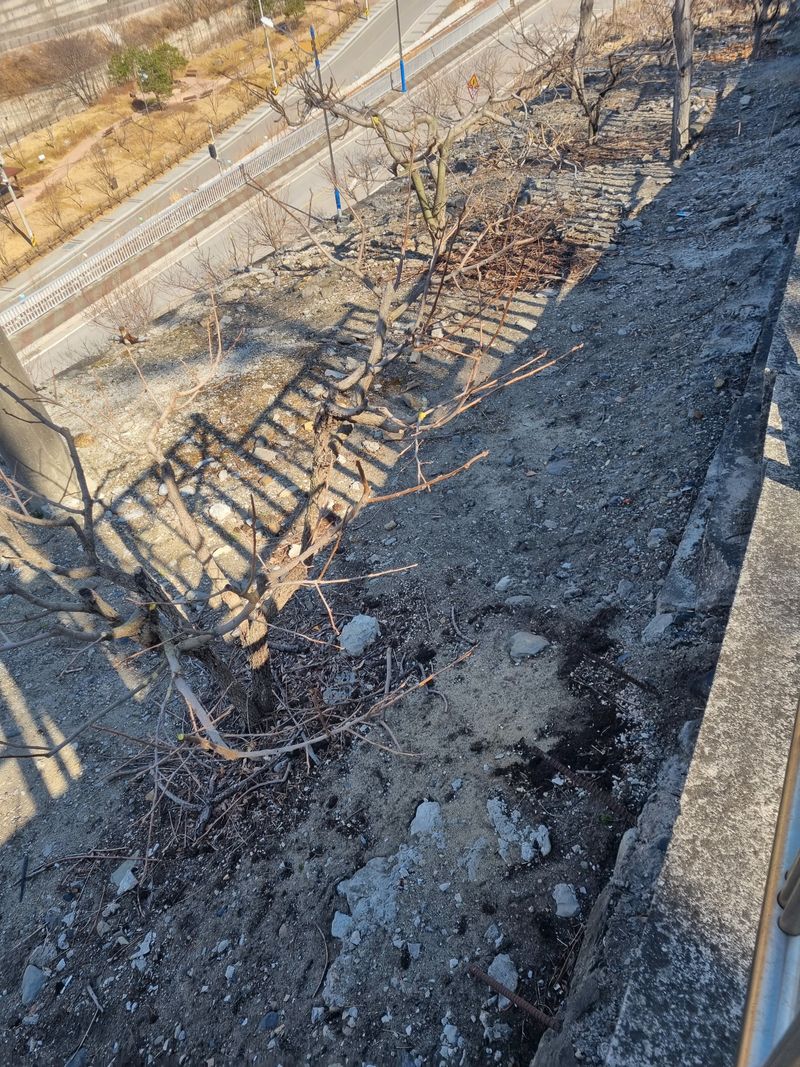 안녕하세요. 여기삼척도계 오늘종일 흐린날씨임니다. 저희집앞 도로건너. 가로수인벗남무 뒷 경사지 감.밤.평지복숭아나무 가지치기 첨부영상처럼 하였음니다.