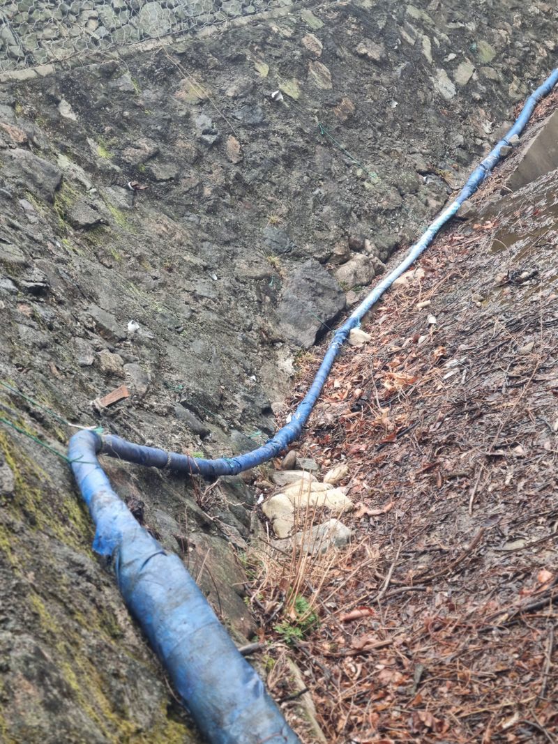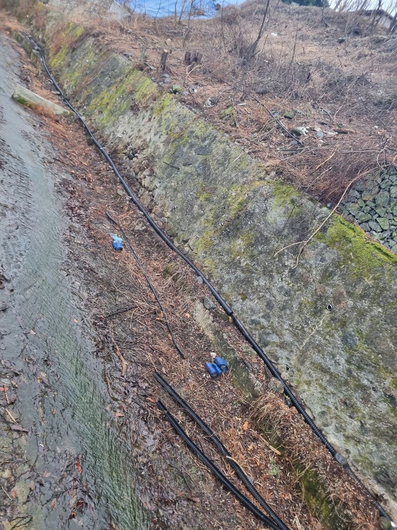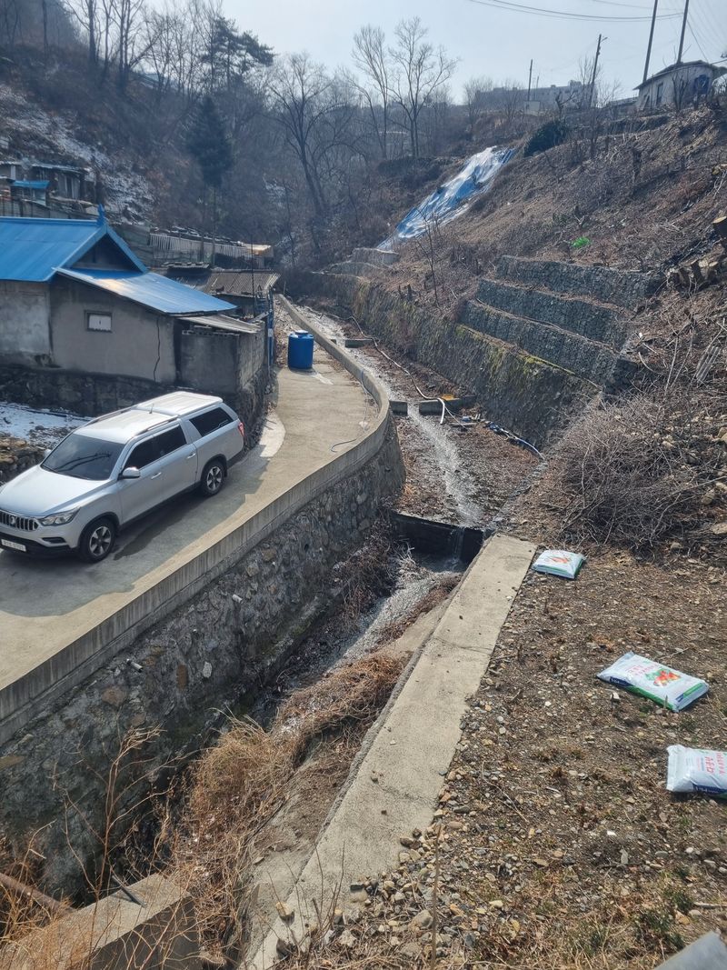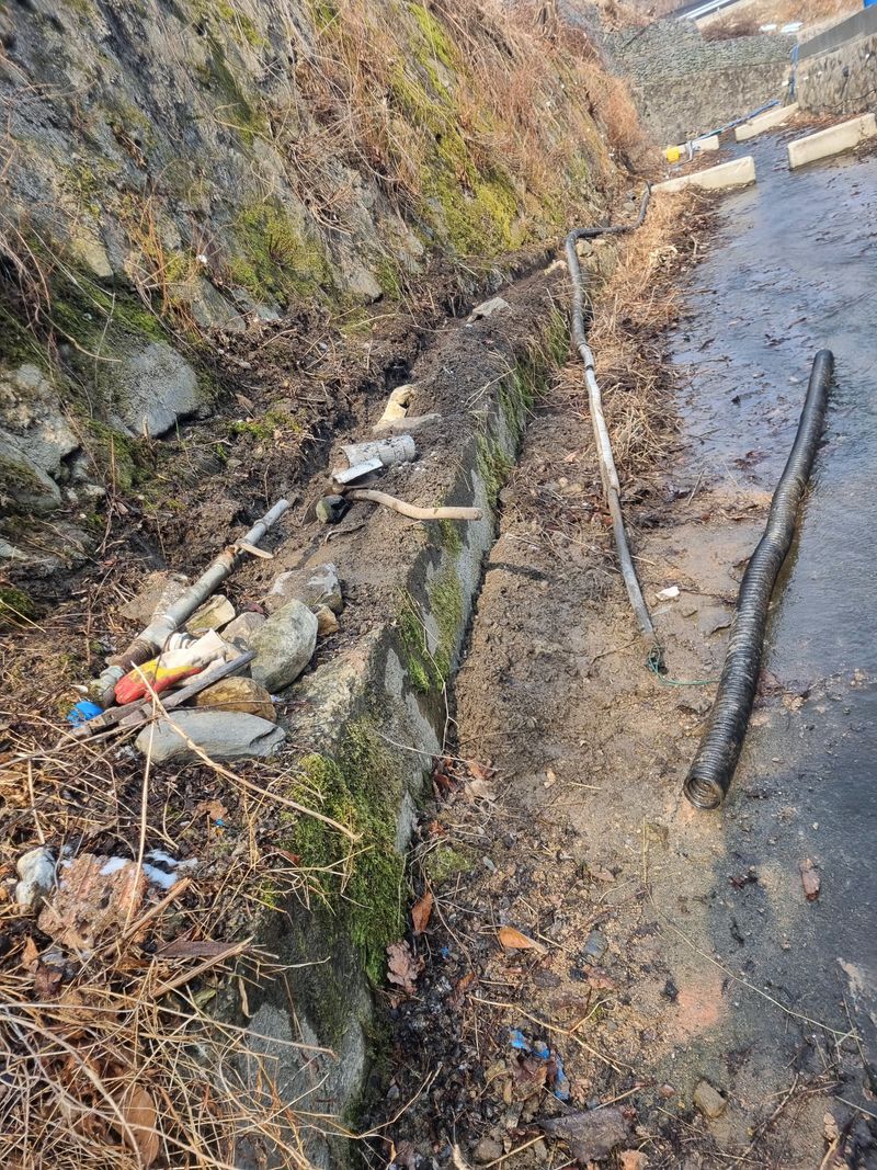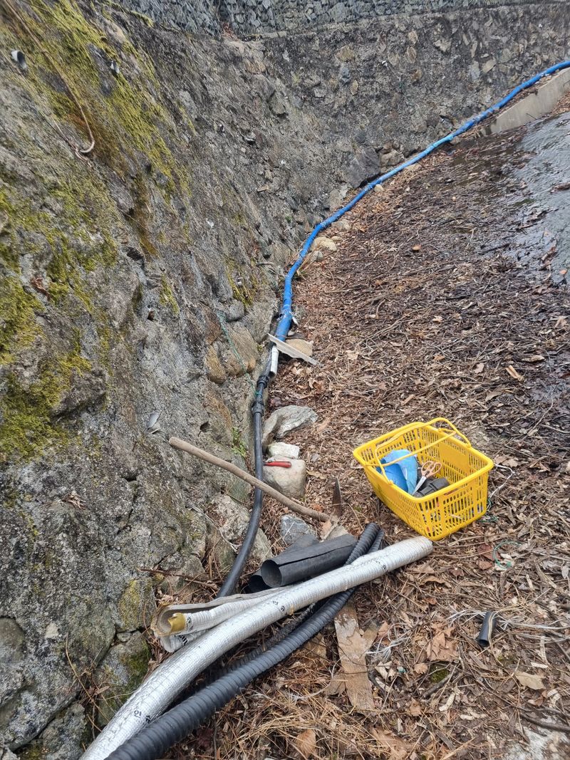 안녕하세요. 여기삼척도계 종일 눈내리다 비내리다 햇빗 비춰주다 반복 날씨임니다. 저희 잠시동안 눈비 멈춘 시간을이용하여 첨부사진처럼 어제에이어서 농수로 배관작업이안전하게된 위치엔 보온카바와 보온테이프로 마감철리후 저희집 에서 약 500m 떨어진위치에 서 또 배관...