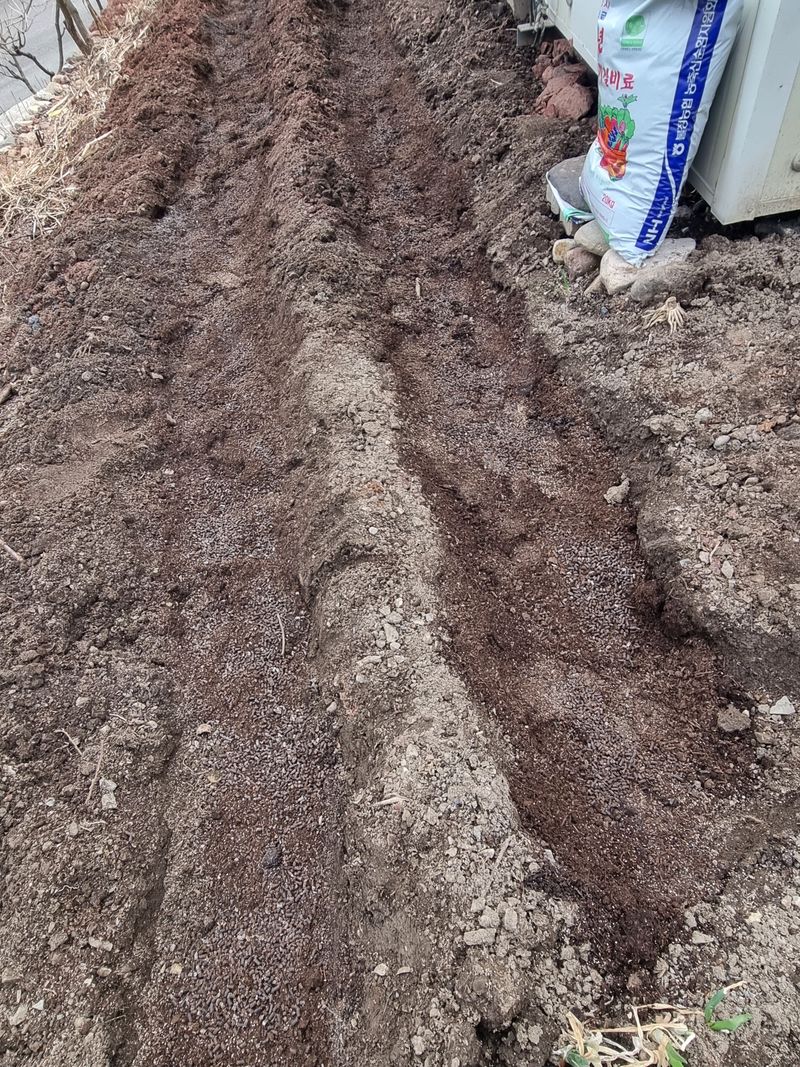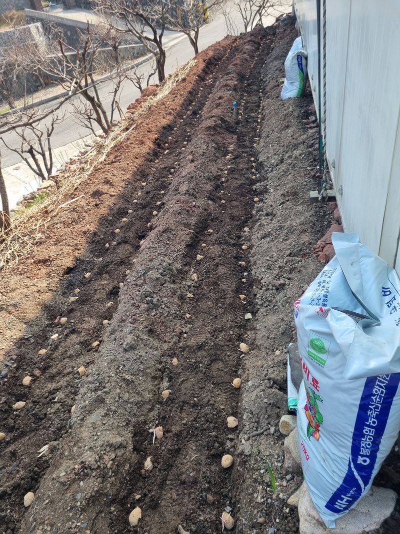 안녕하세요. 이곳도계 오늘햇빗 좋아짐니다. 오늘은 저희집 북쪽 터밭에 노지감자 파종하기위해 완숙퇴비와 토량살충제를 함께 뿌려준후 수작업하여 첨부사진처럼 고을을 만들어 보았음니다 .