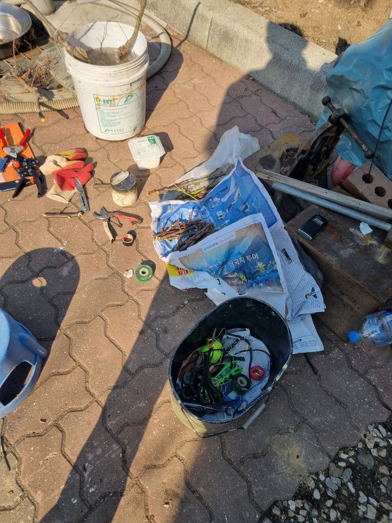 안녕하세요. 오늘은 저희집 바로앞 도로건너 언덕위 과수밭에 어제 작업에이어서 오늘도 가지치기후 잔가지까지 처리후. 우리들 팜모닝 장터에서 구입한 유인E.클립을이용 아주 꼭 필요한 부위에만 시공함에 아주 적절하게 사용하였음니다. 한편 우리들 팜 회원님들중 감...