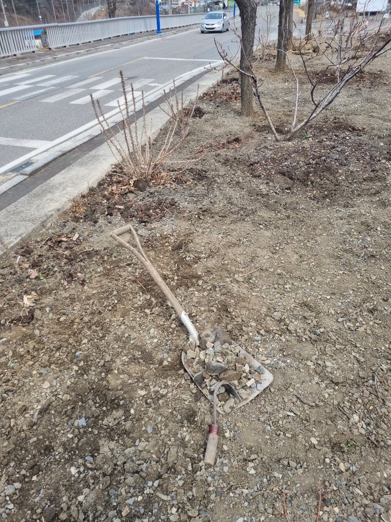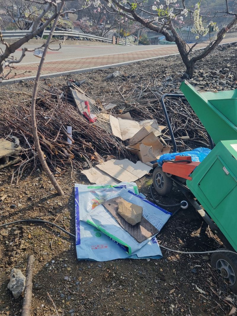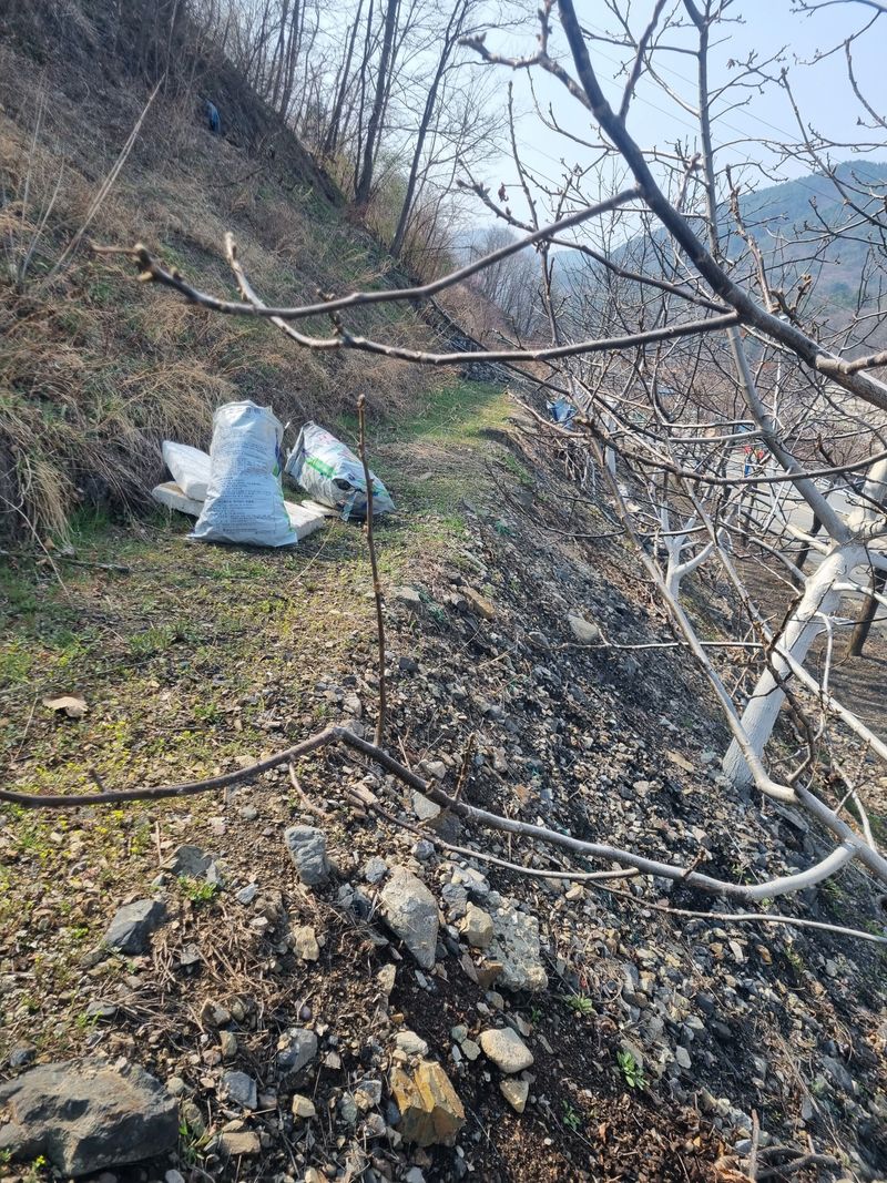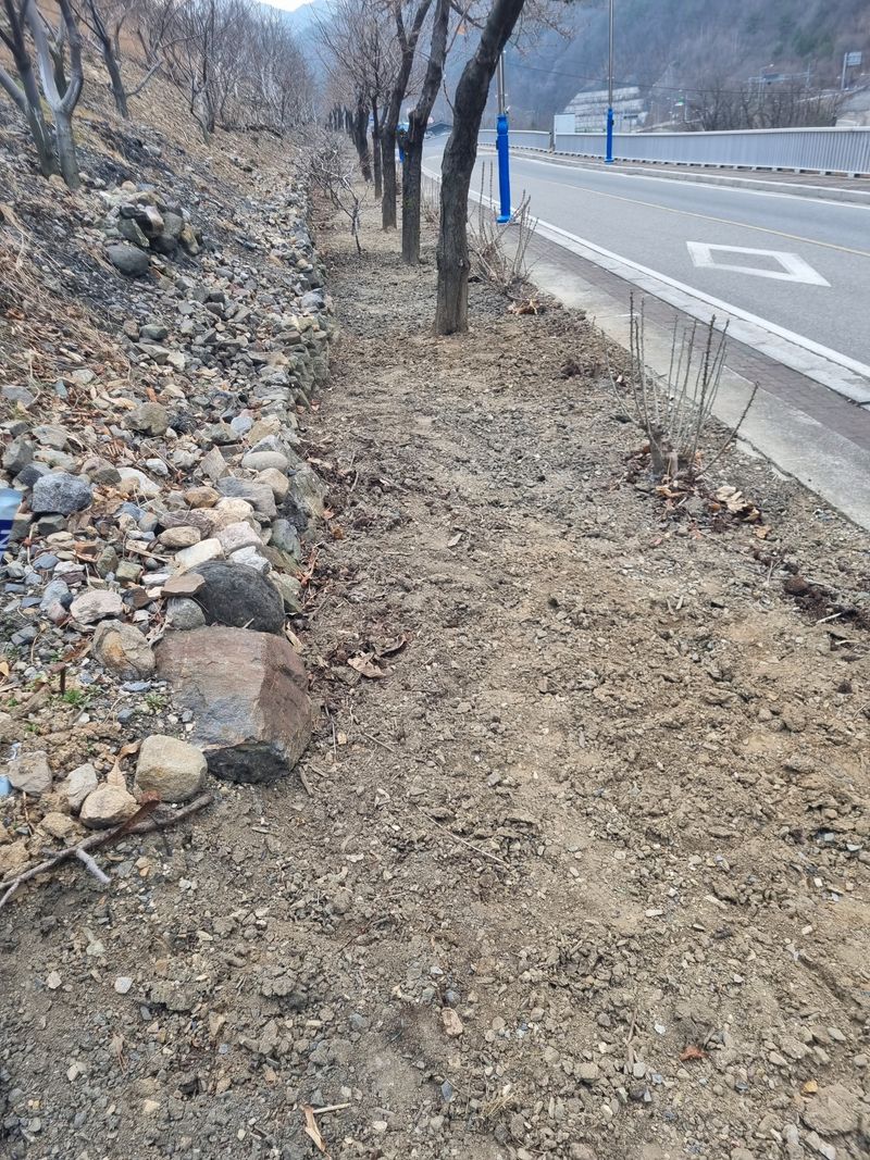 안녕하세요. 여기삼척도계 따뜻한 봄날같았음니다. 오늘은 저희집앞 도로건너 바로도로변에 가로수인벗나무 사이로 저희엄나무 사이 뒷줄 복숭아 살구스위트골드나무 사이로 잔풀.자갈 버려진 쓰레기 모두 첨부 사진처럼 제거하였음니다.