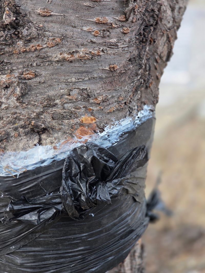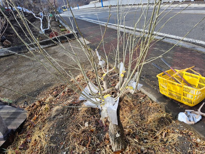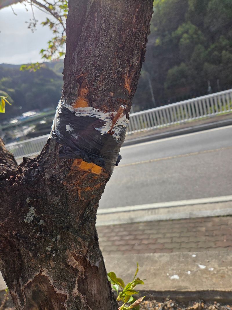 안녕하세요. 여기삼척도계 따뜻한 봄날같았음니다. 저희집앞 도로건너 울타리식 가드레인 밖에식재된 대왕감나무 흑감나무 밤나무에다 석회유황합제 칼립소 스미치온 전착제 혼합하여 첨부사진처럼 분무하였음니다.