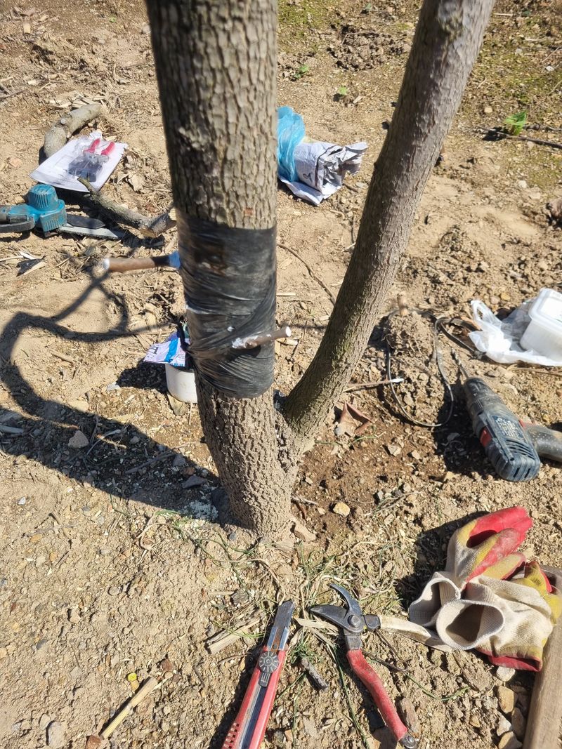 안녕하세요. 오늘도 첨부사진처럼 저희집앞 도로건너 가로수인벗나무 뒷경사지로 위로식재된 기존호두 나무에다 저희 호두 우수종자인것 보관중인 접수로 접목작업 해 보았음니다 음니다.