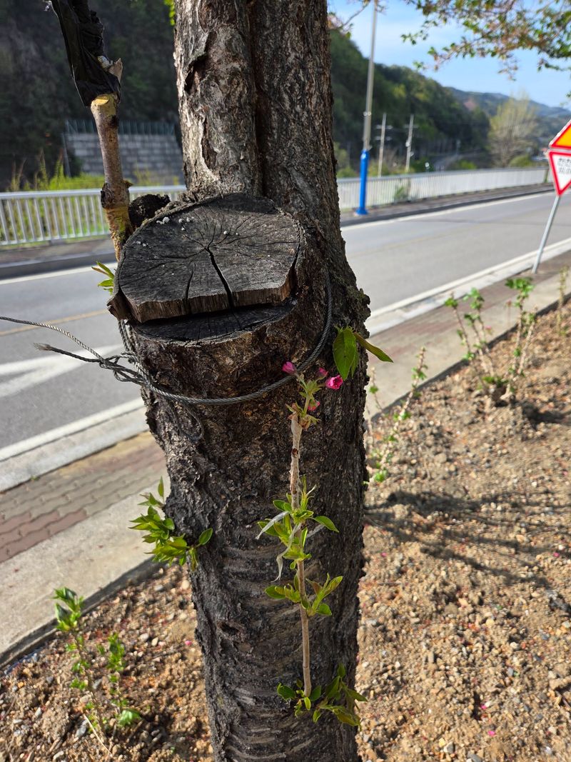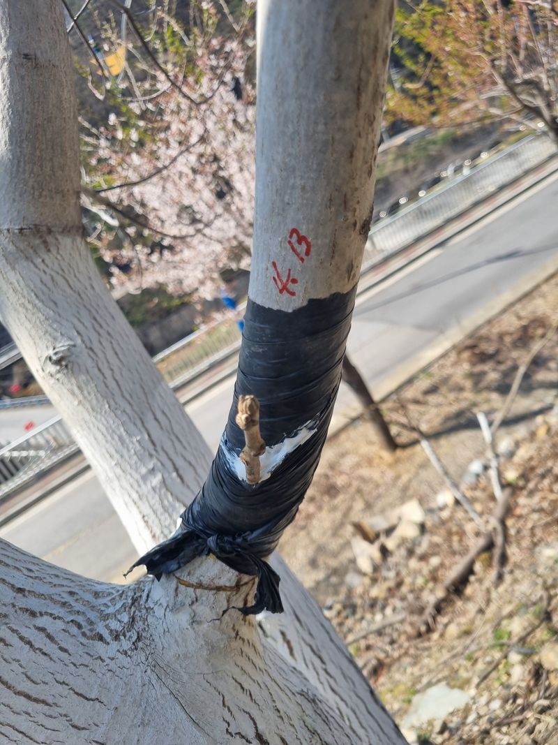 안녕하세요. 저희집앞 도로건너 삼거리주변 가장자리에다 지난해부턱. 겹벗꽃나무 겹무궁화나무를 구입하여 재배중인데 오늘 저희집주변 도로변. 일반 벗나무와일반무궁화나무에 접목코저 꽃나무가지중 적당한가지들을 골라서 채취후 잘라낸가지 양방향 모두 첨부사진처럼 톱신베스트를발라서...