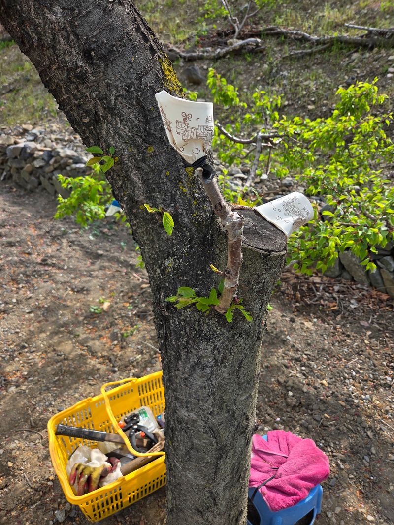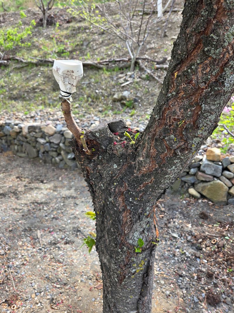 안녕하세요. 오늘은 날씨 어제에비하면 현재 우등생임니다. 저희창고옆 가드레인밖.경사지에 식재된 매실나무에다 지난해부터 복숭아 살구 자두 접목하여 이미 성공된것들은 열매 달리고 있죠. 실패된 나무는 금년도 저희 시작해 접목 중임니다. 오늘도 1주에 3종접목 하는데 ...
