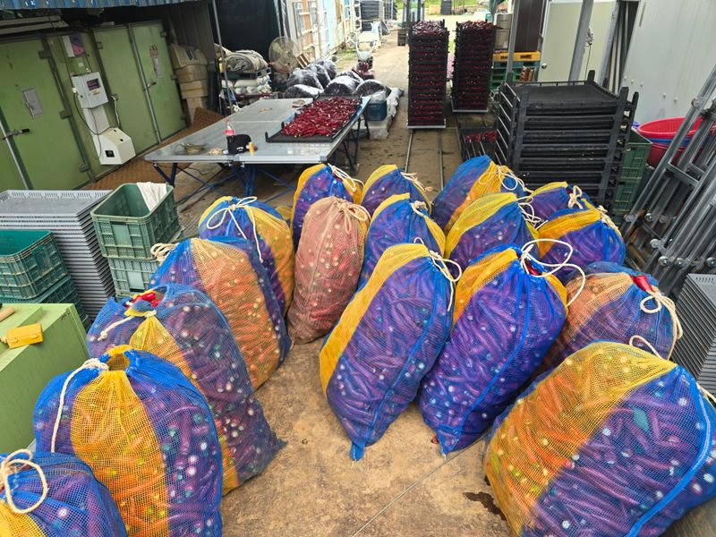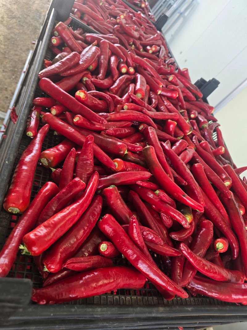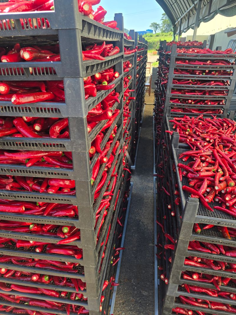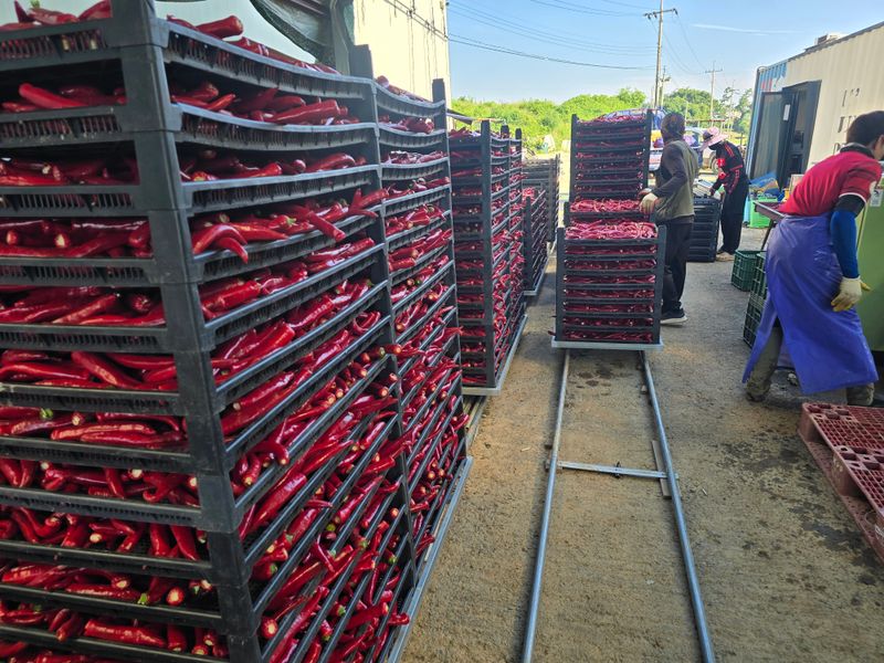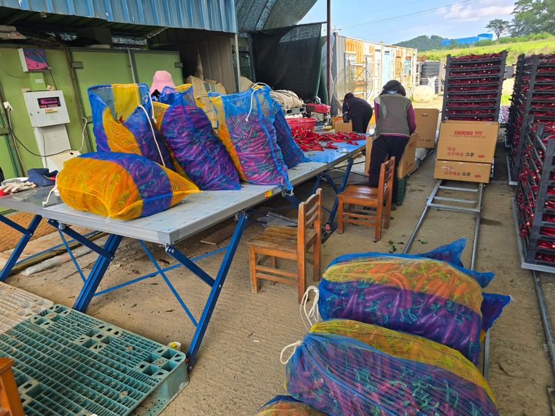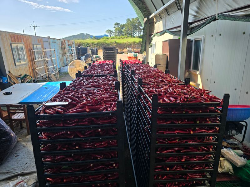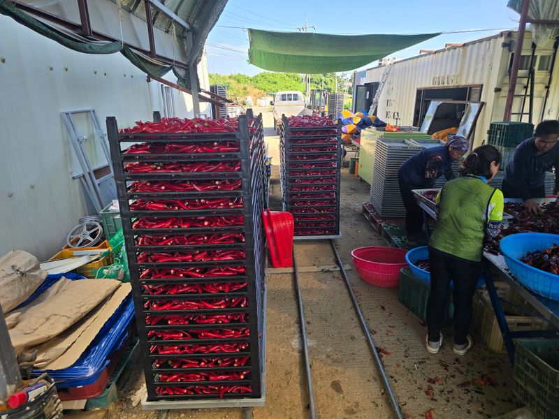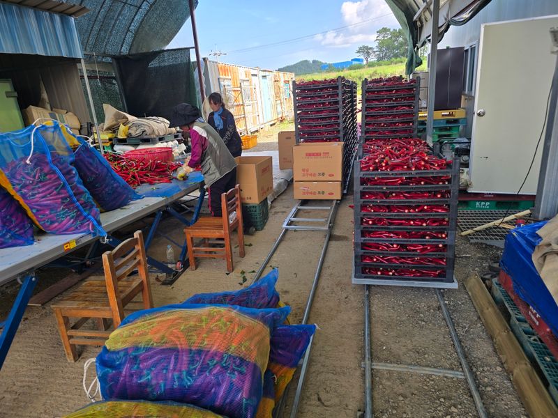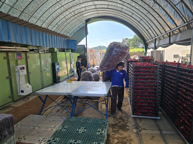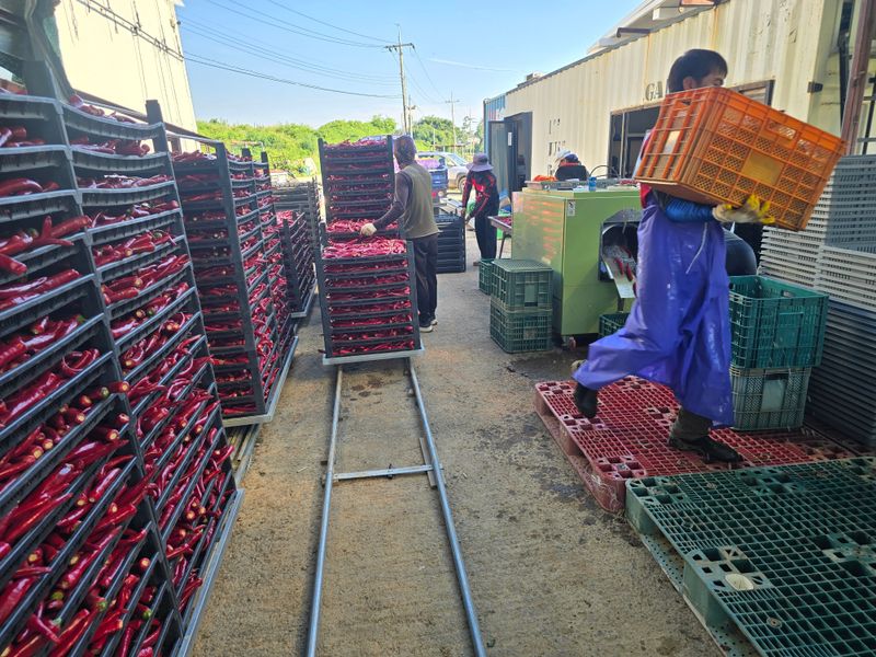 고추 수확 선별숙성작업 세척후 건조기 투입