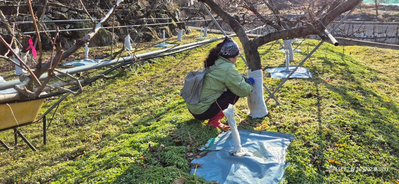 복숭아나무 주간 기부 부직포로 피복하기~~ 냉동해 피해 예방을 위해서 🍑복숭아나무에 겨울옷(주간 기부 피복) 입히기 ~~~ https://m.blog.naver.com/okjaeook7/223706016145