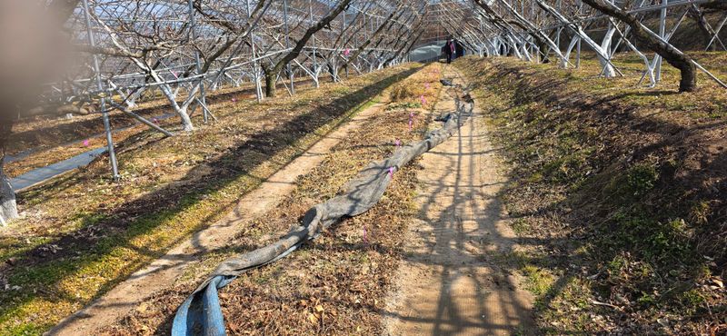 복숭아 포장에 올 처음 관수 시작... 제초매트 제거